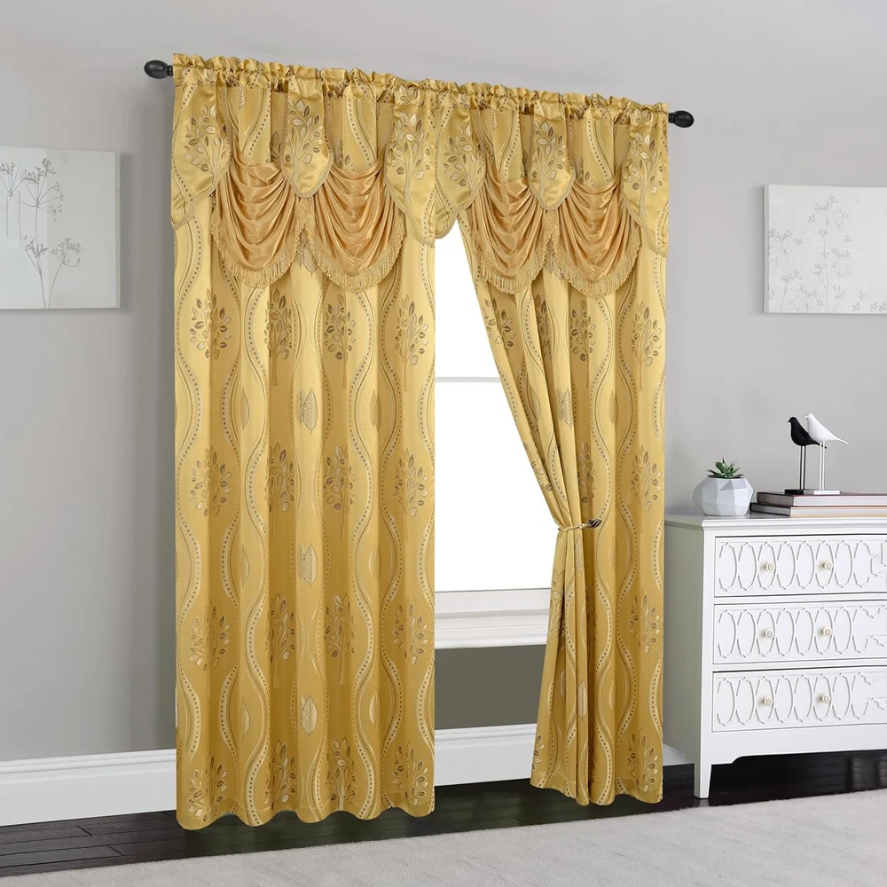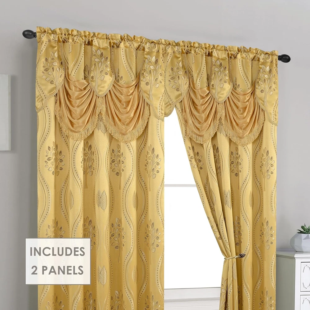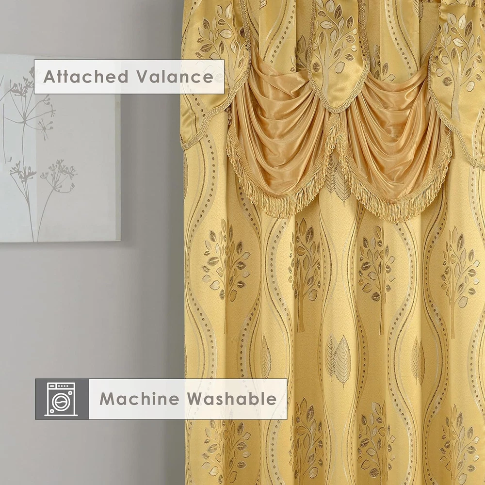 Polyester DESIGN AND STRUCTURE - Includes 2 panels. Each Panel measuring 54 inch wide by 84 inch long with 18" Attached Austrian Valance. For perfect look use one panel for every 32 Inches of your windows. Easy-to-install design featuring rod pocket style panel - HEAVY WEIGHT Material: 100% Polyester QUALITY MATERIAL: Quality and durability are what you will get with this luxury window curtain set. All fits on 1 rod for easy installation Material: 100% Polyester - Easy care machine wash and line dry Easy-to-install design featuring rod pocket style panel Hanging: These window curtains are super easy to hang with 2 inch rod pockets. ELEGANT COMFORT - We are here for refreshing your room Bring the elegance of the royal family to your home, with these jacquard panels with attached valance. Experience the luxury curtains, and beauty of one-of-a-kind these Elegant curtains - A collection of window panels that deliver both fashion and function for the home. The innovative sheer weave is designed without comprising style. Whether you are looking to enhance your existing decor or going for a complete room makeover, these luxury panels are versatile enough to enhance any space. Put these window panels to work anywhere in your home. Hang them in your living room or in the nursery or kids' room to decor your room. Hang two or more window panels on a standard or decorative rod for optimal coverage. Rods sold separately. 100-percent Polyester. Machine wash, tumble dry, do not bleach. Imported.
