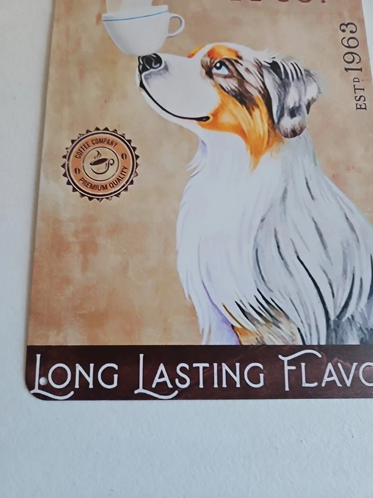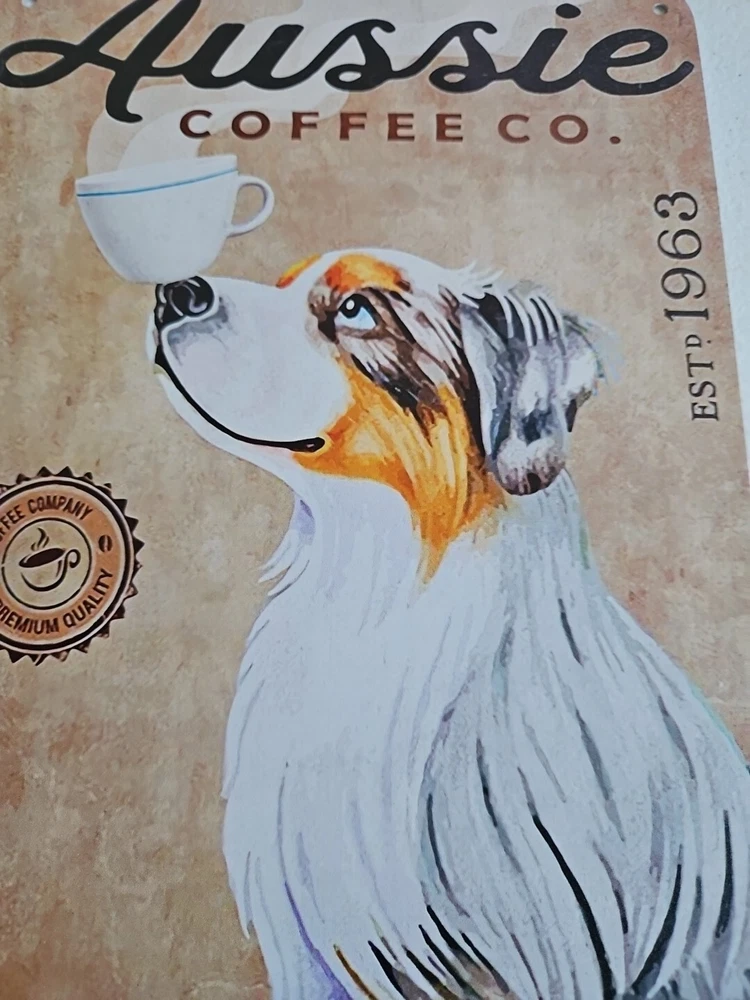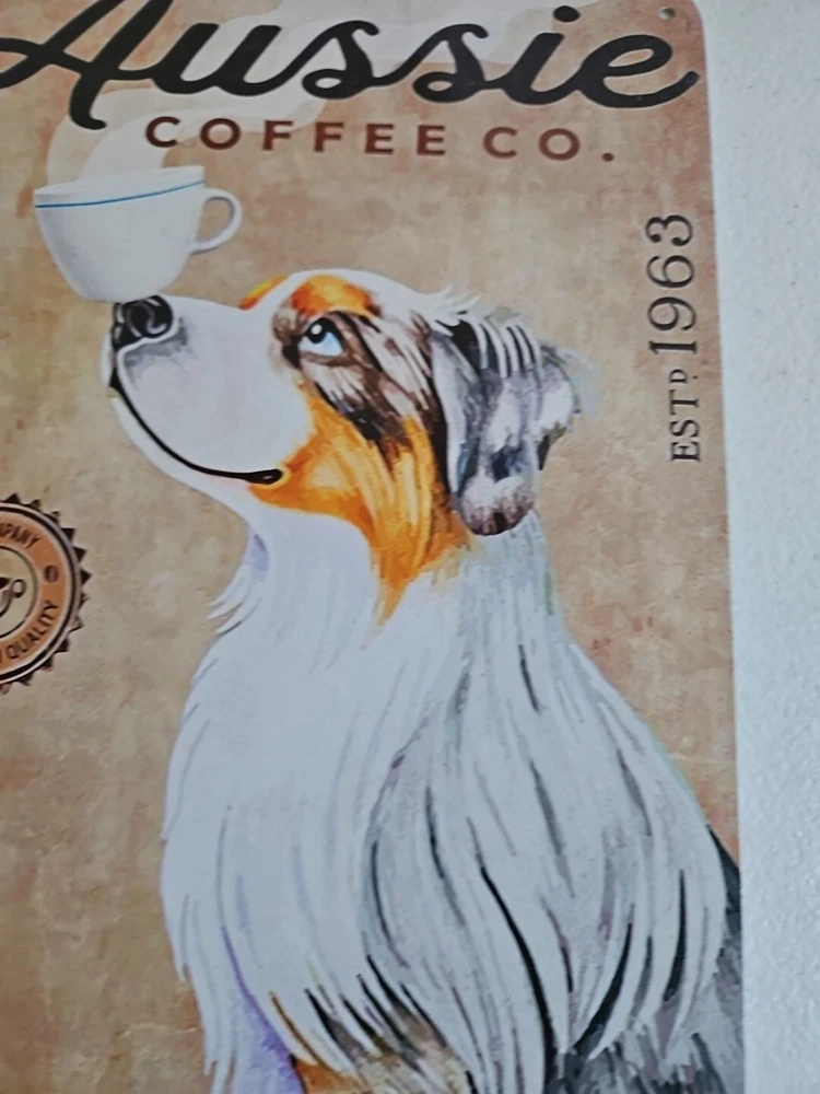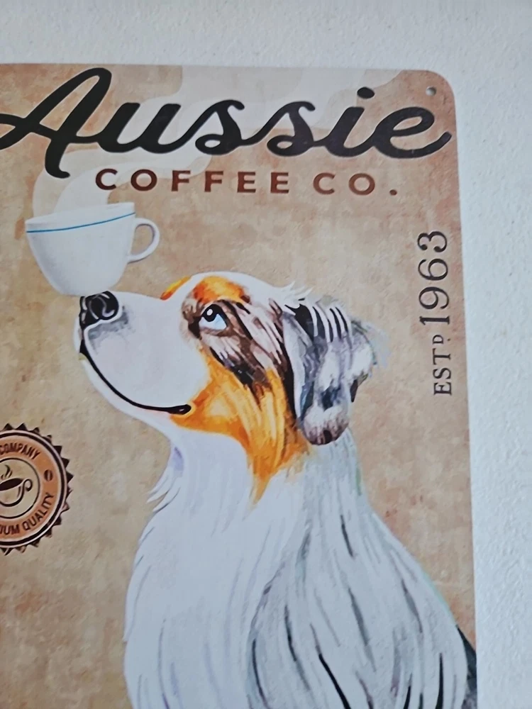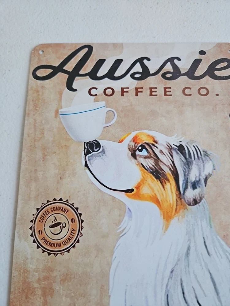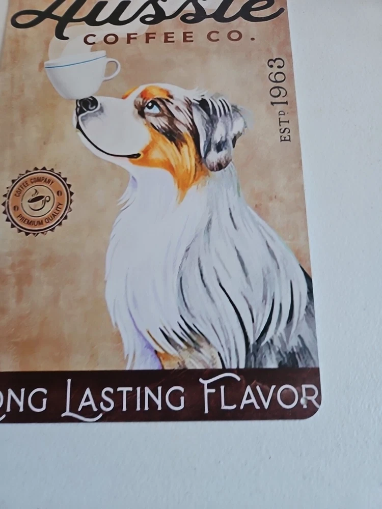 Add a touch of retro to any room with this Aussie Coffee Co. metal sign. The 8x12 inch rectangle sign features a metallic finish and a dog subject, perfect for coffee lovers and animal enthusiasts alike. It comes ready to hang and can be easily mounted on the wall, making it a great addition to any home décor. Made of sturdy metal, this sign is designed to last and has a vintage look that adds character to any space. Whether you're looking for a unique gift or simply want to treat yourself, this sign is a must-have for any coffee lover. So why wait? Add this Aussie Coffee Co. metal sign to your collection today!