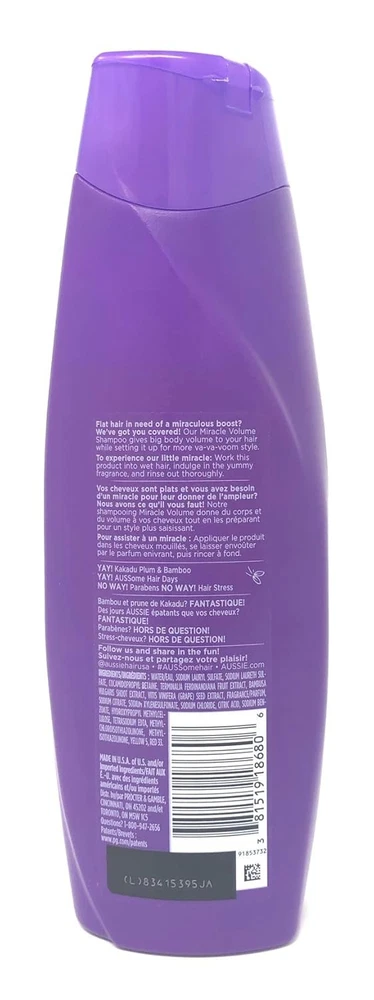 Aussie For Fine Hair, Paraben-free, W/Plum & Bamboo, Miracle Volume Shampoo, 12.1 Ounce (Pack Of 1) Add a little extra oomph to your 'do. Kakadu plum- and bamboo-infused Aussie Miracle Volume Shampoo adds body that gives your hair style lift off. And the scent? Those citrusy bright notes with a hint of florals and ocean are enough to have your head in the clouds. This big body volumizing shampoo, with a touch of Australian Aloe, Jojoba Oil and Sea Kelp, is sure to add some oomph to your do. 24 hour lightweight body. About this item Aussie Miracle moist Shampoo and Conditioner Set Helps moisturize and clean your hair as it soaks your locks in mega-hydration. Infused with avocado and jojoba oil, this amazingly rich shampoo Helps get rid of dull and dry hair leaving you with a delicious scent of luscious citrus. Apply on wet hair and rinse thoroughly. Soft, healthy hair is just a click away. With White Charcoal And Australian Kakadu Plum, Strips Hair Of Build-Up, Paraben Free Perfect for flat hair Infused with Cacadu Plum and bamboo Smells like citrus, floral and aquatic notes Free of parabens & stress The lightweight formula is infused with Cacadu plum and bamboo and easily absorbs into strands for the right amount of softness with over-the-top body. PERFECT FOR flat hair USE IT TO cleanse hair and add height INFUSED WITH Kakadu plum and bamboo SMELLS LIKE citrus, floral and aquatic notes FREE OF parabens & stress Ingredients Water, Sodium Lauryl Sulfate, Sodium Laureth Sulfate, Cocamidopropyl Betaine, Terminalia Ferdinandiana Fruit Extract, Bambusa Vulgaris Shoot Extract, Vitis Vinifera (Grape) Seed Extract, Fragrance/Parfum, Sodium Citrate, Sodium Xylenesulfonate, Sodium Chloride, Citric Acid, Sodium Benzoate, Hydroxypropyl Methylcellulose, Tetrasodium EDTA, Methylchloroisothiazolinone, Methylisothiazolinone, Yellow 5, Red 33.