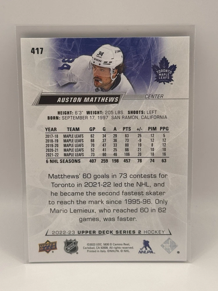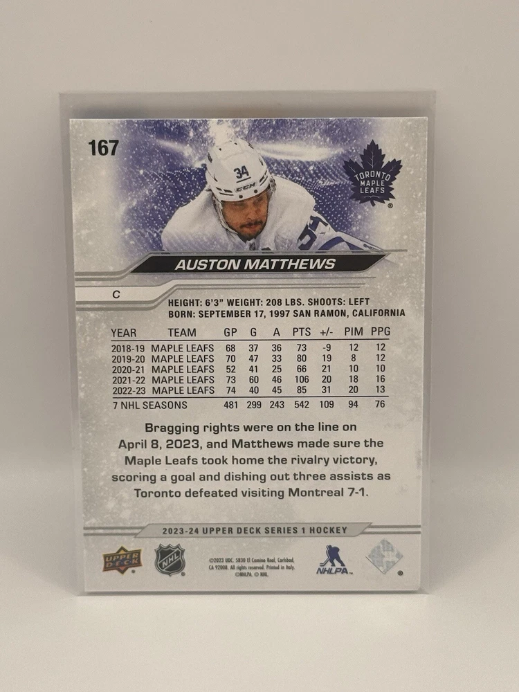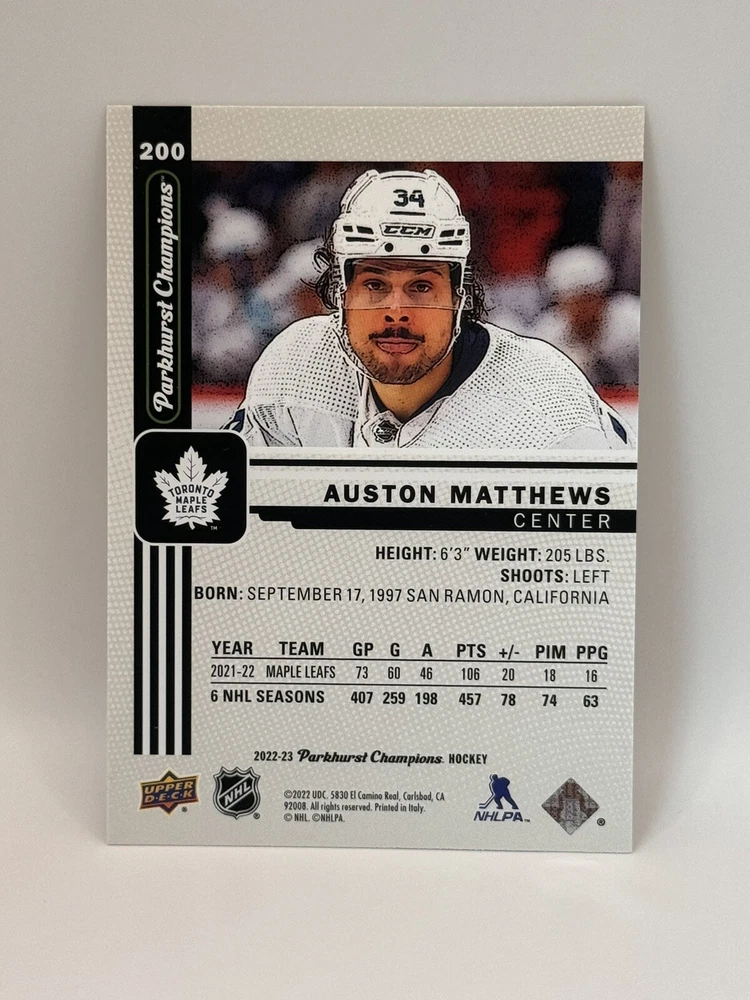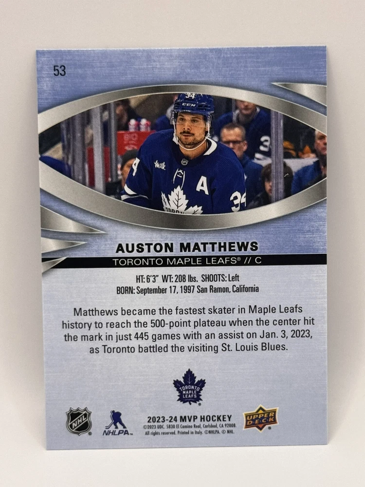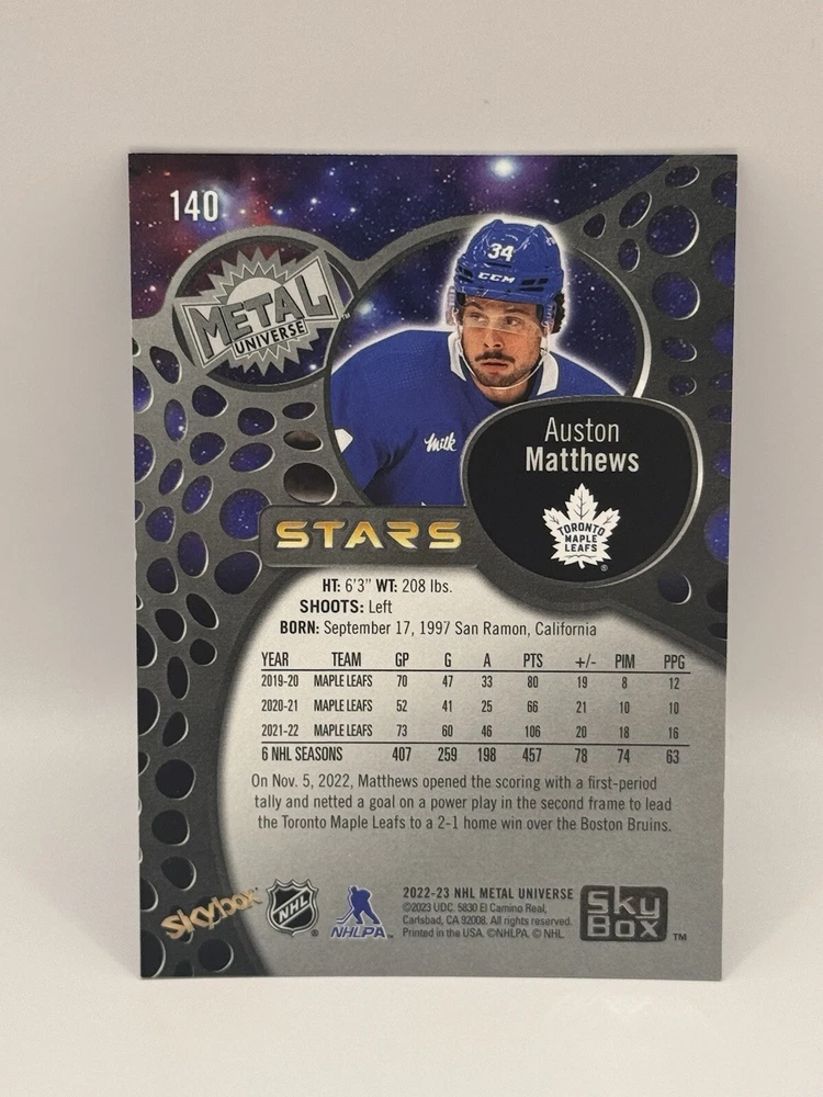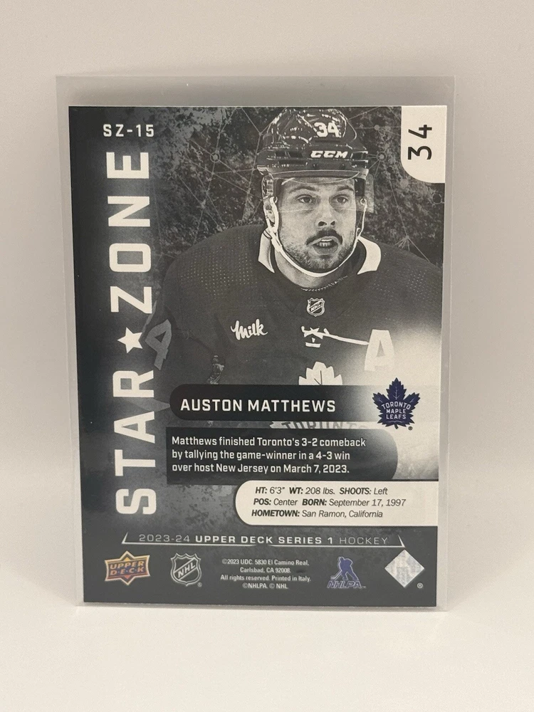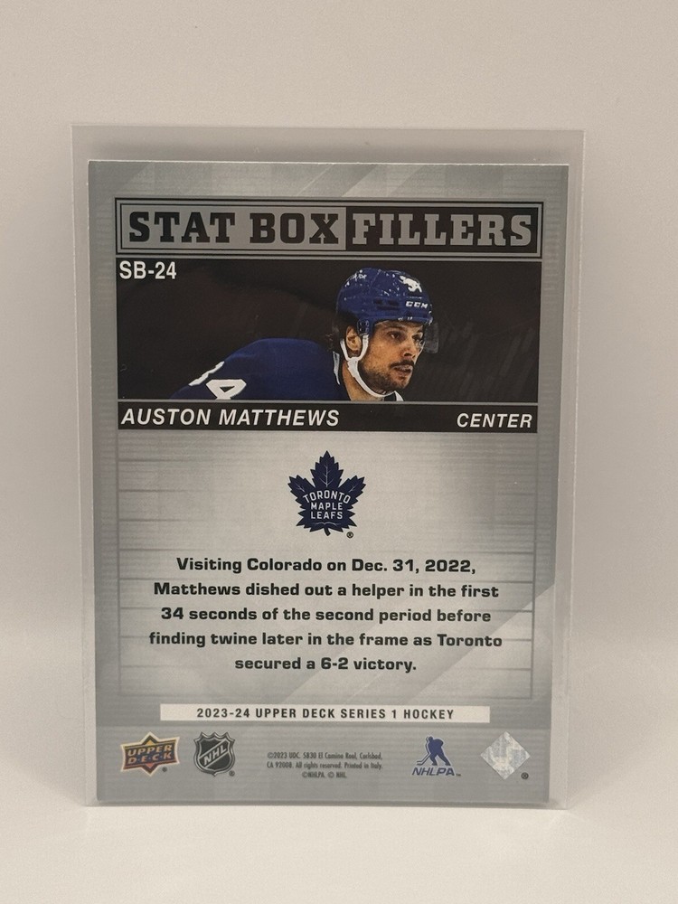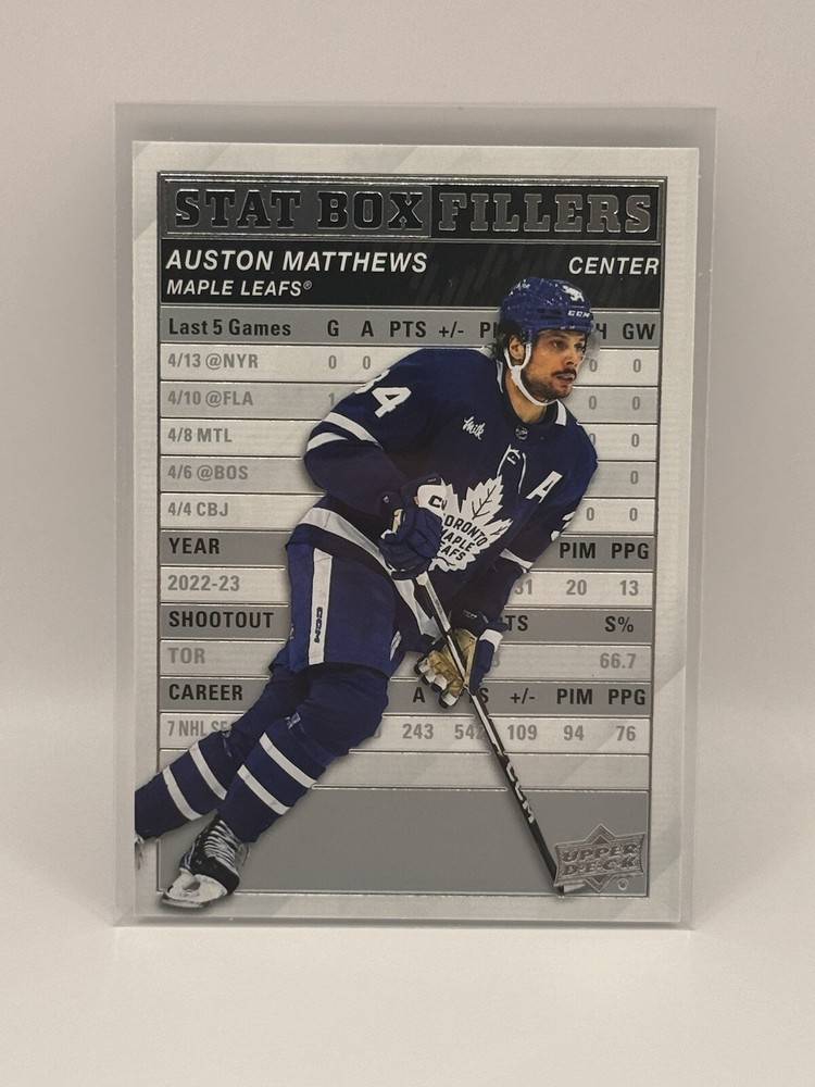 Autograph Authentication:Upper DeckManufacturer:upper deck, skyboxSport:Ice HockeyTeam:Toronto Maple LeafsVintage:NoType:Sports Trading CardPlayer/Athlete:Auston MatthewsMaterial:MetalFeatures:Insert, Base SetLeague:National Hockey League (NHL)Country of Origin:United StatesNumber of Cards:11Original/Licensed Reprint:OriginalCard Size:StandardSeason:2022-23, 2023-24