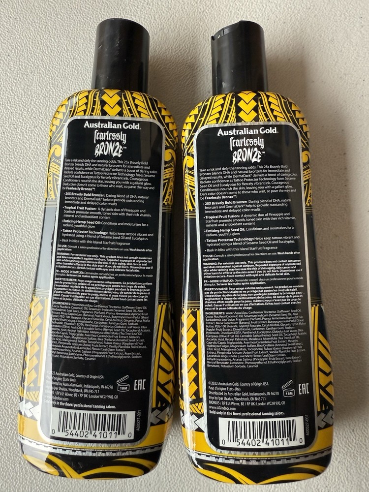 Brand:Australian GoldUPC:054402410110Type:Tanning LotionPeriod After Opening (PAO):18 MonthsColor:BrownFeatures:Animal Cruelty-Free, Hydrating, Tingle-Free, Mineral Oil-Free, Vitamins A & E, 25X Bronzer, Tattoo Color Protectiongtin13:054402410110Sun Protection Factor (SPF):SPF 0Formulation:LotionModel:Australian Gold Fearlessly BronzeSize:8.5 Oz BottleCountry/Region of Manufacture:United States