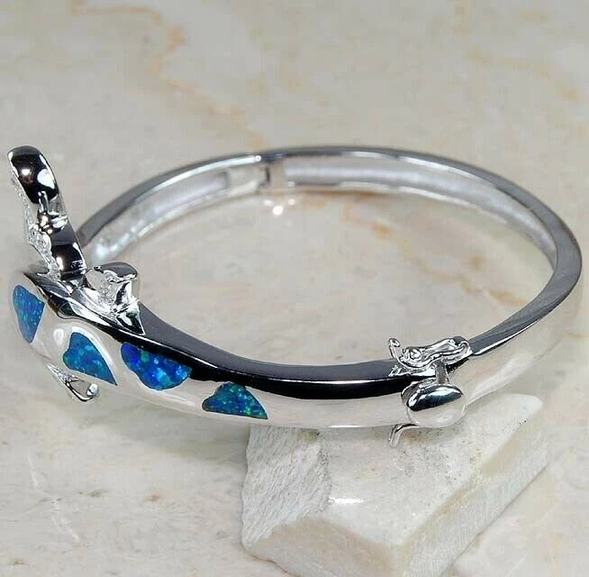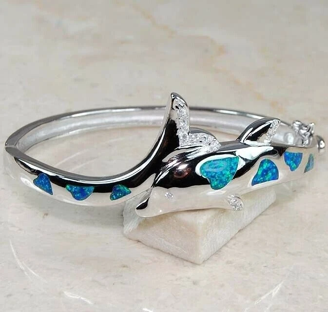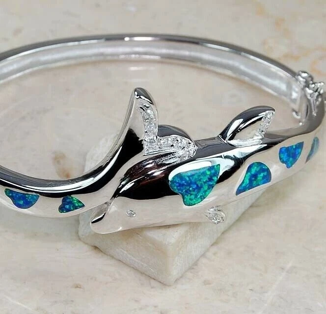 Australian Opal & Topaz 925 Sterling Silver Dolphin Bangle Bracelet OX1