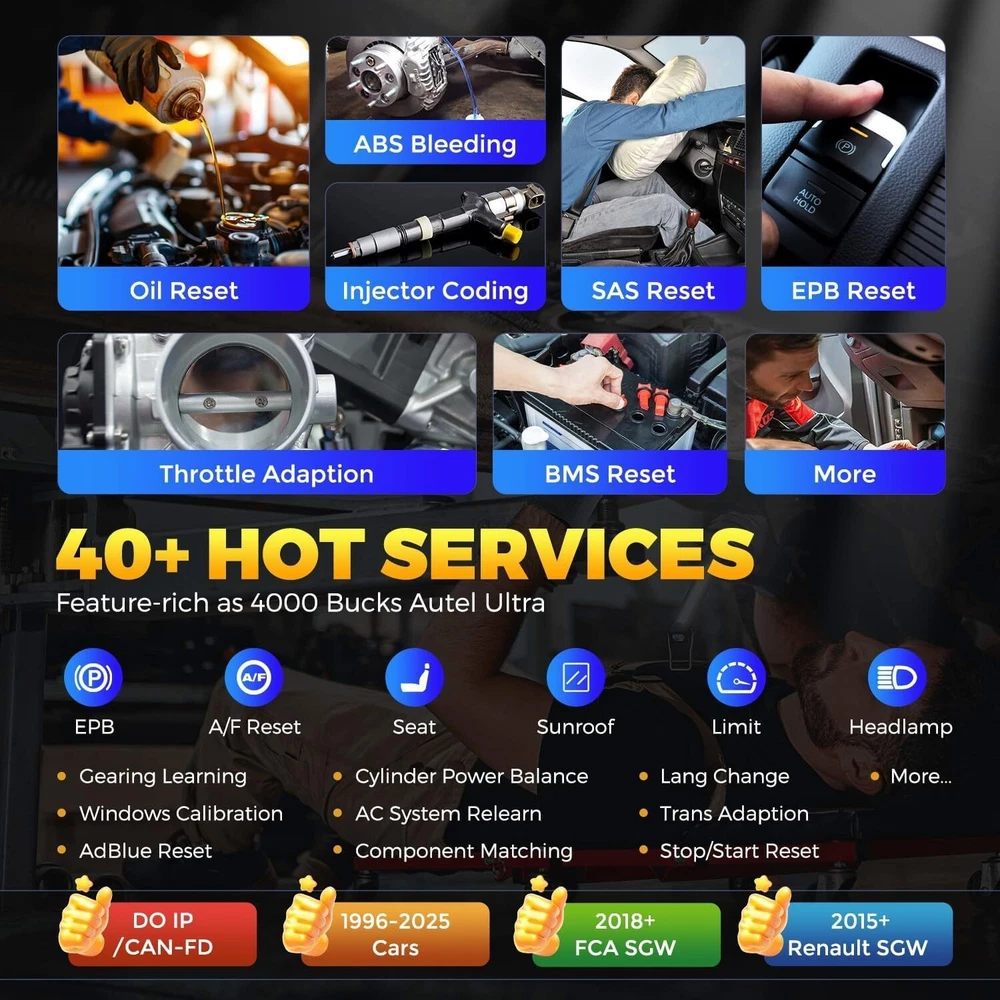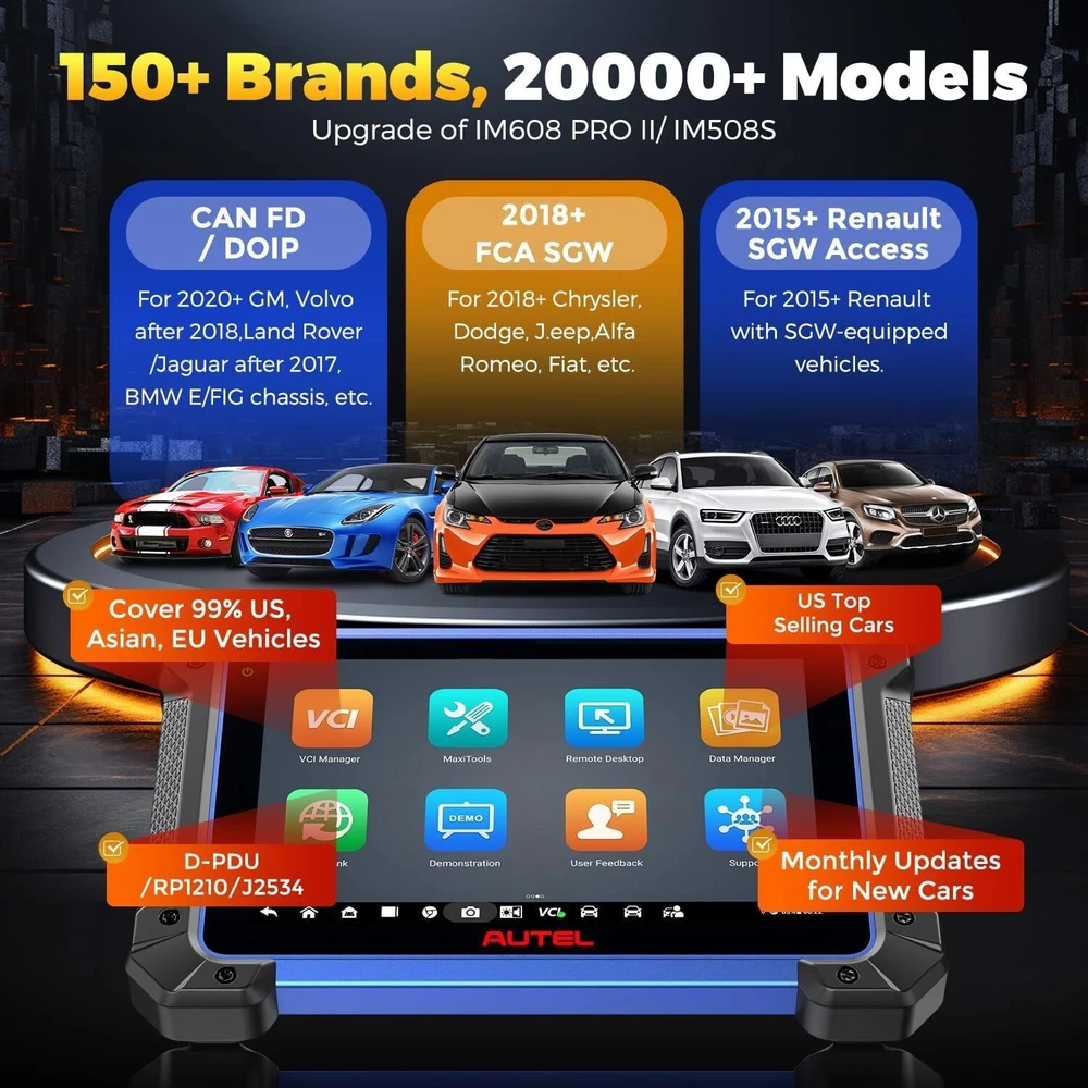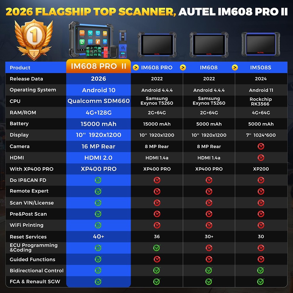 🔥BIG SALE! SAVE $100 for CODE:MOTORDIAG26FEB2 Autel MaxiIM IM608S II Key Programmer Coding Car Scanner 2in1 2026 IM608 PRO 2 motor_diag is an eBay certified Autel authorized store, we sell Autel genuine scanners, provide official after-sales service, repairs, free returns, Autel technical support (lifetime) and more. Click here to send a message to the seller and get the latest discounts! Autel MaxiIM IM608S II / IM608 PRO 2 w/ XP400 PRO Programming Tool, 2026 Global Ver. Programmer, ECU Coding as Elite II Pro, 3K+ Bidirectional Tool 40+ Services OS10 DoIP CAN FD 2026 IM608S II, New Global Ver. of IM608 PRO II Newest Autel IM608 PRO 2 IM608 S II is an ultra-fast 10.1in programming scan tool, full upgraded from IM608 PRO. It combines top IM programming, advanced diagnostics, and hot services, making it an ultimate diagnostic tool in Autel's IM-lineup. NO IP restrict, you can use it anywhere in the world. Upgraded to super powerful: 🚀Android10 🚀8-core 🚀4GB/128GB 🚀 15000mAh battery ✔️Autoscan2.0, ✔️16MP HD camera, ✔️pre & post-scan ✔️2.4&5GHz WIFI, ✔️WIFI print, ✔️QR-code share ✔️D-PDU/RP1210/ DoIP/CAN FD, ✔️ECU coding/PMI/adaption ✔️ 40+ services, ✔️ FCA AutoAuth, etc. ❗【Warm Notice】 AKL for Toyota, for Lexus, for Renault is NOT supported. Please kindly send VIN to check compatibility before order. If any questions when using the scanner, please consult us first, we will provide the most efficient resolution. 🥇【2026 IM608 PRO II Advanced Hardware】 Autel MaxiIM IM608 PRO II car scanner is developed on super faster hardware: ✅Latest Android 10 OS ✅Qualcomm SDM660 8-Core Processor ✅4GB &128GB ✅16MP Camera ✅10.1-inch Screen ✅15000mAh battery. And with supportive to DoIP/CAN FD, D-PDU/ RP1210, FCA AutoAuth, Autel IM608 PRO II can serve widest vehicles, it is the most worthwhile investment for your car repair business. 🥇【Advanced ECU Coding as MaxiSys Elite 2 Pro】 Autel IM608 PRO II diagnostic scan tool provides ECU online coding for reprogramming adaptive data in various car brands after repairs or replacements. This feature enables the disabling of unwanted features and the refreshing of hidden functions to improve car performance. Additionally, the device supports both online and offline ECU adaptation for a range of car brands, ensuring comprehensive vehicle diagnostics and repairs. 🥇【40+ Services, 3000+ Bidirectional Tests】 Autel IM608 PRO 2 escaner automotriz performs OE-Level diagnosis on all available modules to read and clear DTCs, and allows you to view live data, conduct bi-directional tests & advanced ECU coding via wireless J2534 pass-thru. Autel IM608 Pro II also supports 40+ most useful service functions, such as Oil Reset, ABS brake bleeding, SRS, SAS, BMS Reset, EPB Reset, Injector Coding, Throttle etc. 🥇【15000+ Vehicle Coverage up to 2026】 Autel IM608 PRO 2 pro automotive diagnostic scan tool can work on over 15000+ US, EU and Asian cars including 12V sedans, light trucks and SUVs, and with the latest software, 90% vehicles from 1996-2026 are covered. With the pro-grade XP400 PRO, G-BOX3, APB112 and adapters kit in package, you get the widest coverage. NOTE: You are always advised to send VIN to check compatibility before order. 🥇【D-PDU & RP1210, CAN FD & DoIP】 Autel IM608 PRO II professional obd2 scanner can work on 10000+ US, EU and Asia vehicle models to 2026. IM608 PRO II supports newest D-PDU & RP1210, CAN FD & DOIP protocols to work for GM MY2019- models and for Vo-lvo MY2018-, for Ja-guar & for Lan-d Rover MY2017-, for BM-W F/G chassis directly. 🥇【OE Level All Systems Diagnostics】 Autel MaxiIM IM608 PRO 2 auto scanner can access all electrical systems like ABS, SRS, TPMS, Engine, IC, Transmission, BCM, Chassis, Steering, Airbags, Suspension, Cruise Control etc. to perform SAME level of diagnostic and maintenance as Autel MS908S PRO/ MK908P/ MaxiSys Elite II. It enables scan all vehicle systems to read/ clear codes, view live data, freeze data frame, turn off the light to recover vehicle issues. 🥇【More Useful Features】 Autel IM608 PRO II OBD2 scanner also has more extended function: 👍Auto Scan 2.0, All Systems Scanning 15s in Average. 👍FCA Autoauth: works on Dodge, Ram, Jeep, Chrysler vehicles after 2018 without extra 12+8 cable. 👍Remote Expert 👍Print via WIFI directly 👍Upload reports to Autel Cloud 👍21+ Languages Option 👍 No IP Issue 👍Pre & Post Scan. Key Features 1. IM608S II = IM608 PRO II= IM608 II 2. No Area Restrictions, You Can Used It All Around the World without Limitation 3. 1 Year Free Update Online (After 1 Year, IM608 Il Software Subscription Official Price Cost 800USD/ Year, YOU CAN GET DISCOUNTS IF YOU BUY HERE ) 4. Upgraded Version of Autel IM608 and IM608 PRO, with the latest powerful hardware configuration 5. Smart Mode and Expert Mode Solution In One Tool to Easy Operation, Works for 95% Cars In the Wordwide, Include BMW, BENZ, VW, AUDI etc 6. Support Multi-Language : Both Diagnose Software and IMMO Software Support Multi-Language. (Default Language is English, Can Be Changed Language to German, Swidish, Italian, Portuguese, French, etc.) 7. Works for 95% Cars In The Wordwide , Include BMW, BENZ, VW, AUDI etc. make your work simple and easier, Best Choice for Locksmith and Workshop Autel IM608 Pro II/IM608S II/ IM608 il is a 10.1-inch, Android-based touchscreen tablet with advanced key and immobilizer programming capabilities, mprehensive diagnostic features, functions and tests, and an extensive service menu. The IM608 PRO II excels in key programming, supporting OBD key programming for 90% of the vehicles on the road today. Equipped with Autel's Remote Expert feature, users can connect remotely with experienced experts ready to assist with any diagnostic problem directly from their tablet. Additional key and immobilizer functions include Key generation, key and remote learning, immobilizer reset, refresh, an