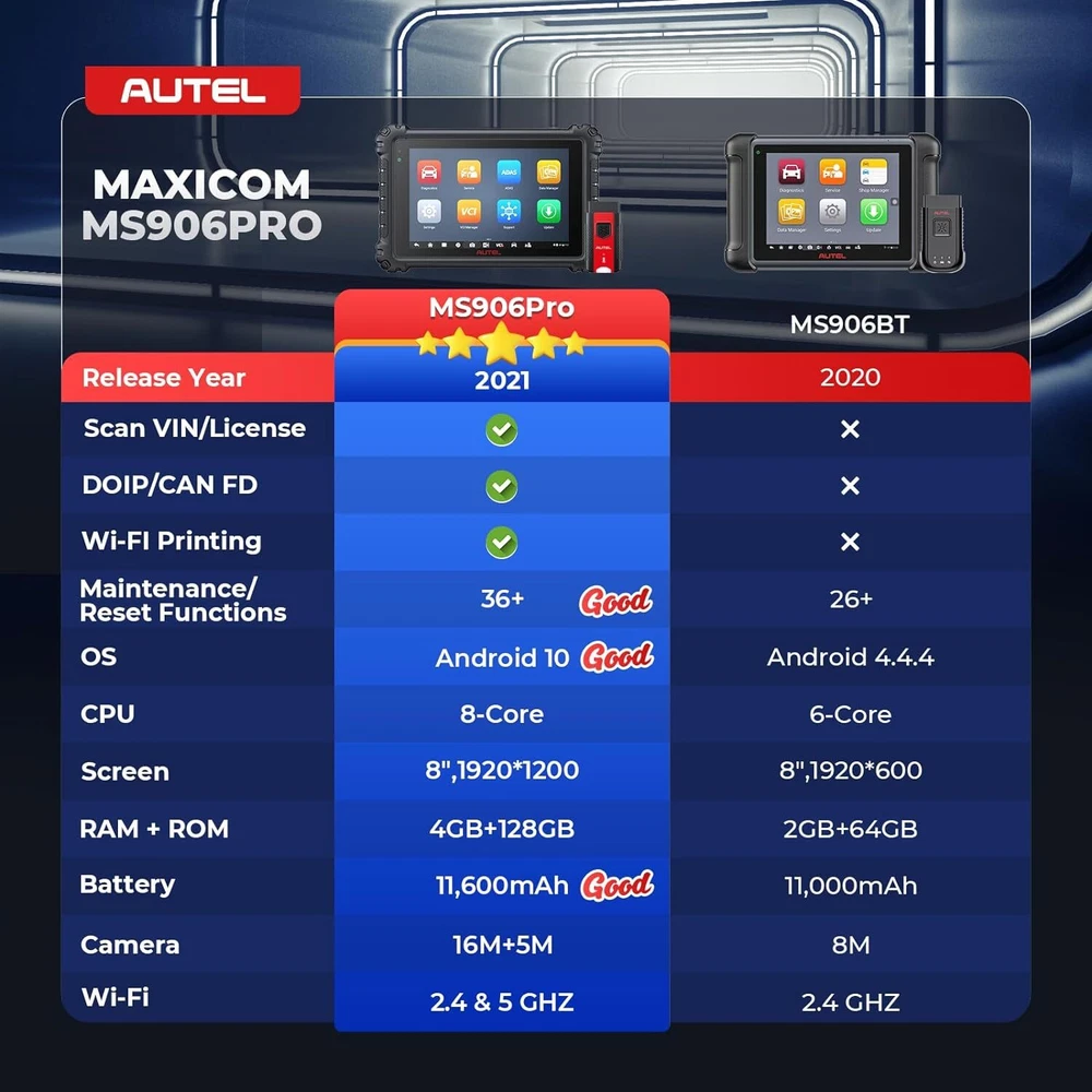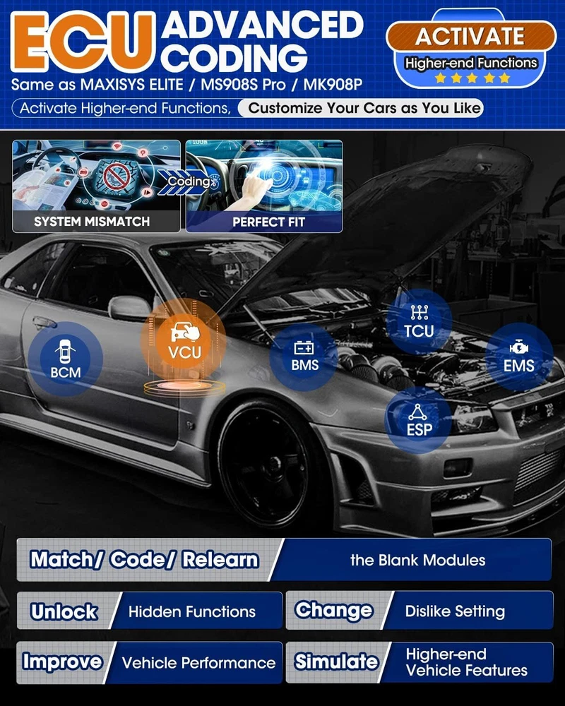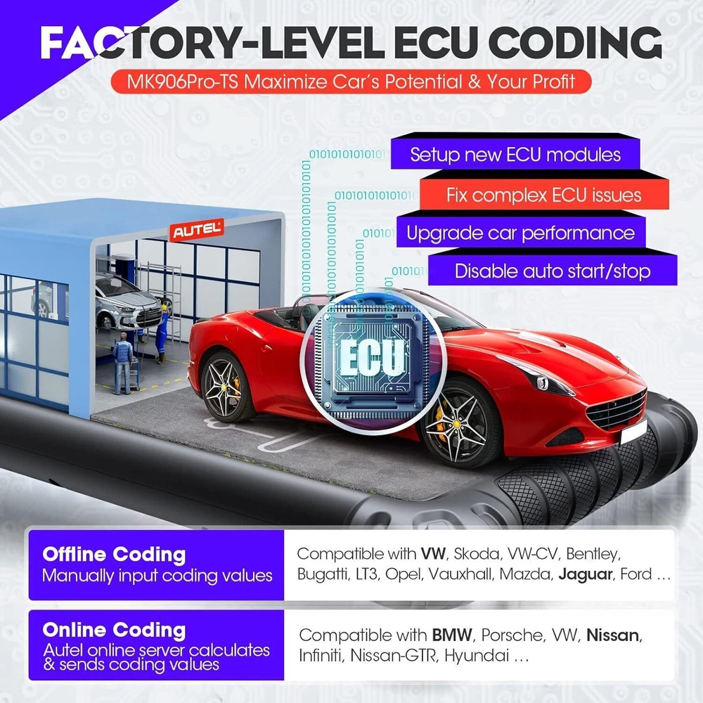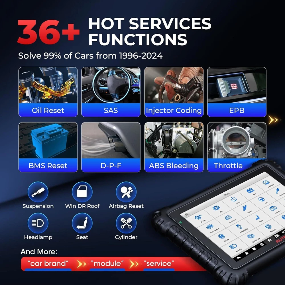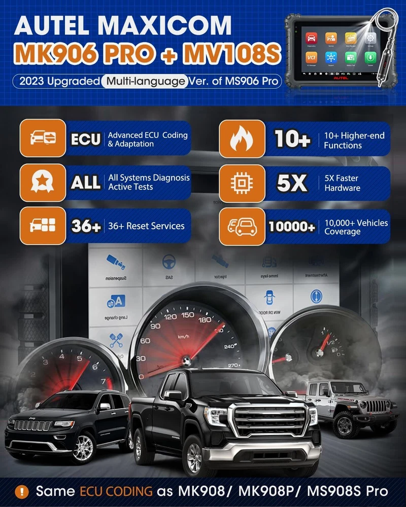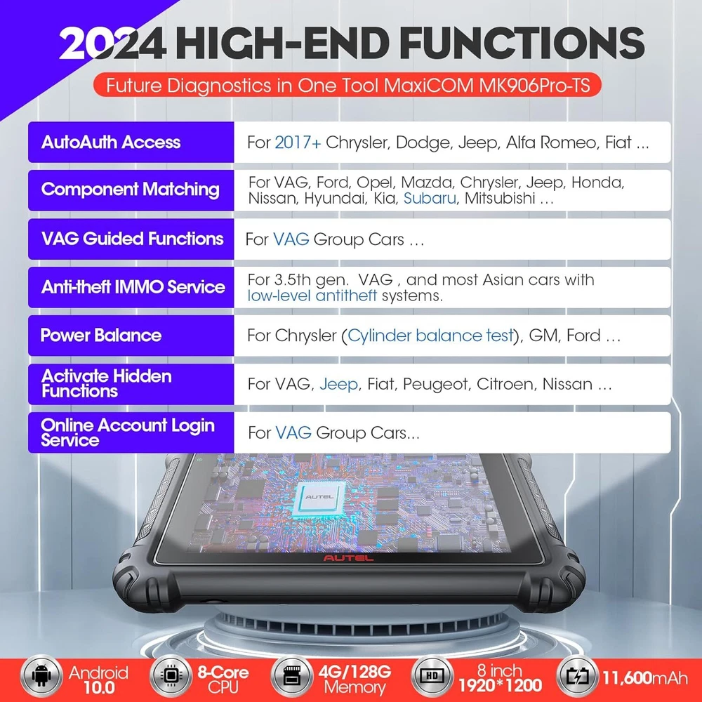 Autel Maxisys MK906 PRO-TS Full TPMS Car Diagnostic Scanner Tool Key Coding 2024 Autel MaxiCOM MK906 Pro-TS Scanner: 2024 Updated of MaxiSYS MS906 Pro-TS MS906TS with CAN FD/DoIP, ECU Coding, Full TPMS, Bidirectional Control, 36+ Service, Full Diagnose, WiFi Print, Auto Scan 2.0 ✅ Note:Multiple package options,pls choose what you want! Package option 1 : MS906PRO+MV108S ($1139) Package option 2 : MK906PRO+MV108S ($1139) Package option 3 : MK906PRO-TS+MV108S ($1349) About this item 🚗【 Ebay Choice MK906 Pro-TS, 2024 New Ver. of MS906TS】 As Autel’s most cost-effective model, MK906 Pro-TS is the combo.of MS906 Pro TS, MK908 and enjoys OE-level service: ➊TPMS Programming, Relearn and Reset ➋ECU Coding as MS908S Pro II Elite II ➌36+ Service for 150 Makes, FCA Auto Auth, Support DoIP/CAN FD & D-PDU/RP1210 ➍Active Test ➎All System Diagnosis as Snap-on Tool ➏Refresh Hidden Features ➐Component Match & VAG Guided ➑Auto Scan 2.0 ➒Battery Test ➓5X Faster, Android 11. 【 36+ HOT Services for 99% Cars 】Built to Autel’s usual high standards as automotive diagnostic scanners MS906BT, MS906TS, MS906PRO-TS, MK908 that you’re familiar with, MK906PRO TS boasts of ever-smooth processing to boost productivity thanks to the level-up core settings. It expands to 36+ service functions: TPMS, oil/EPB/SAS, injector coding, BMS, etc. and proved to be available for 99% mainstream car models based on 1000+ filed testing results. 【Advanced ECU Coding as MS908, MK908P 】Autel scanner MK906PRO-TS shares ECU Coding as MS908Pro/Elite/snap on tools to put factory-level power in your hands to break rules of a commercial-grade scanners can do: setup new ECU modules, fix complex ECU-controlled issues, compatible with VW, Skoda, Ford, BMW, Porsche, Infiniti, Hyundai … (online or offline). Rivals factory scan tools, but costs much less! 【 A Pro TPMS Tool for Tire Shops 】The top-notch combo of ALL Autel TPMS tools’s capabilities of TS408/501/508/601/608 combining with ALL pro features of MaxiSys & MaxiCOM scanners: MS906PRO, MS906TS, MS906BT, MP808TS, MK808TS, MS906, MP808, MK808 … this MK906PRO-TS is the second-to-none 2024 Autel scanner that handles all TPMS issues: Switch Off TPMS Light, 3000+ Relearn Guide, Activates/Reads All Sensors, Copy by OBD & Activation, Auto Create 1-16 Sensors, Manual Create, etc. 【All System Diagnosis + Active Test + FCA Access 】Autel keeps challenging the way of diagnostics to achieve optimal performance by integrating Bypass SGW in 2017+ FCA, OE-Level All System Diagnostics and Bi-directional Active Tests into this diagnostic tool MK906PRO, packing all factory-tool features needed with a fraction of the cost. Better, this Autel scanner lays out data the same way an OE scan tool does; a breeze to operate if you’re familiar with this setup logic. 【 2024 10+ Top Functions, Deserve Every Penny 】Equipped with ultra-level hardware, this all systems OBD2 scanner car code reader competes with OE-manufactured diagnostic tools with following 10+ top functions: Component Matching, Online Account Login, VAG Guided Functions, Power Balance, Refresh Hidden Features, Scan VIN/License and even IMMO Keys on many makes and models, for you to be more proficient at maintaining & repairing. It can work with BT506, MV105/108, MP408 to expand features. Product Description 2024 MK906PRO-TS COMPLETE TPMS WITH ALL-IN-ONE DIAGNOSTICS Car Diagnostics & TPMS in One Premium Tool Want to stay connected in the always-changing automotive world? Check out Autel who is introducing the 2024 new line of MaxiCOM diagnostic tools for your business that has never been greater! Take a look at the ultra-level features below to learn about the ALL-New MK906PRO-TS: Enhanced AutoVIN & AutoScan, PreSCAN & PostSCAN, VIN Scan (scan license/plate/VIN) for faster work process. 10+ High-end Functions: VAG Guided Function, FCA AutoAuth Access, Component Matching, Online Account Login Service, etc. VCI200 box supports CANFD, and DOIP protocols, also serves as a wireless VCI. 36+ service functions with more frequent updates to support more vehicles. OE-Level All System Diagnostics to read/clear codes for all available systems Bi-directional Scan Tool runs Active Tests to test car components on demand; Advanced Online ECU Coding & Adaptations brings more personal settings. Pro-TPMS Tool to Fix 99% TPMS Problems Overall by TPMS function: MK906PRO-TS > MS906TS > TS608 > MP808TS > MK808TS Activate 99% TPMS sensors and read sensor status; Diagnose ECU for complete TPMS health check; Program MX-Sensors in 4 ways; On-tool 3000+ relearn procedure and wide OBD relearn coverage, Access to retrofitted-TPMS system … Overall by function: MS906 Pro-TS = MK908 = MS908 = MS908S Pro > Elite = MS906TS > MS906 > MP808TS > MK808TS 2024 MK906PRO-TS COMPLETE TPMS WITH ALL-IN-ONE DIAGNOSTICS Essential TPMS Service Tool in Your Toolbox Equivalent to car tool MS906PRO +tire monitoring system diag TS601, the Autel MK906PRO-TS is a great combination of an ultra-level automotive scanner + TPMS service tool. If you are after a car computer that can also be a professional TPMS expert to activate OE & OEM sensors with built-in relearn procedures, program Autel MX-sensors, turn off TPMS light, and retrieves the sensors’ OEM part No … then this scan tool will do just that. equipped vehicle coverage: well-suited to mechanics in auto repair shops working on a wide range of cars. Powerful TPMS Activation Tool: activate all kinds of OEM & universal 315MHz + 433MHz sensors on the market. Effective TPMS Relearn Tool: easy automatic, stationary or OBDII relearn with 3000+ built-in TPMS relearn guidance. Autel MX-Sensor Programming Tool: get access to, copy old sensor ID, and write data into MX-Sensors; 4 programming ways: Copy by Activation; Copy by Manual Input; Auto Create 1-16 in batch; Copy by OBD. At-A-Glance TPMS Status Screen: display all sensors’ pressure, temperature, battery life, and sensor/ECU data to quickly 