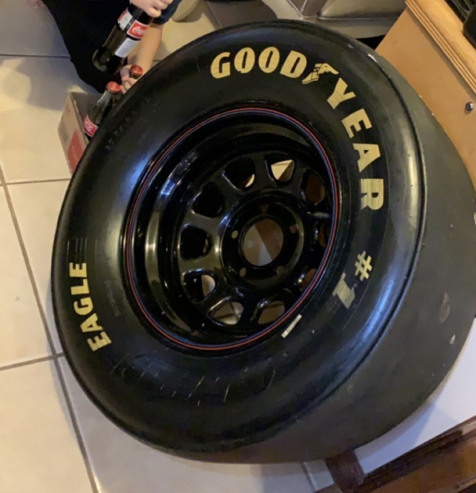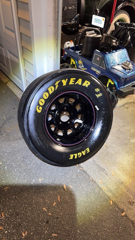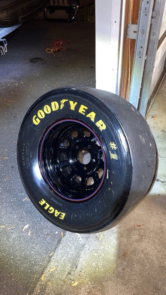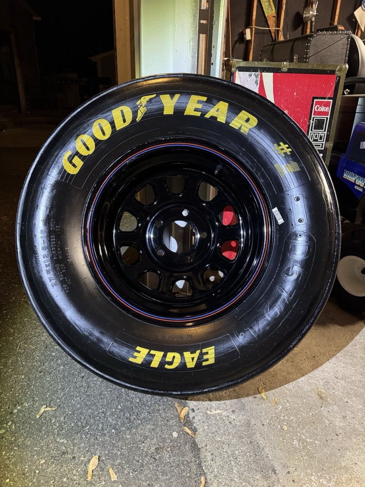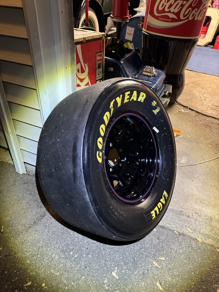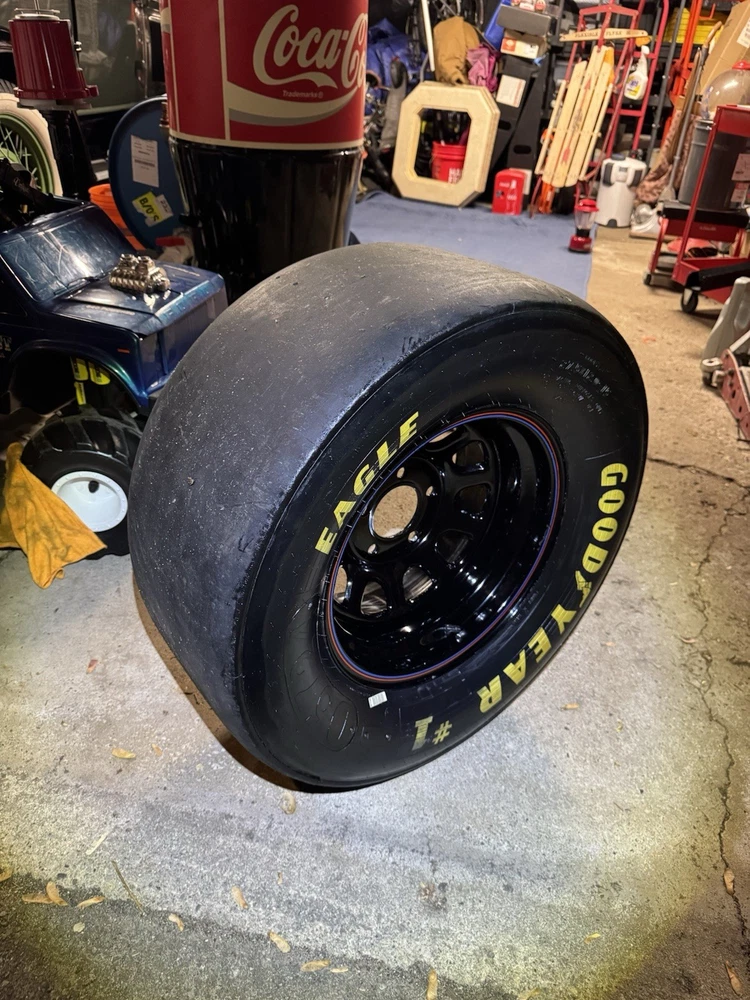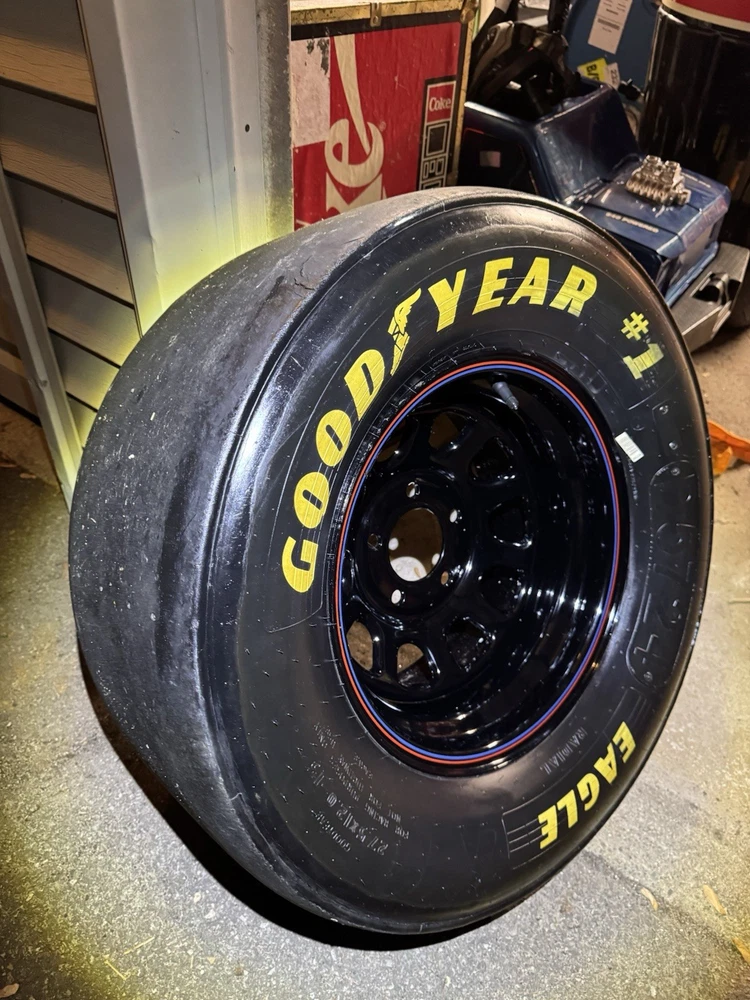 This wheel was a gift given to certain Goodyear Tire shop owners directly from NASCAR around 2000-2009. Brand new and in good condition (has had a few surface cracks from sitting but still holds air, see pictures). I used it at a bed side table for my kids for years. Tire is 27.5x12-15" and is marked with a circled "F" indicating that it's a front wheel. Model number - D5724 with 1993 date stamp. (93S29) You won't find another one like this especially untouched condition like this one. Awesome man cave piece for any NASCAR fan. $500 obo