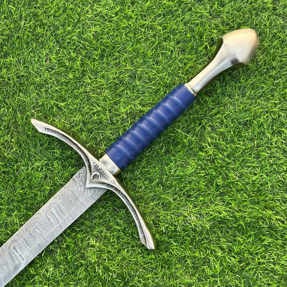 EXCLUSIVE HANDCRAFTED Damascus Steel Blade: A Legendary Sword for the Modern Warrior, Medieval Sword Swords Battle Ready, Hand Forged Sword, Damascus Sword, Long Sword, Viking Sword, Sword, Wedding Gift, With sheath Product Details: Overall Length: Approximately 35.0"inches (Approx.) Blade Material: Genuine Damascus Steel Blade Hardness: 54-58 HRC Handle Material: Leather Wrapped with handmade steel guard and but cap. Size Verification: To help you easily determine the size, we've included images with a scale for precise dimension reference. Thank you for your understanding. We appreciate your consideration. Included Accessories: Sheath -excellent husband wife gift -Wedding gift -Father's Day gift -Mother's Day gift -Birthday Gift -Groomsmen gift -Christmas gift -Luxury Gifts For Men -Anniversary gift for husband -Thanksgiving Gift For International Customers: We kindly advise our international customers to familiarize themselves with their country's regulations prior to making a purchase. If customs in your region request customs duties, please be prepared to cover these costs. Regrettably, we cannot assume responsibility, nor issue refunds in such cases. Our Damascus Steel Creation Process: At our workshop, we take immense pride in crafting authentic Damascus steel knives that surpass mere acid etching. Here's an overview of our Damascus steel-making process: 1. Material Selection: We meticulously combine 1095HC and 15N20 nickel carbon steel for our blades. 2. Layering: The chosen steels undergo repeated heating and folding to achieve a remarkable 384 layers. 3. Acid Burn: Following the layering process, the blade is treated with acid, revealing the brilliant nickel shine and a dark gray hue in the high carbon steel, thereby showcasing the stunning Damascus patterns. 4. Blade Finishing: Concurrently, we expertly sharpen the blade's edge, transforming the acid-treated edge into a striking satin finish. Our unwavering commitment to preserving the authenticity and craftsmanship of Damascus steel ensures that each knife in our collection showcases intricate layers and delivers exceptional performance. AGE LIMITATION: Please note that we exclusively sell knives to individuals who are 18 years of age or older. Additional Details: Leather Sheath (if pictured): Rest assured, this item comes with a superior-quality, sheath. Crafted with meticulous hand-tooling and stitching, it exemplifies fine craftsmanship and is designed for exceptional durability. The added stitching ensures it withstands years of demanding use, providing reliable protection for your knife throughout its lifetime. Care and Maintenance: When necessary, use a Diamond Wet Stone or a superior sharpening tool to maintain a 20-degree blade edge. After use, clean the item with soap and water, ensure thorough drying, coat it with gun oil, and store it separately from the sheath. Leather absorbs moisture from the air and can lead to blade rust if stored improperly. Customer Feedback: Your satisfaction and feedback are of utmost importance to us. We genuinely appreciate your positive reviews! When assessing shipping time, please consider international transit. Your recognition bolsters our confidence to enhance our services. If you encounter any issues with your order or product dissatisfaction, please reach out to us first. We are committed to resolving any concerns to your satisfaction and kindly request you not to leave neutral or negative feedback. Payments & Returns: All accepted eBay payment methods are available for this purchase. Our return policy typically extends to 14 days. Shipping and Handling: We offer free shipping on all our products (In the USA) Tracking Info: The buyer will receive the tracking number via email (if available). You can also track the shipment in the "Order Details" section on eBay. USPS UPS DHL updates tracking information nightly (if available). Contact: Feel free to contact us anytime via eBay messages. We are dedicated to responding to your inquiries within 24 hours and providing the best possible assistance.