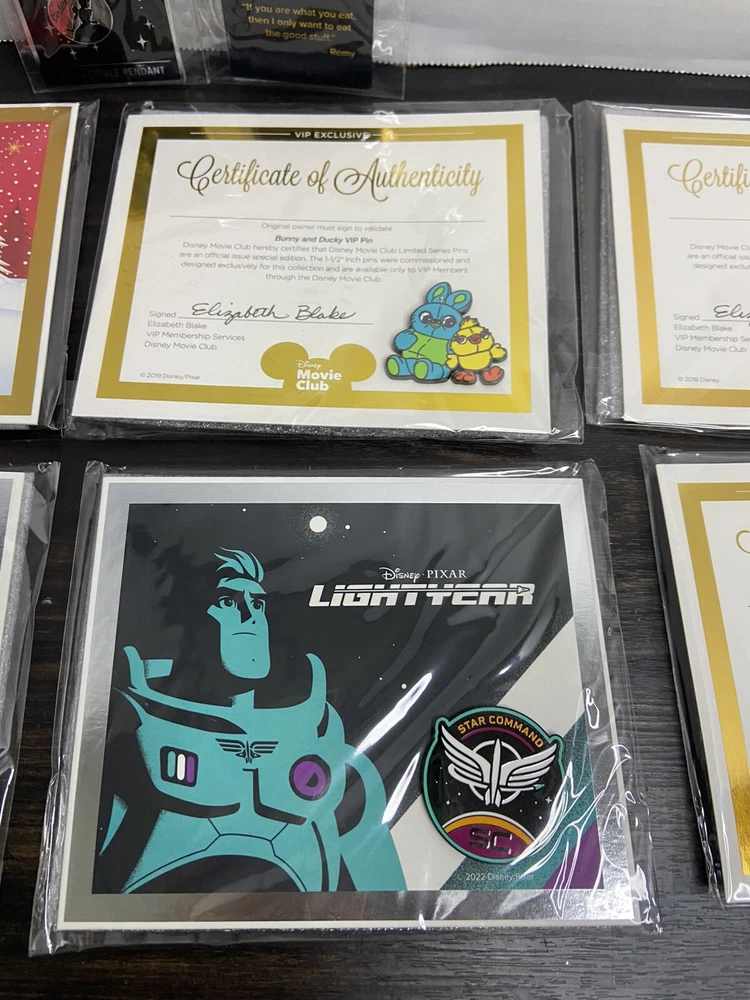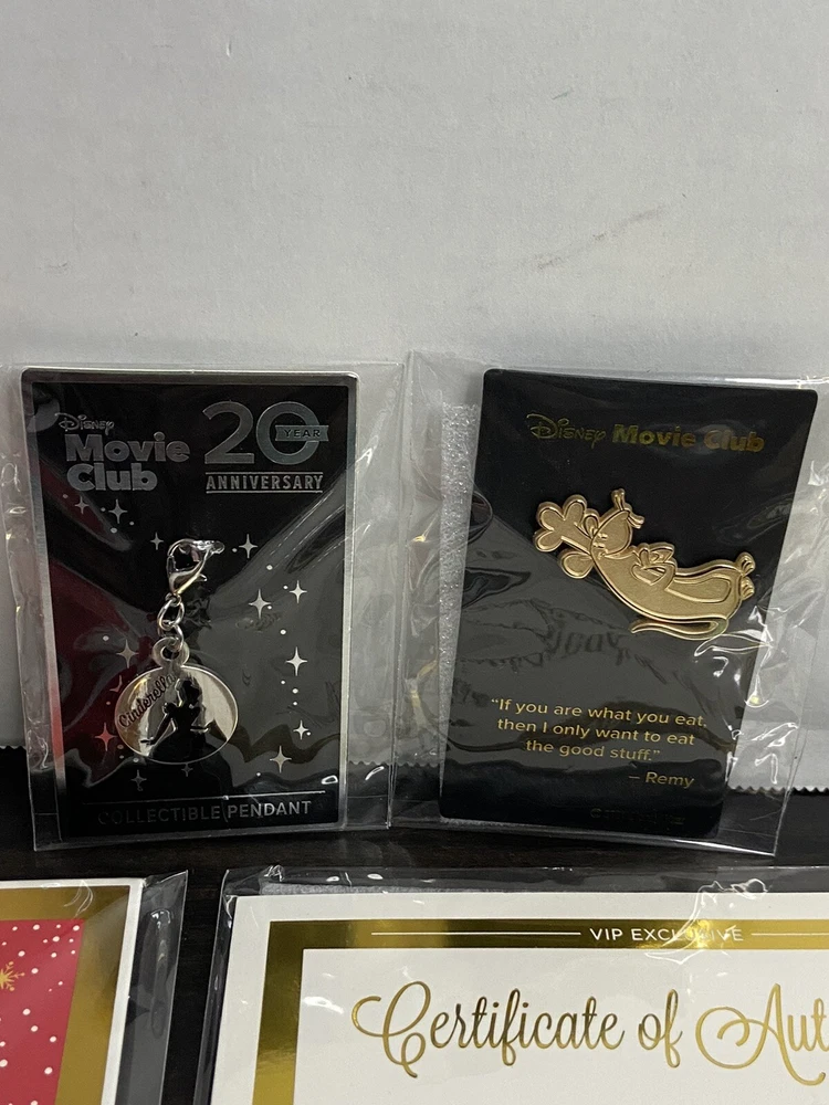 Delve into the enchanting world of Disney with this exclusive lot of 6 Disney Movie Club (DMC) pins, each piece a VIP invitation to a universe of cinematic magic. Celebrate your love for Disneyana with these collectible pins featuring beloved characters like Coco and Mickey, each one a pendant of storytelling and whimsy. Crafted for Disney enthusiasts and pin collectors alike, this set is a treasure trove from the contemporary era of Disney memorabilia. These pins are not just accessories, but badges of honor in the realm of Disney fandom, representing an intimate connection to the Pixar-themed events and experiences that have touched hearts and stirred imaginations.