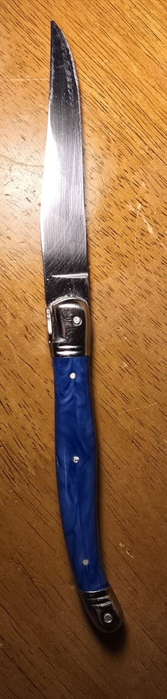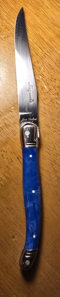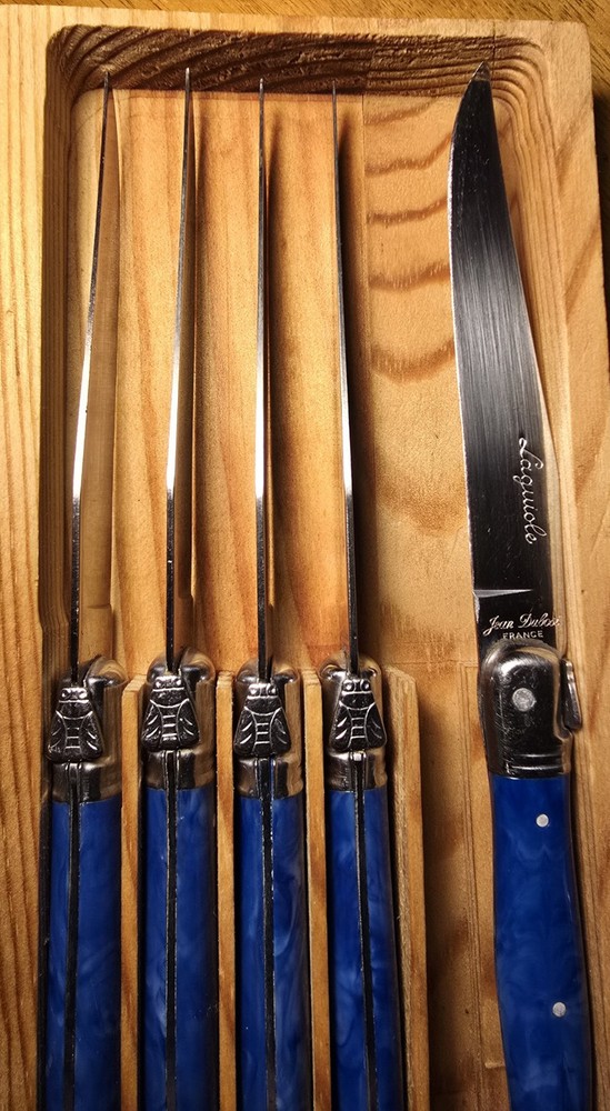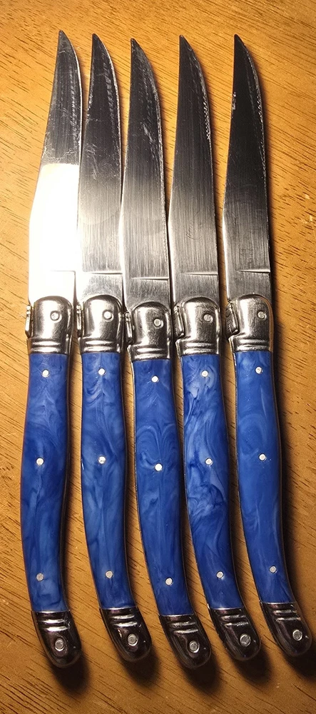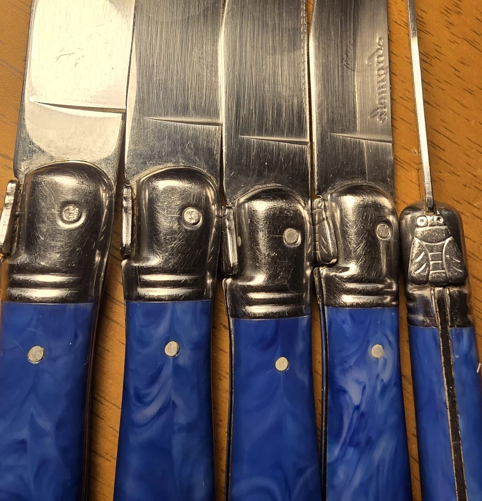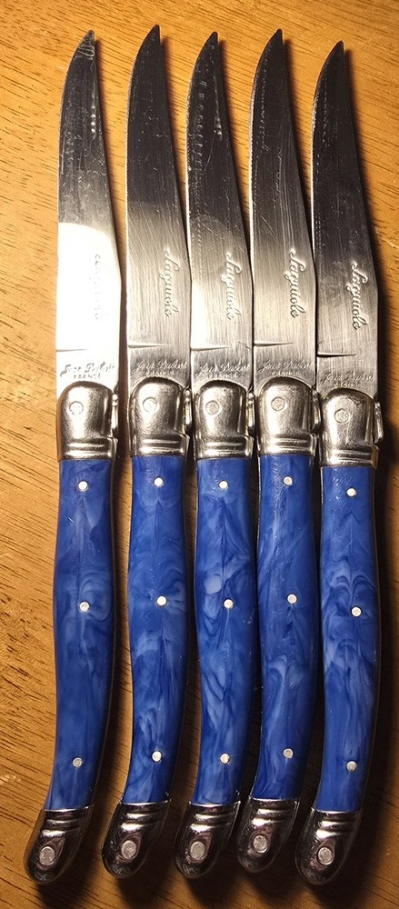Brand: Laguiole Blade Length: 4.25" Material: Stainless Steel Number of Items in Set: 5 Handle Material: Stainless Steel Country/Region of Manufacture: France Type: Steak Knife Features: With Handles Color: Blue Set Includes: Knife Set, Serrated Knife, Steak Knife Blade Edge: Serrated