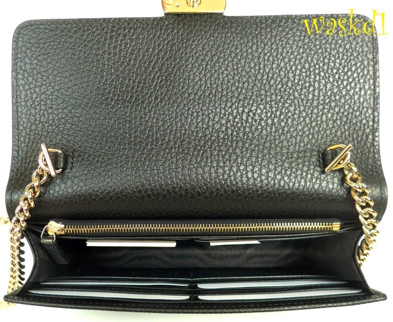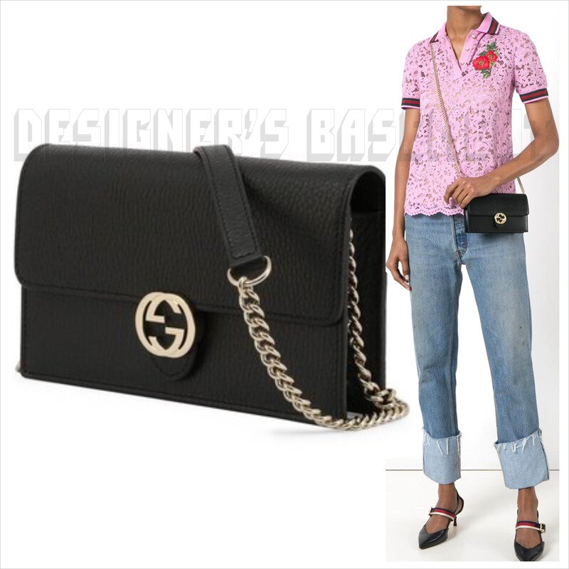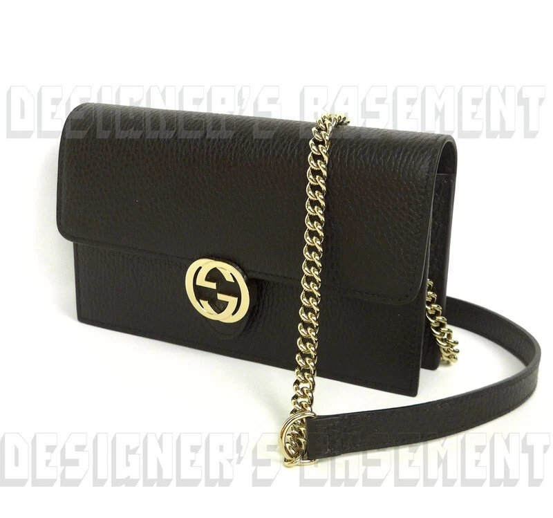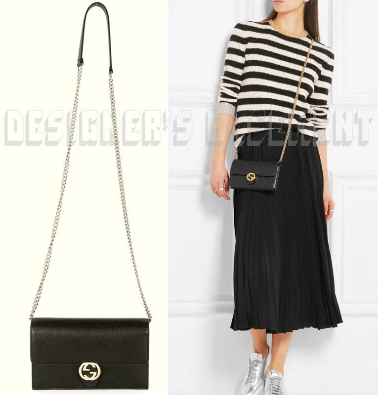 GUCCI black Leather INTERLOCKING G crossbody CHAIN bag wallet NWT Authentic $1290! Authentic GUCCI Outlet fabulous instantly recognizable black pebbled leather INTERLOCKING G snap flap MINI chain strap cross-body bag/wallet #615523. It's made in Italy of finest genuine leather exclusively for the Gucci Outlet stores . This fabulous bag has gold-tone "Interlocking G" logo on the flap over the snap closure and bold gold-tone chain 23"-drop detachable strap with leather shoulder panel . Inside it has a zip pocket on the back with a large compartment in the middle that has 18 credit slots built in on both sides with 8 slots on one side and 10 on the other side. There is a serial number embossed inside one slot . The measurements are approximately W 7.5"x H 4.5"x D 1.5" . Comes in it's original GUCCI box and dust bag! Brand new with tags on the box. You'll love it!