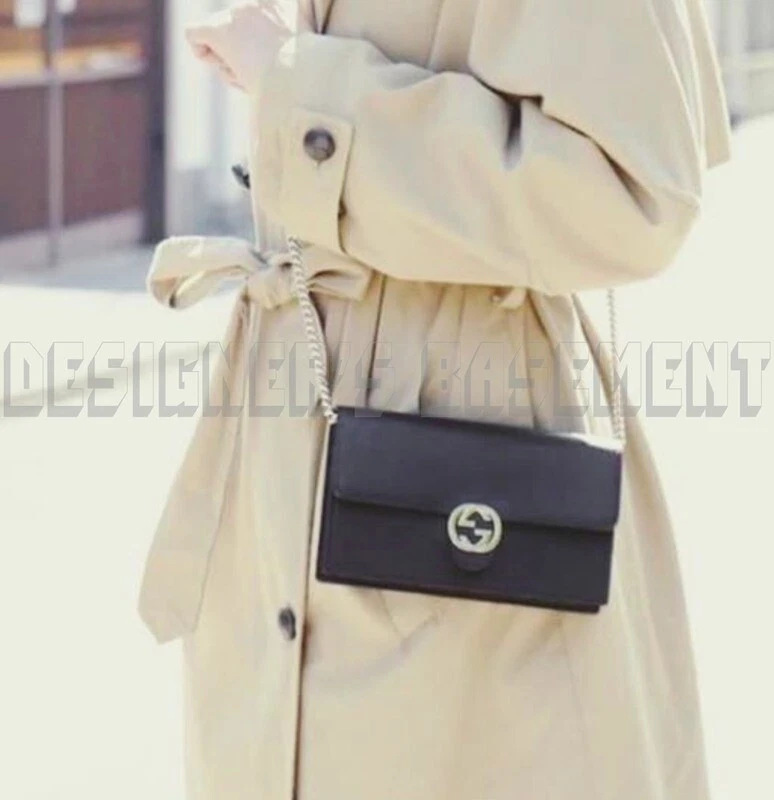 Authentic GUCCI Black Leather Interlocking G Crossbody Chain Bag Wallet NWT $1290