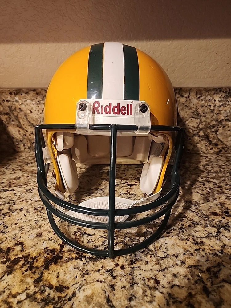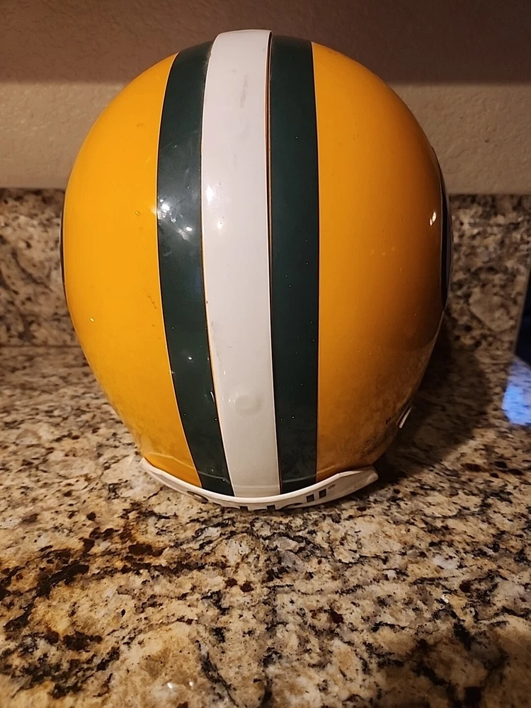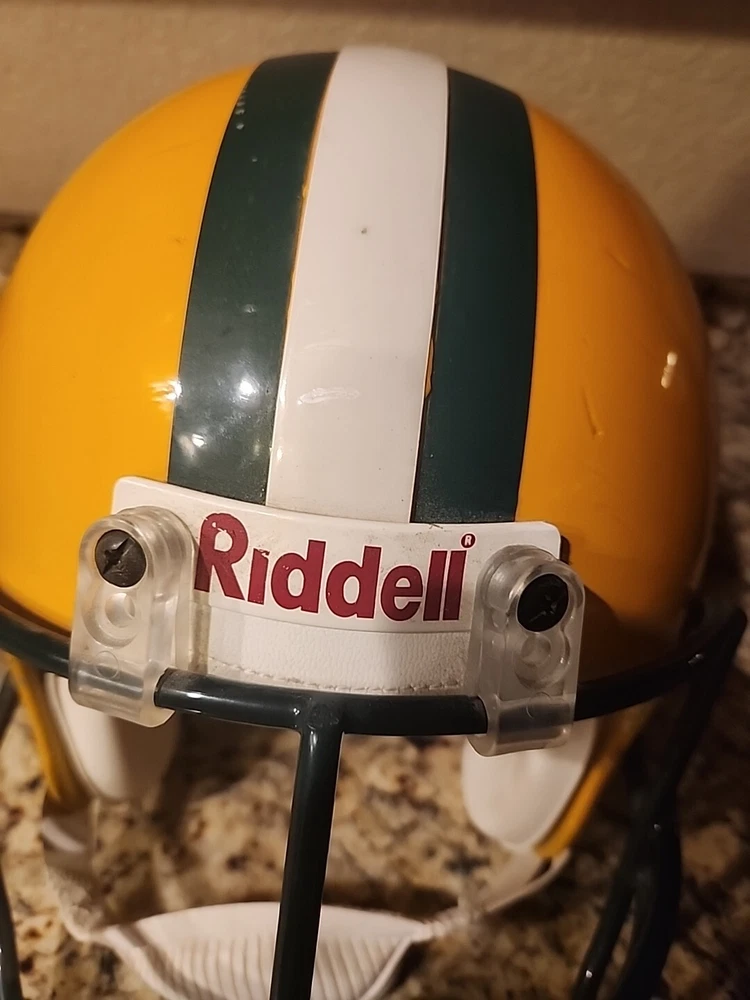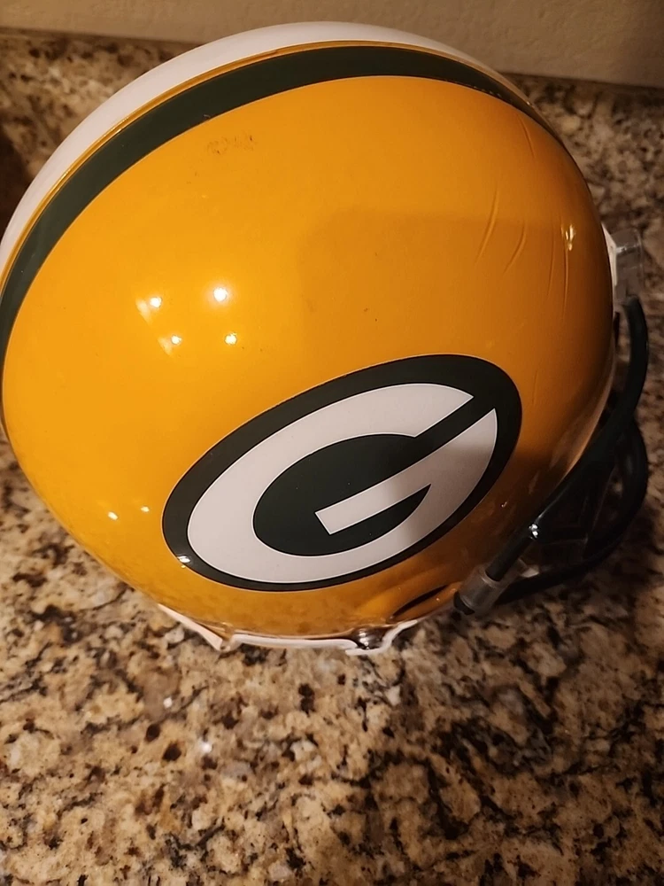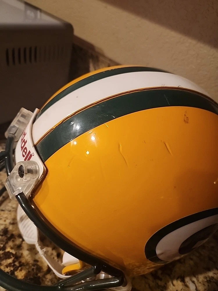 From the mid 1990s Packers Team Issued Helmet. Could be game used definitely has some marks showing some use in a practice or game. Sticker inside shows it was certified by Naera in 1996 so mid 90s Packers helmet