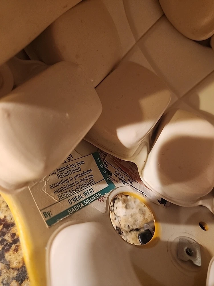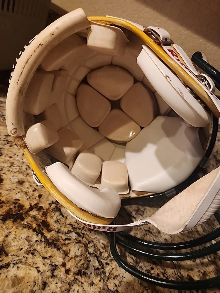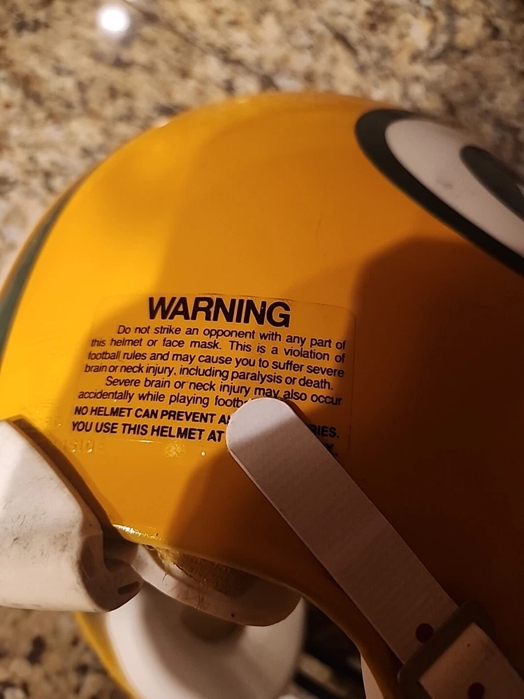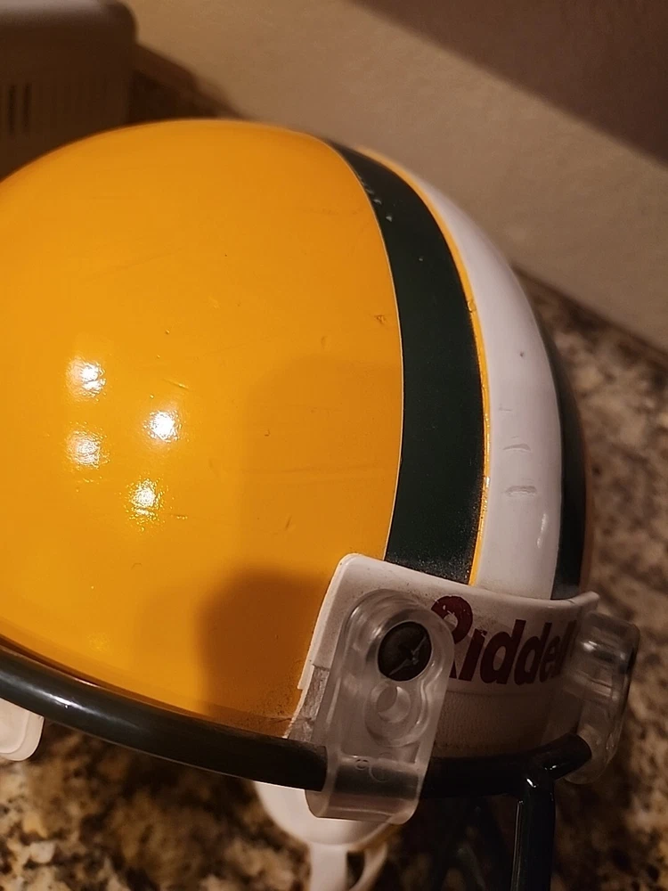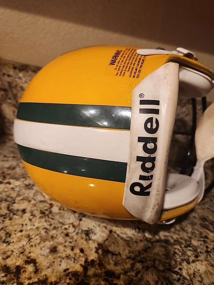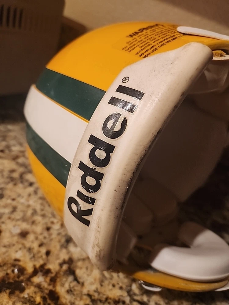 From the mid 1990s Packers Team Issued Helmet. Could be game used definitely has some marks showing some use in a practice or game. Sticker inside shows it was certified by Naera in 1996 so mid 90s Packers helmet