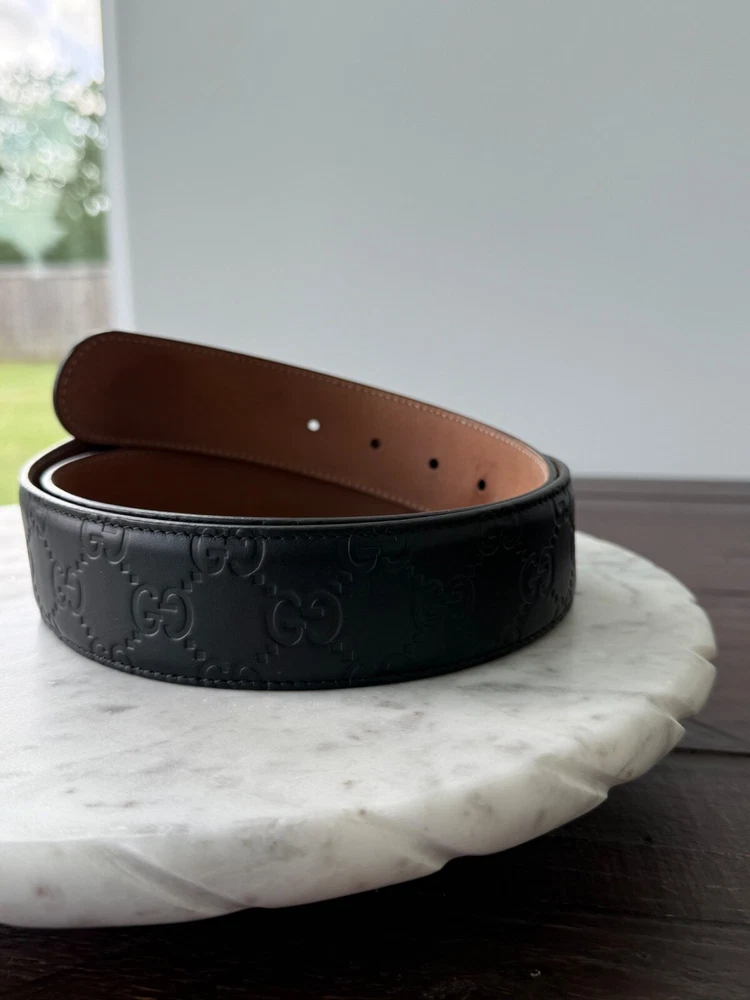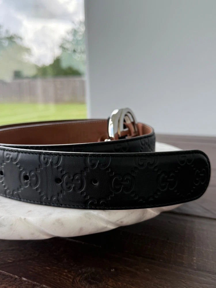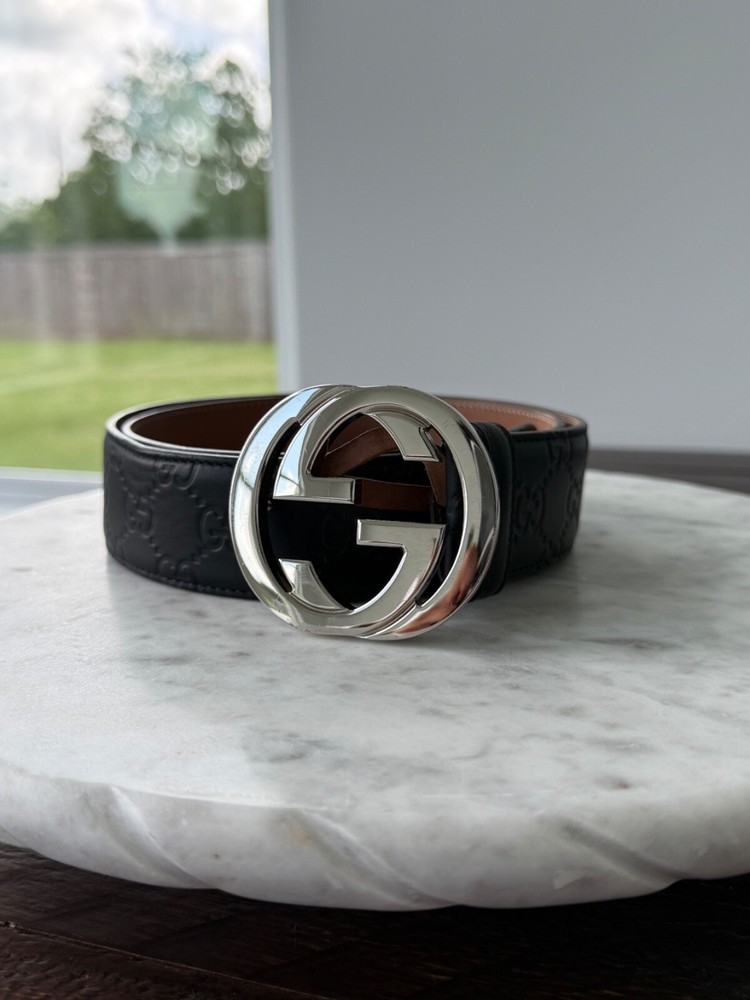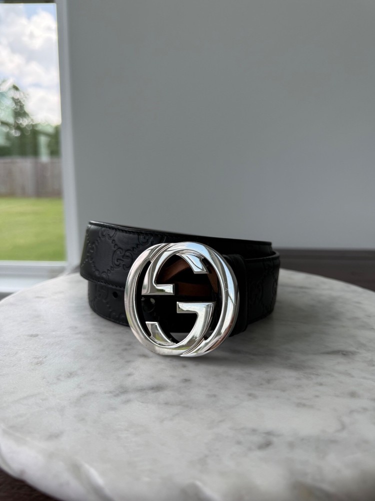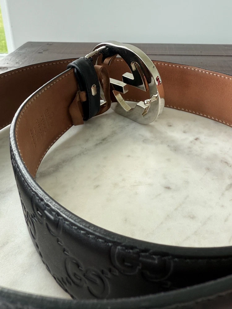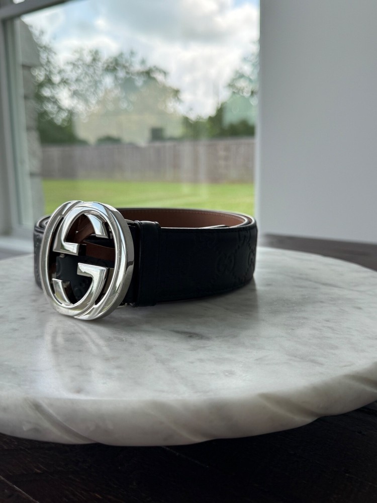 The product is an authentic Gucci belt in size 90/36, crafted from black leather with interlocking GG monogram detailing. This stylish designer belt features a solid pattern, buckle accent, and logo branding, making it a versatile accessory for men looking to add a touch of luxury to their outfit. Made in Italy, this dress belt embodies the sophisticated and high-quality craftsmanship that Gucci is known for, making it a must-have item for those seeking a designer touch to their wardrobe. No Box