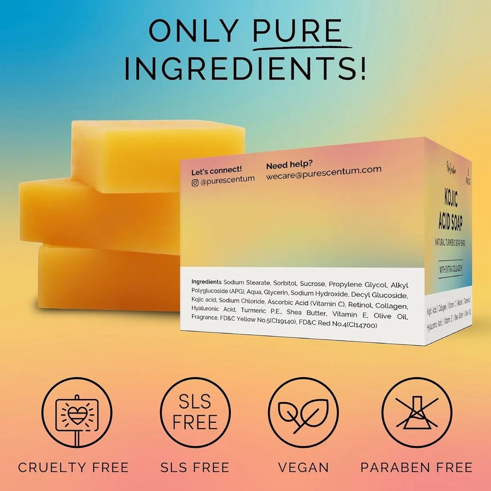 Pure Kojic Acid Skin Brightening Soap with Added Collagen Boost: Our turmeric-infused Kojic Acid soap is carefully crafted with pure, vegan ingredients and enhanced with extra collagen, ensuring the health, radiance, and a vibrant glow of your skin. Vegan, Paraben-Free, SLS-Free: All our ingredients work in harmony to benefit your skin. For a full list of ingredients, including Kojic Acid, turmeric, hyaluronic acid, shea butter, and more, refer to the product description below. Kojic acid, a natural ingredient originating from Japan, is renowned for its powerful brightening effects, aiding in dark spot correction, preventing hyperpigmentation, and promoting a more even skin tone. Experience the transformation with our pure Kojic Acid Turmeric Soap. Usage Instructions: Prior to use, conduct a spot test on your hand. Gently rub the brightening turmeric soap with water and massage it onto wet face and body. Rinse thoroughly. Detailed instructions can be found on the package. Suitable for your face, hands, neck, bikini area, inner thighs, and underarms. Nourish and Revitalize: Elevate your skin inside and out for radiant results. With your purchase of Kojic Acid Soap, receive an exclusive eBook: "Glowing Skin Diet Plan." For any inquiries, please contact our support team. Product Description Natural pure kojic acid soap with added collagen How to use kojic acid soap Usage Instructions: Prior to use, conduct a spot test on your hand. Gently rub the brightening turmeric soap with water and massage it onto wet face and body. Rinse thoroughly. Detailed instructions can be found on the package. Can I use this for body & face? Pure Scentum kojic acid soap is suitable for your face, hands, neck, bikini area, inner thighs, and underarms. Is it vegan? Out turmeric kojic acid soap is Vegan, Paraben-Free, SLS-Free. All our ingredients are pure and work in harmony to benefit your skin. How do I get the ebook? It will be sent to you automatically by email after your purchase. USA handmade bath bombs made from natural quality ingredients How many bath bombs? 4 giant XXL bath bombs How many bath bombs? 6 giant XXL bath bombs How many bath bombs? 6 giant XXL bath bombs Where are they made? Handmade in the USA Where are they made? Handmade in the USA Where are they made? Handmade in the USA