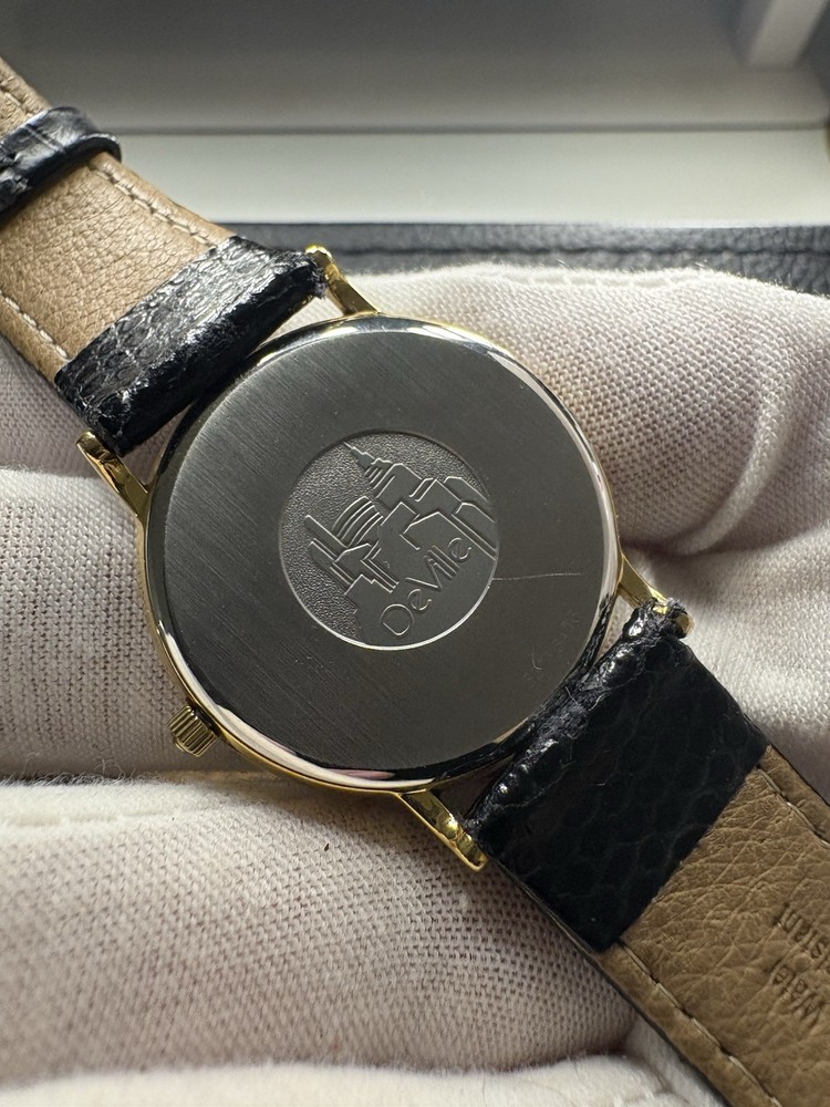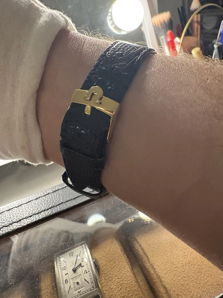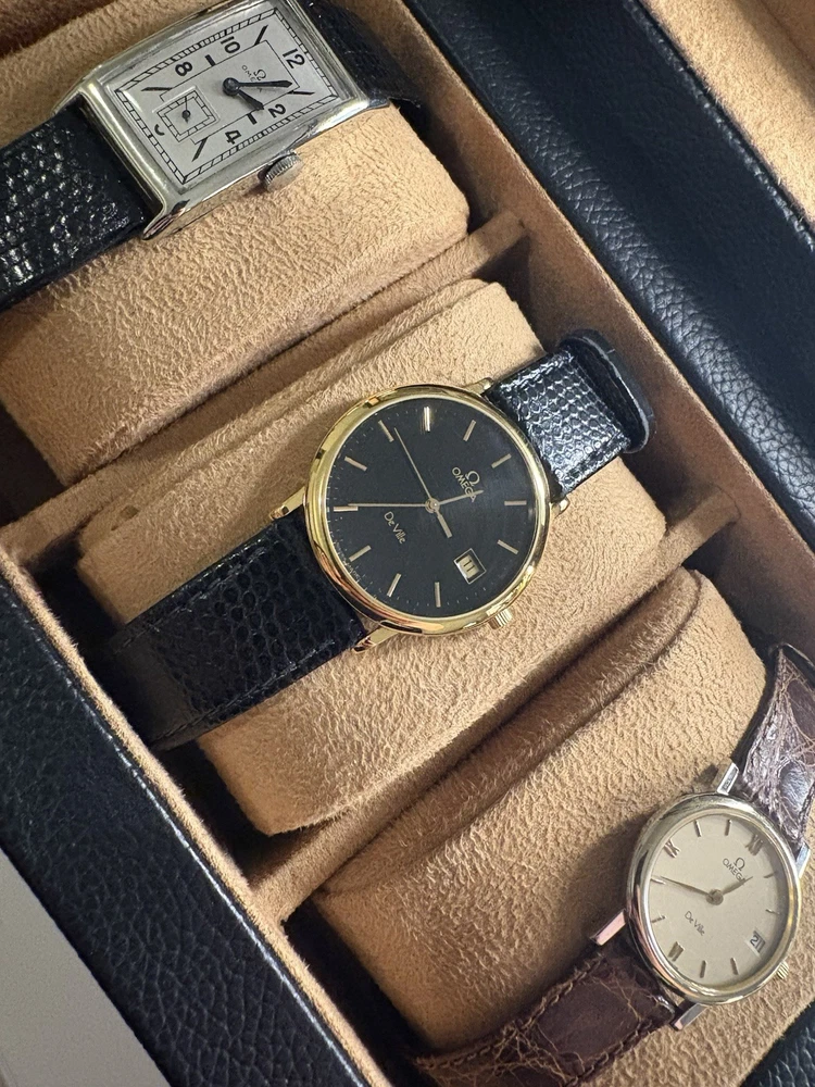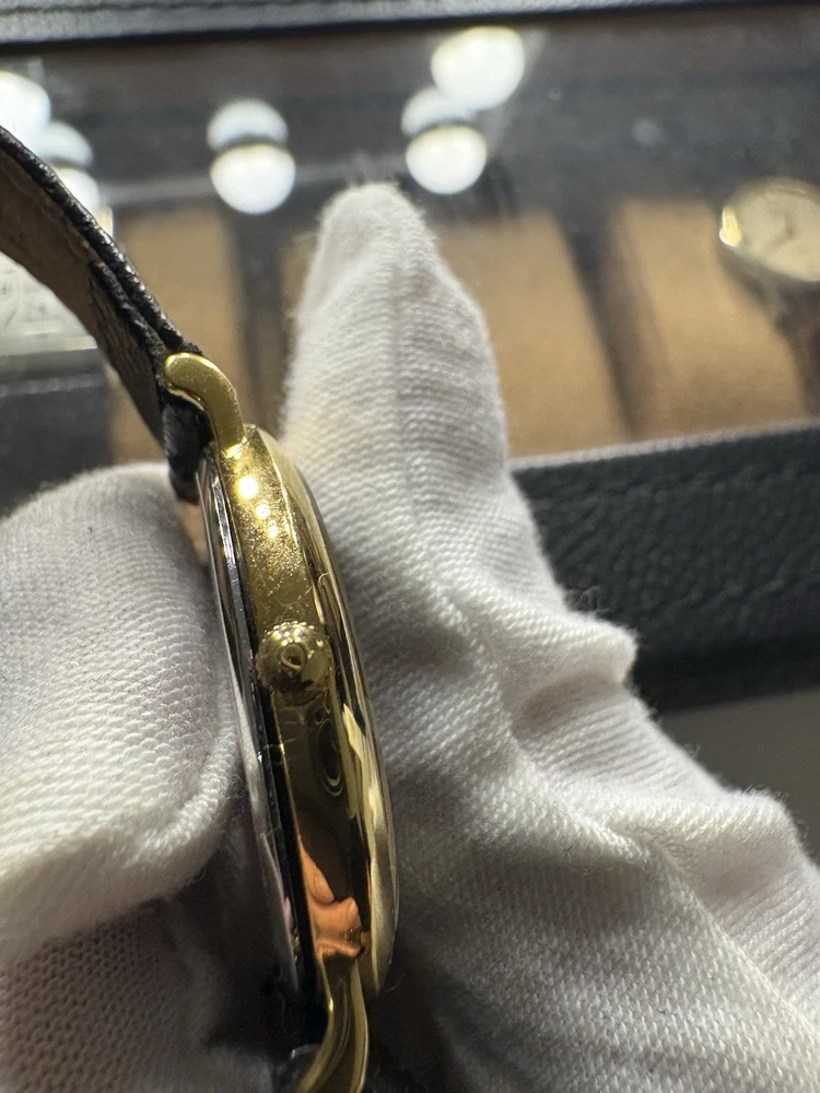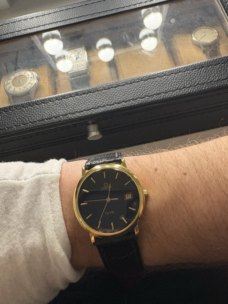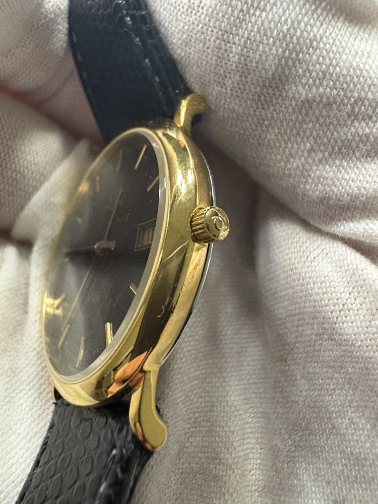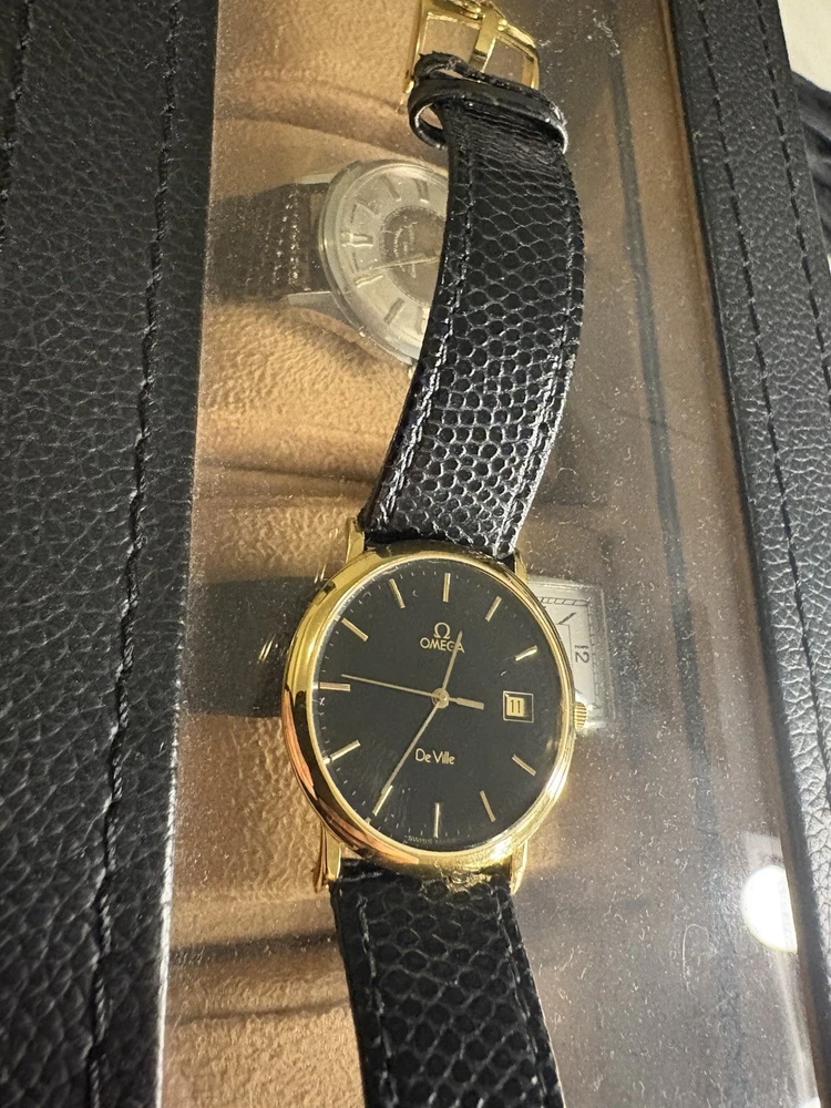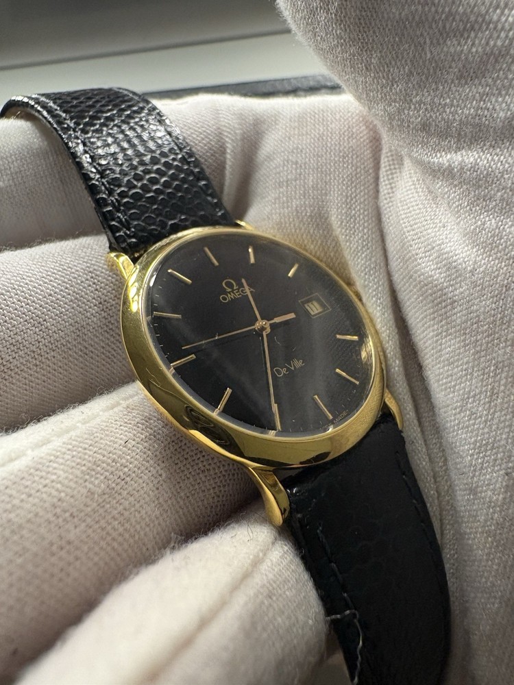 This exquisite Omega De Ville men's watch combines classic sophistication with reliable quartz precision. It features a striking black dial with a convenient date window, housed in a polished gold-plated case. This piece has been professionally serviced to ensure it remains in excellent working order. Product Specifications • Brand: Omega • Model: De Ville • Movement: Omega Quartz • Case Material: Gold-plated stainless steel • Case Diameter: Approximately 32mm (excluding crown) • Dial Color: Black (Re-done) • Band: Approximately 18mm wide non-original black leather strap • Features: Round date display at the 3 o'clock position Condition Notes • Movement: Serviced and adjusted; currently in excellent working order with high daily accuracy. • Exterior: The case has been professionally polished, though minor character marks from previous use may be visible upon close inspection. • Accessories: This listing is for the watch only; no original box or papers are included.