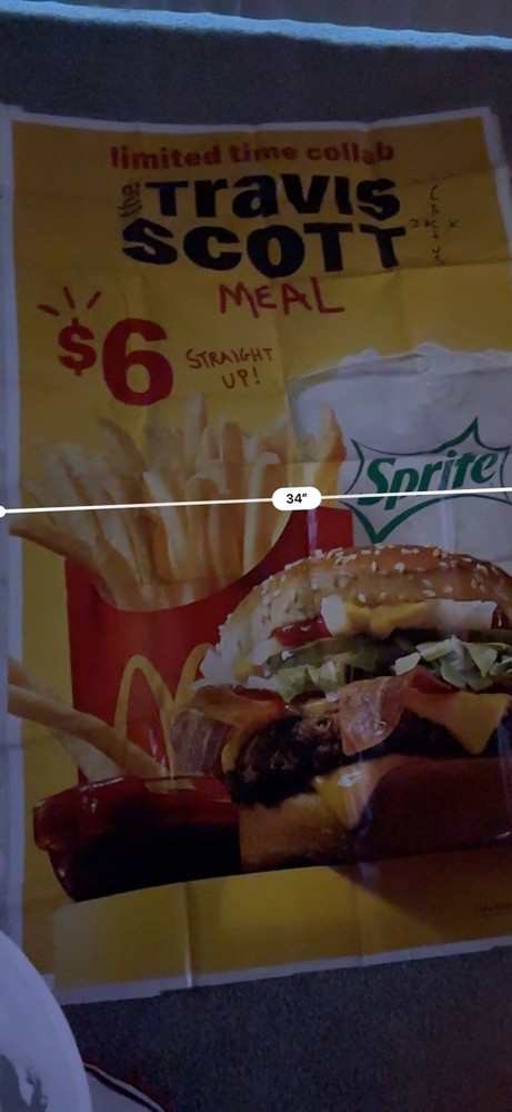 The product is an authentic Travis Scott Meal McDonald's poster, featuring the artist's collaboration with the fast-food chain. This limited-time collectible item is a large unframed poster of the Travis Scott burger, showcasing the unique design and style created by the artist himself. Perfect for fans of Travis Scott and collectors of exclusive merchandise, this poster captures the essence of the collaboration between the artist and McDonald's.