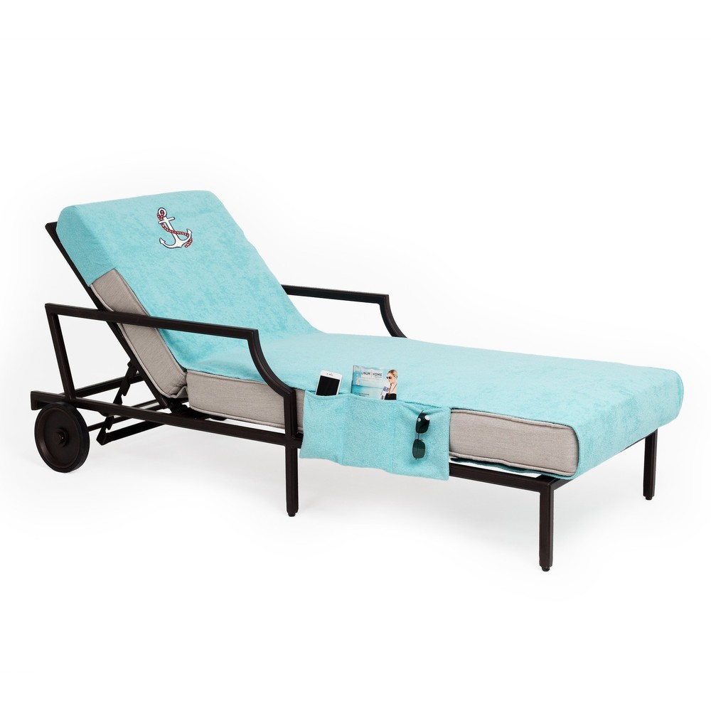 Add a personalized touch to your pool, deck or patio with this aqua chaise lounge chair cover that is embroidered with an anchor for the perfect decorative touch. This cover offers comfort and style with a woven terry construction and a convenient side pocket for convenience. Constructed with 100 percent Turkish cotton, this chair cover is soft and comfortable for laying in the sun or taking a nap.Furniture not included100-percent genuine Turkish cottonAqua Turkish terry cotton with an embroidered boat anchor in shades of red, white and navy blueOur 100-percent Turkish cotton terry covers are specifically made to protect your chaise lounge cushions from the harmful sunrays, suntan lotion, spills, wear and tear, while providing superb personal hygiene and extra lounging comfortDesigned to Free Shipping Over $49.99* Details Authentic Turkish Cotton Embroidered Anchor Aqua Towel Cover with Pocket for Product Description: Add a personalized touch to your pool, deck or patio with this aqua chaise lounge chair cover that is embroidered with an anchor for the perfect decorative touch. This cover offers comfort and style with a woven terry construction and a convenient side pocket for convenience. Constructed with 100 percent Turkish cotton, this chair cover is soft and comfortable for laying in the sun or taking a nap. Furniture not included 100-percent genuine Turkish cotton Aqua Turkish terry cotton with an embroidered boat anchor in shades of red, white and navy blue Our 100-percent Turkish cotton terry covers are specifically made to protect your chaise lounge cushions from the harmful sunrays, suntan lotion, spills, wear and tear, while providing superb personal hygiene and extra lounging comfort Designed to perfectly fit any cushion up to 5 inches thick Side pocket is 10 inches high and divided into three pockets are 18 inches wide total which is perfect for holding your sunglasses, keys, suntan lotion or water bottle Machine washable Dimensions32 inches wide x 102 inches long Pocket at top of chaise lounge cover is 18 inches long x 5 inches deep to keep your cover securely attached Produced in a state of the art green factory in Turkey which runs on 100-percent solar energy
