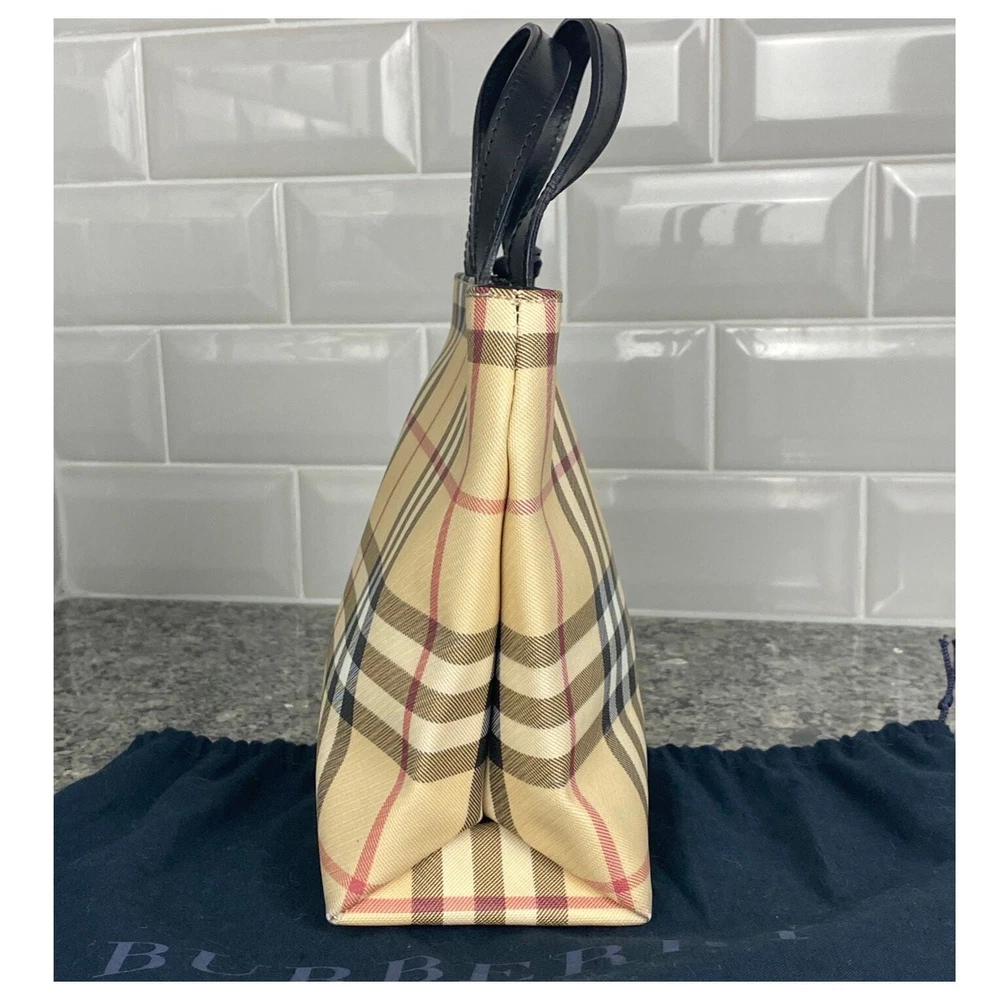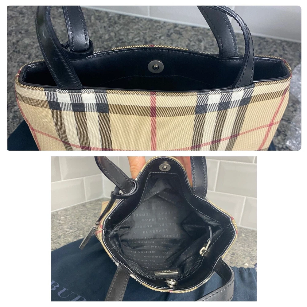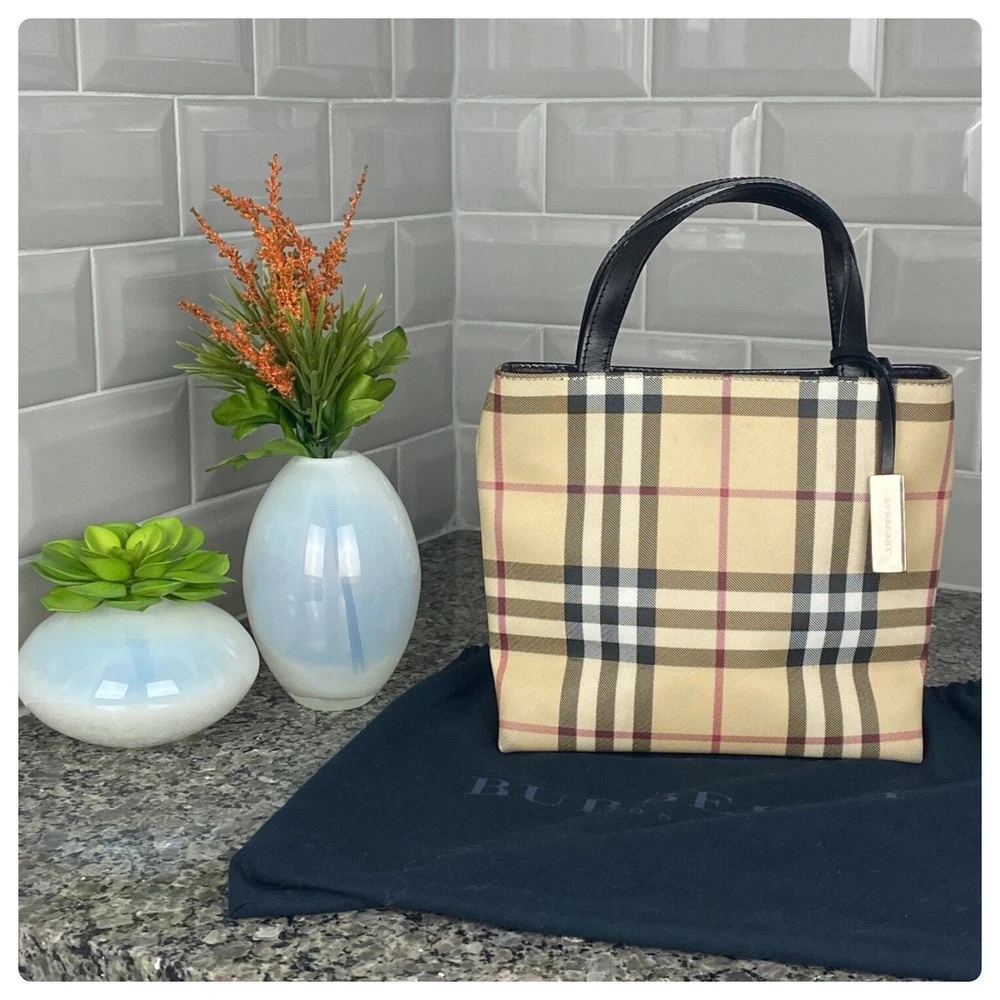 Authentic Vintage Burberry Nova Check Mini Tote Nova check pattern Tan/Beige multicolor Coated canvas Silver hardware Black leather trim Dual flat top handles Lined Single zip pocket at interior wall Magnetic snap closure at top Dust bag included Coated canvas Leather Mini Handle drop: 4.25" Height: 7.75" Width: 8.75" Depth: 4" Please Note - All Measurements Were Taken By Hand And Are Approximate; Slight Variations May Occur Made in London Pre owned Good condition Normal wear Hardware has minor scratches/scuffs, if any Signs of wear on the corners and the leather Interior is in excellent condition
