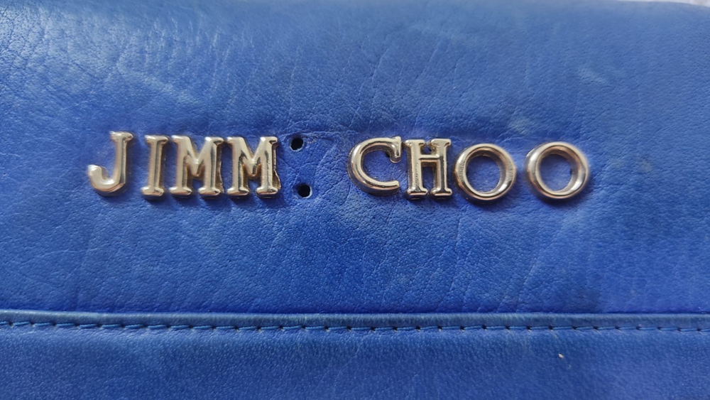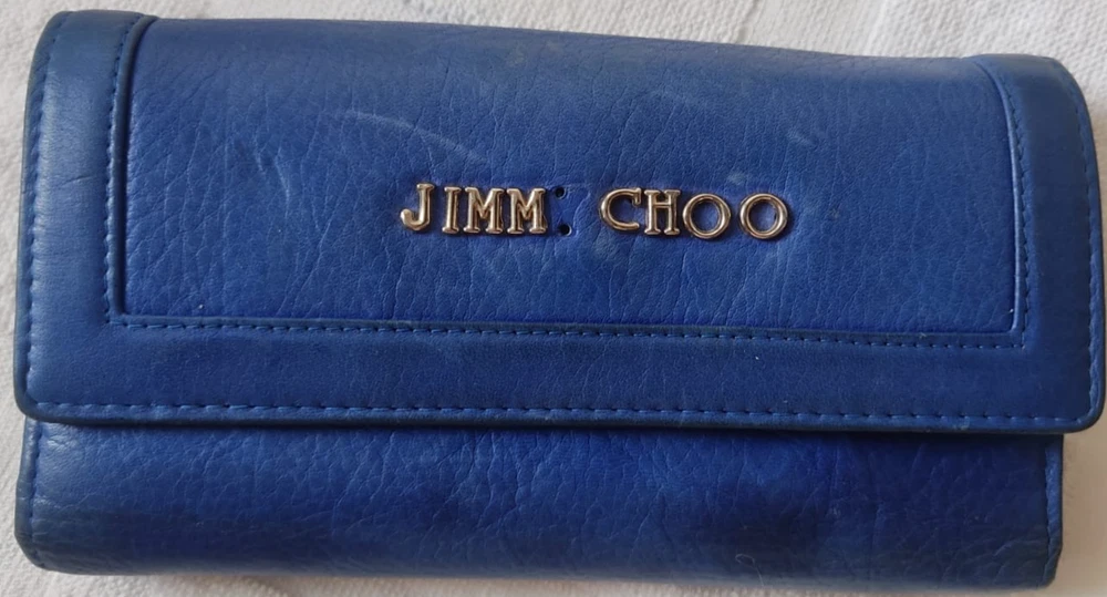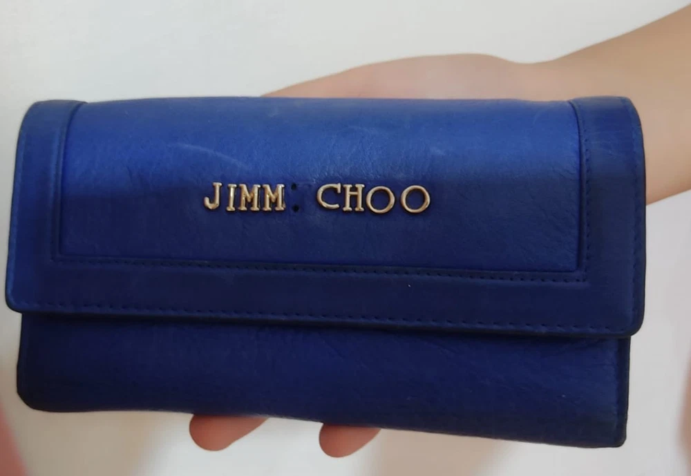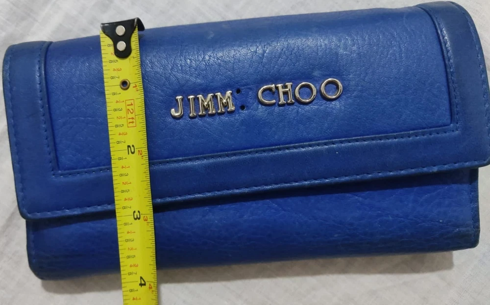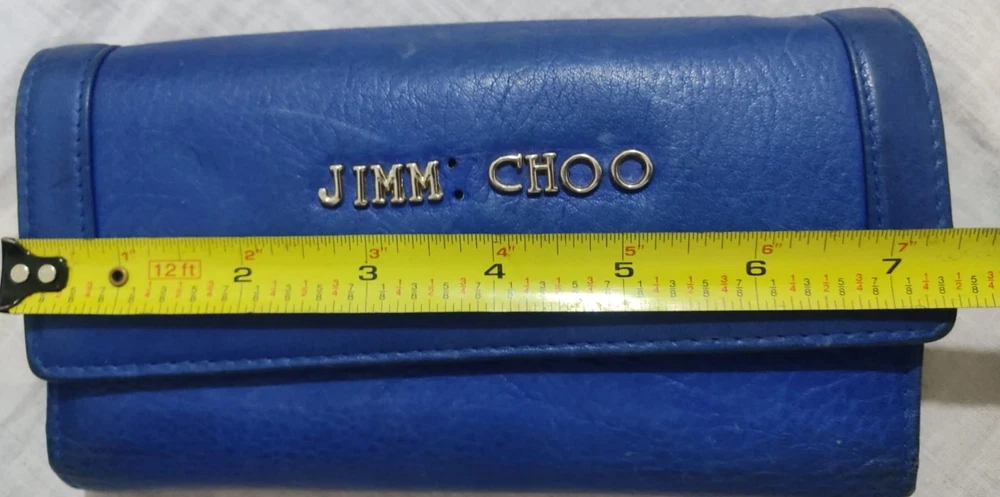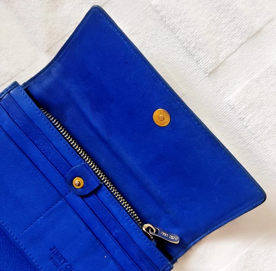 This authentic and rare Jimmy Choo long wallet in blue leather from Italy features a solid pattern with a velvet fabric type. The wallet is a size medium with accents of the Jimmy Choo logo, making it a stylish clutch for both men and women. Measuring 7.5 inches in length and 4 inches in width, this luxurious accessory is a unique and practical addition to any wardrobe.