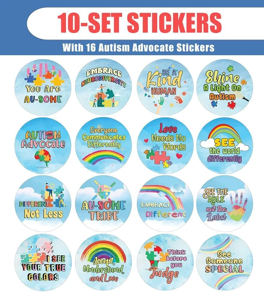 16 UNIQUE DESIGNS INSPIRING STICKERS FOR YOUR DIY PERSONALIZED DECORATIONS - These colorful and uniquely inspiring round shaped stickers are the best tool for DIY decoration and personalization of your belongings. GREAT STOCKING STUFFERS, SCHOOL CORPORATE TEACHING SUPPLEMENTARY MATERIALS, AND INCENTIVE GIFTS - Great rewards giveaways for Boys Girls, Kids, Teens, Children, Adults, Professionals. A perfect design to give during guidance sessions, classroom activities, school giveaways, birthdays, anniversaries, family day, and any other special occasions. MADE WITH DURABLE AND WATERPROOF MATERIALS - There is a lamination or coating to make the stickers high water resistant, and WILL NOT fade from the water. The stickers can stick it anywhere you like, and it sticks there and lasts a long time. A COLORFUL AND DECOR STICKER DECAL - Each sheet with 16 individual round stickers. There are 10 Sheets, with a total of 160 pieces of stickers. STICKER SIZE: 1.5 INCHES IN DIAMETER Autism Advocate Stickers (10 Sets X 16 Designs) COLORFUL AND COLLECTION OF TEXT STICKERS • Well designed. • Very encouraging. • Self-adhesive. Autism Advocate Stickers (10 Sets X 16 Designs) are super fun to collect; you can't have just one! That's why you will find a selection of stickers right here. Each package comes with different stickers in a variety of designs. Stick them here, stick them there, stick them everywhere! Everyone will love these self-adhesive stickers. These colorful stickers are perfect for any adults and these come with very inspiring messages and bright pictures. A fun, inexpensive way to add a decorative, notes, and stationery. Delight yourself with uplifting messages designs that are very encouraging. Autism Advocate Stickers (10 Sets X 16 Designs) perfect for giveaways, behavior incentives, prizes! These stickers are acid-free, nontoxic, and safe for use on photos. This product comes with a 60 days money back guarantee. You can return them to us for a full refund.