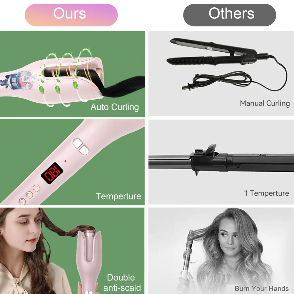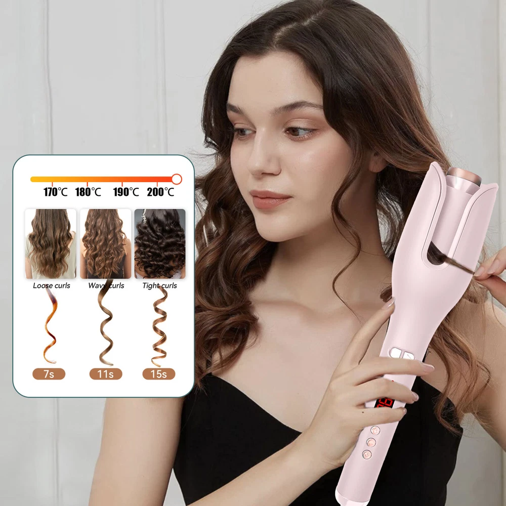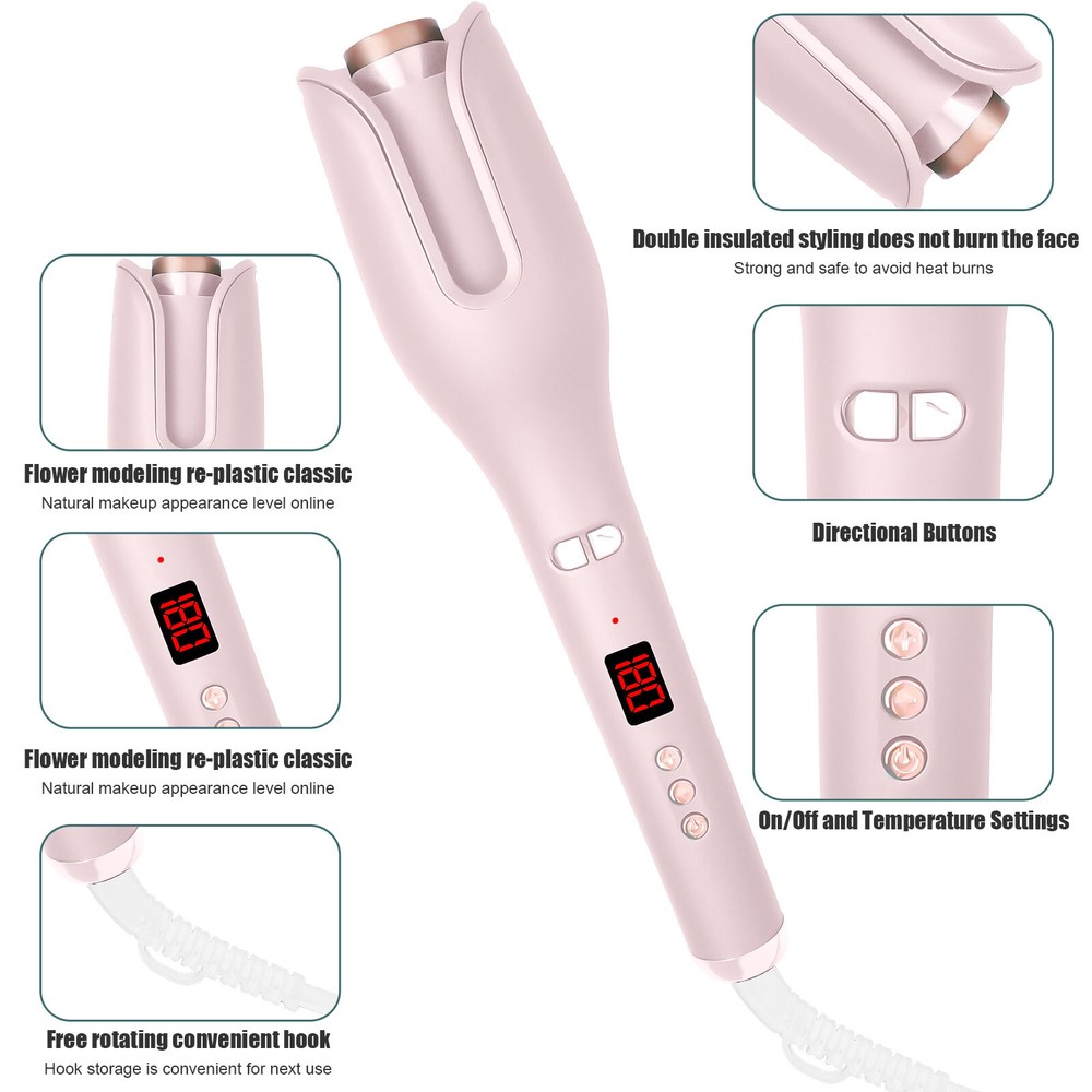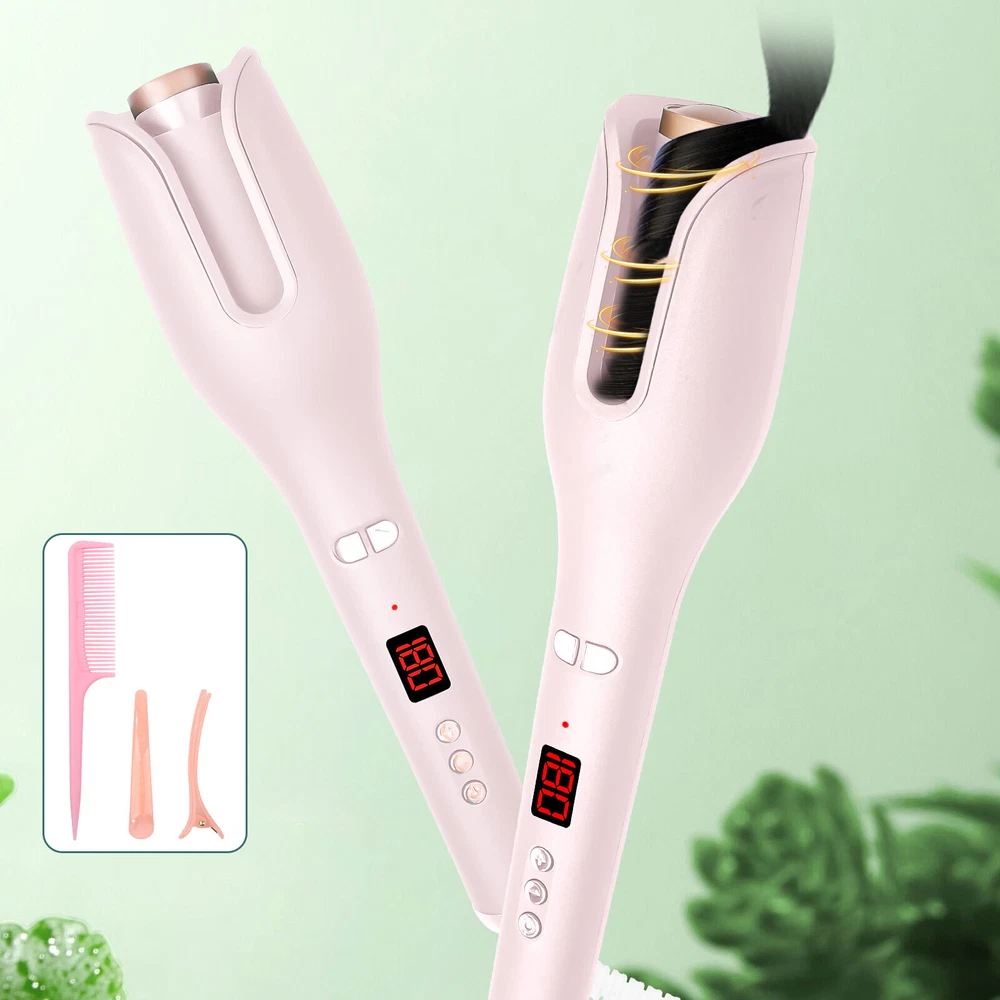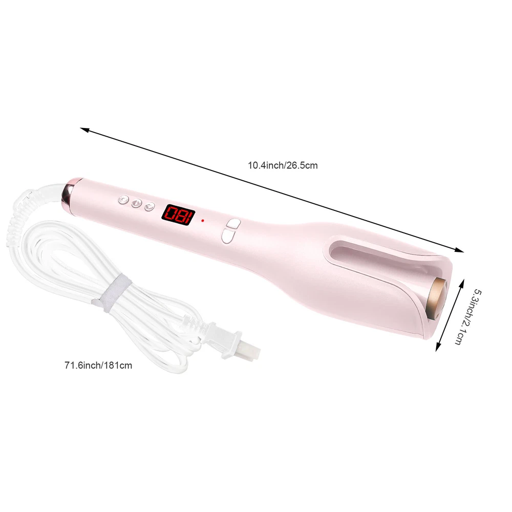 Auto Hair Curler w/ Temps LCD Display Anti-Tangle Auto Shut-Off for Hair Styling Auto Hair Curler, Automatic Curling Iron Wand Big roll auto hair curler rotating anti-perm does not hurt hair Automatic curling iron Rapid heating, 360 degrees three-dimensional heating ---- built-in PTC heating tablet, after reaching the set temperature, constant temperature, do modeling to reduce hair high temperature damage Face anti-hot design, safe modeling - anti-hot shell, double anti-hot insulation layer, no need to worry about the risk of hot face It's quiet, it doesn't make any noise, LCD screen, curling iron can adjust different temperatures One hour can only power off - built-in intelligent chip, 60min no operation in the case of curling iron will automatically shut down, guard your safety Round handle for a comfortable grip. With negative ion indicator light 360 degree tail line, free rotation, convenient storage How to Use it: Step 1: Long press the power button for 3s to switch on the auto hair curler. Step 2: Select the temperature you need, wait for the pre-heating to finish. Step 3: Select and smooth a strand of your hair (1cm-3cm diameter is best), put it into the slot and pull it downward. Step 4: Long press the L/R button for 7-8s, release the direction button when the hair totally wrapped in. Step 5: After releasing the direction button, pls don't release your hair and wait 8-12s Step 6: Move the curing iron away from you to release the hair from the curing slot. Warm Tips: This curler will stop working and turn off to prevent the hair from being tangled if it curls too much hair or works incorrectly. This is not a quality issue with the product, it is to protect the hair from damage. If hair does get stuck in the slot, just spin the curling dial the opposite direction to release the hair. Please only put hair in ONE side of the barrel. Do Not put too much hair in Both sides. Press the direction button and it will start to wind. When it stop winding, release the button but don't release your hair. Then wait for curl fixing until it’s at your desired time. Package List 1 x Auto Hair Curler 2 x Hair Clip (The colors are random) 1x Hair Comb(The colors are random) 1 x User Manual