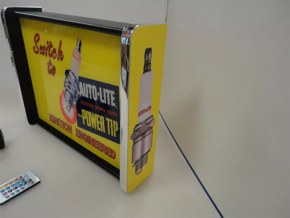 You are Bidding on a Auto Lite Spark Plug LED Display light sign box This sign has Vinyl Graphics applied to a plywood and Black melamine end caps AWESOME QUALITY It has a acrylic front sign panel that lights up with LED strip lights and a remote control to run them , they can change colors and flash and do all kinds of cool stuff It is 18" wide and 14" tall and 4 " deep It has a 110 volt power cord that run 12 volt LEDs I Will combine shipping on Multiple auctions We Do ship Internationally Powered by SixBit's eCommerce Solution