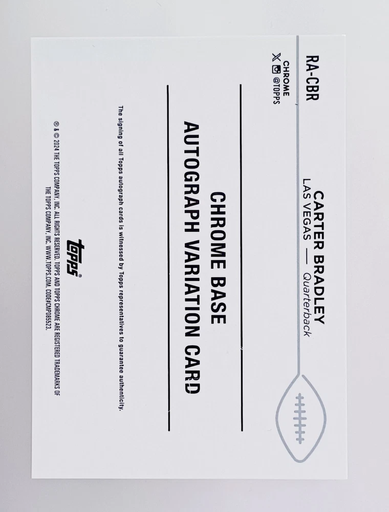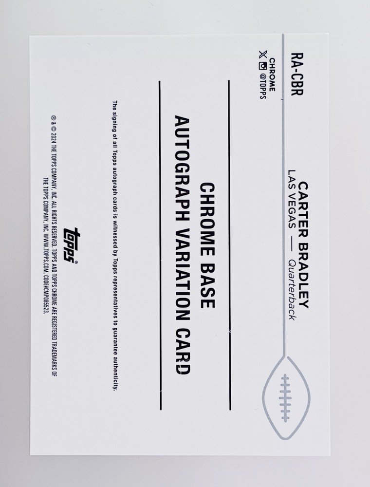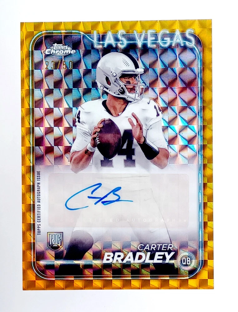 Daily auctions starting at $0.01 free shipping The product is a highly sought-after 2024 Topps Chrome Gold auto rookie trading card featuring Carter Bradley of the National Football League (NFL). Signed by Carter Bradley himself and limited to a print run of only 50, this card is a rare case hit that is sure to be a valuable addition to any football card collection. Authenticated by Topps and part of the Prizm parallel variety, this card is a standout piece for collectors looking for unique and limited edition sports memorabilia.