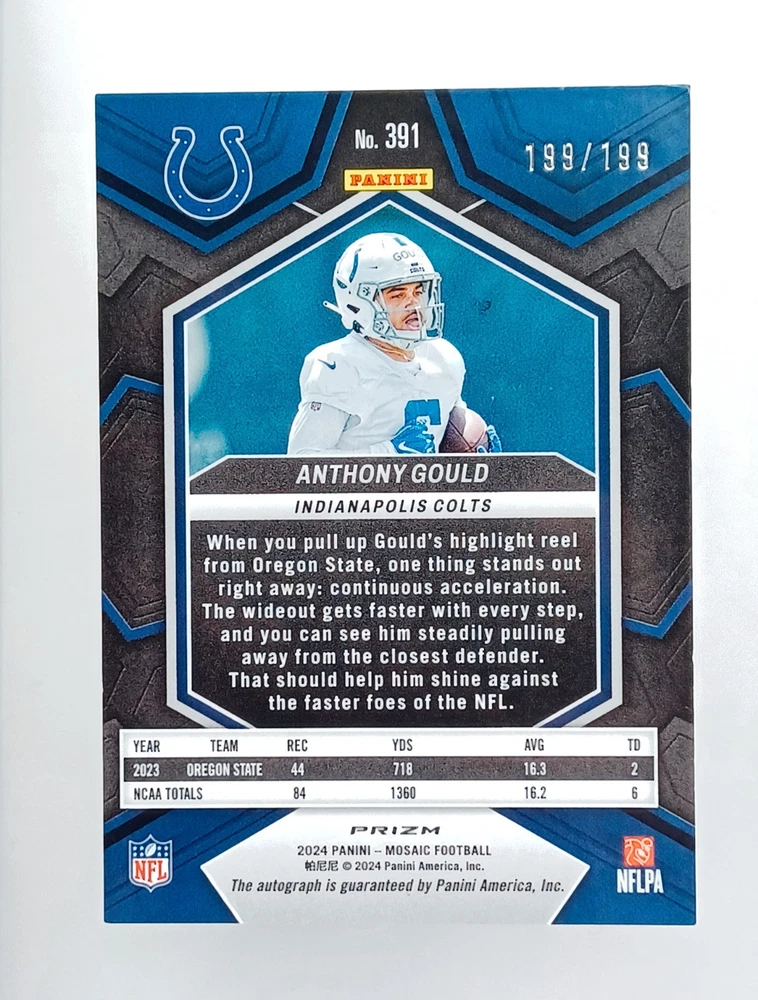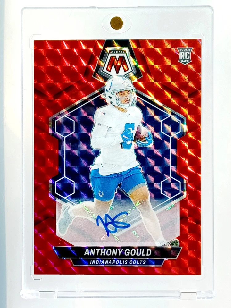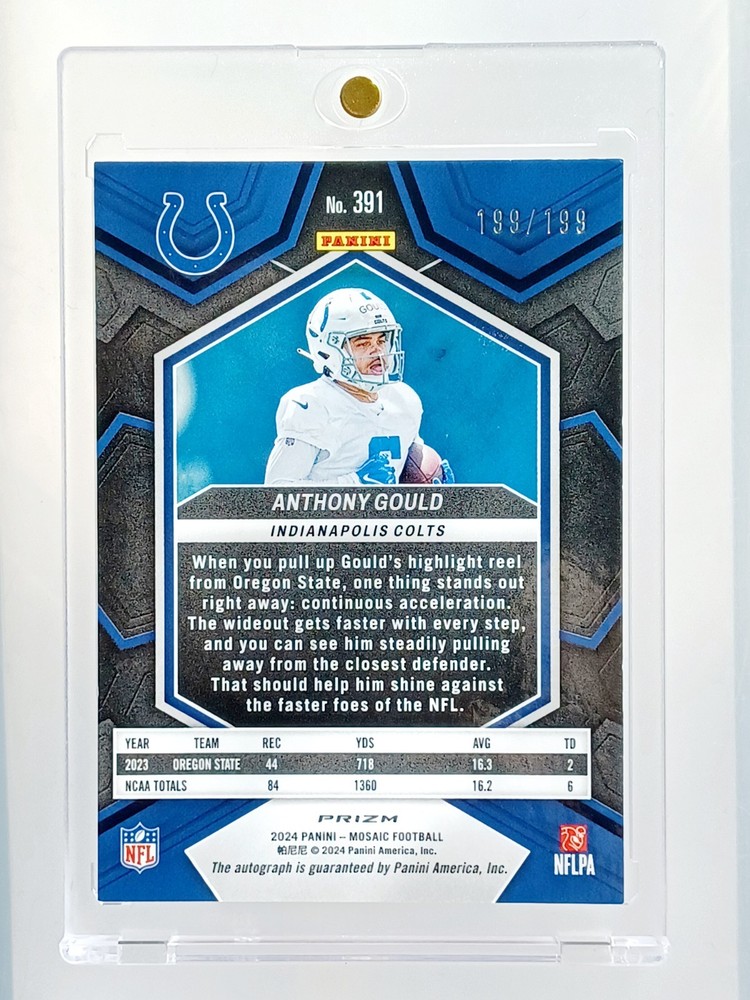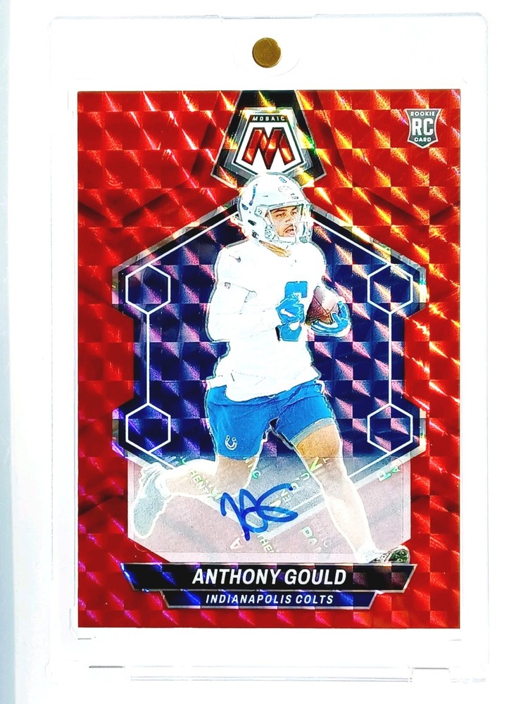 Daily auctions starting at $0.01 free shipping The product is an Anthony Gould 2024 Prizm Mosaic autographed trading card, featuring a hard-signed signature from the National Football League (NFL) player. Limited to a print run of 199, this rookie card from the 2024 Panini Mosaic set is a highly sought-after collectible for football fans and card enthusiasts. Authenticated by Panini Authentic, this card showcases the Indianapolis Colts player and is a valuable addition to any sports trading card collection. With its unique design, short print nature, and rarity, this Anthony Gould autographed card is a must-have for fans looking to complete their set.