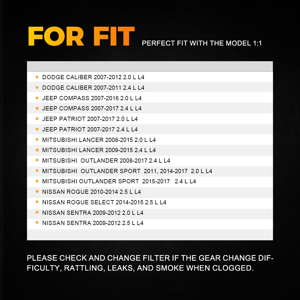 Transmission Oil Filters Fit For Dodge,Jeep,Mitsubishi,Nissan etc Specifications: OE: Auto Transmission Filter: 31728-1XF03 / 31728-1XZ0D / 31728-1XZ0A New Transmission Oil Cooler Return Filter: 31726-1XF00 / 31726-1XZ0A / 2824A006 PAN Gasket: 31397-1XF0D Material:Aluminum、Silicone Features: Superior material: The Transmission Filter is Made of High-Quality Materials,Which can Filter the Oil,Remove the Impurities,Keep the Oil Clean,Prevent the Valve Body and Other Parts of the Blockage,Which can Effectively Extend the Service Life of the Gearbox. Excellent Replacement: Auto Transmission Filter Oil Pan Gasket For Kit Nissan Rogue Altima Juke 2007-18 Transmission Oil Filters Fit For Dodge,Jeep,Mitsubishi,Nissan etc Specifications: OE: Auto Transmission Filter: 31728-1XF03 / 31728-1XZ0D / 31728-1XZ0A New Transmission Oil Cooler Return Filter: 31726-1XF00 / 31726-1XZ0A / 2824A006 PAN Gasket: 31397-1XF0D Material:Aluminum、Silicone Features: Superior material: The Transmission Filter is Made of High-Quality Materials,Which can Filter the Oil,Remove the Impurities,Keep the Oil Clean,Prevent the Valve Body and Other Parts of the Blockage,Which can Effectively Extend the Service Life of the Gearbox. Excellent Replacement: Please check and change filter if the gear change difficulty, rattling, leaks, and smoke when clogged. All tested before shipment: All products were tested for performance and to ensure the accurate parameter for your vehicle. Packaging include: 1X Auto Transmission Filter 1X Gasket 1X Transmission Oil Cooler Return Filter FITMENT: FOR DODGE | DODGE CALIBER 2007-2012 2.0 L L4 DODGE CALIBER 2007-2 Item Specifics Type Transmission Filter Placement on Vehicle Front Features Easy Installation Manufacturer Part Number WWD-BSXLQQ-56111 OE/OEM Part Number(Auto Transmission Filter) 31728-1XF03 / 31728-1XZ0D / 31728-1XZ0A OE/OEM Part Number(New Transmission Oil Cooler Return Filter) 31726-1XF00 / 31726-1XZ0A / 2824A006 PAN Gasket 31397-1XF0D Universal Fitment No Material Aluminum & Silicone Fitment Fit For Dodge,Jeep,Mitsubishi,Nissan etc Manufacturer Warranty 2 Years keyword 1 Auto Transmission Filter Oil Pan Gasket Kit keyword 2 Transmission Filter Oil Cooler Return Pan Gasket keyword 3 Transmission Filter & Gasket & Oil Cooler Filter Fits for DODGE CALIBER 2007-2012 2.0 L 2007-2011 2.4 L L4 Fits for 1 JEEP COMPASS 2007-2016 2.0 L2007-2017 2.4 L L4 Fits for 2 JEEP PATRIOT 2007-2017 2.0 L 2.4 L L4 Fits for 3 MITSUBISHI LANCER 2008-2015 2.0 L 2009-2015 2.4 L L4 Fits for 4 MITSUBISHI OUTLANDER 2008-2017 2.4 L L4 Fits for 5 MITSUBISHI OUTLANDER SPORT 2011, 2014-2017 2.0 L L4 Fits for 6 NISSAN ROGUE 2010-2014 2.5 L L4 SELECT 14-2015 2.5 L L4 Fits for 7 NISSAN SENTRA 2009-2012 2.0 L L4 2.5 L L4 Auto Transmission Filter 31728-1XF03 / 31728-1XZ0D / 31728-1XZ0A New Transmission Oil Cooler Return Filter 31726-1XF00 / 31726-1XZ0A / 2824A006 Brand Unbranded Warranty 3 Year Payment Returns DESCRIPTION PAYMENT SHIPPING RETURN POLICY CONTACT US Shop Category Store Home LED Headlight ◈ H4 ◈ H13 LED Reverse Light ◈ T15/921/W16W LED Side Marker Light Car Parts & Accessories Tail Light assemblies Other Hot Item 10ft Seal Strip Trim For Car Front Rear Windshield Sunroof Weatherstrip Rubber USD 12.34 Ignition Control Module 4 Pin HEI Distributor for GM Chevy 1974-1988 Replacement USD 12.34 Fuel Gas Door Lock Cylinder & Keys For Toyota 1995-2004 Tacoma 2000-2003 Tundra USD 13.99 New Fits 2013-20 Nissan Pathfinder Front Left & Right Outer Bumper Cover Bracket USD 16.14 REPLACEMENT Radio Touch-screen GLASS Digitizer LCD For Chevy GMC 15-18 MYLINK USD 32.99 Picture New List Item 2M PU Leather F/Car Dashboard Decor Line Strip Sticker Moulding Trim Accessories USD 9.99 9005 HB3 LED Headlight Bright Super Bulbs White 50000LM High Beam CANBUS 1-10Set USD 45.99 Carbon Fiber Steering Wheel Paddle Shifter For Honda Accord Civic Acura TL 1~10X USD 26.99 3157 3156 Signal Light LED Turn DRL Bulbs Amber White Switchback 3457 1~10Set USD 18.99 Black Rubber Car Bumper Hood Rest Bushing 2PC 2000-07 For Peterbilt 379 13-04711 USD 21.99 Help & Info Payment Policy Shipping Policy Return Policy FAQ About Us Auto Transmission Filter Oil Pan Gasket For Kit Nissan Rogue Altima Juke 2007-18 Transmission Oil Filters Fit For Dodge,Jeep,Mitsubishi,Nissan etc Specifications: OE: Auto Transmission Filter: 31728-1XF03 / 31728-1XZ0D / 31728-1XZ0A New Transmission Oil Cooler Return Filter: 31726-1XF00 / 31726-1XZ0A / 2824A006 PAN Gasket: 31397-1XF0D Material:Aluminum、Silicone Features: Superior material: The Transmission Filter is Made of High-Quality Materials,Which can Filter the Oil,Remove the Impurities,Keep the Oil Clean,Prevent the Valve Body and Other Parts of the Blockage,Which can Effectively Extend the Service Life of the Gearbox. Excellent Replacement: Please check and change filter if the gear change difficulty, rattling, leaks, and smoke when clogged. All tested before shipment: All products were tested for performance and to ensure the accurate parameter for your vehicle. Packaging include: 1X Auto Transmission Filter 1X Gasket 1X Transmission Oil Cooler Return Filter FITMENT: FOR DODGE | DODGE CALIBER 2007-2012 2.0 L L4 DODGE CALIBER 2007-2 Payment Returns All rights reserved. On Dec 9, 2025 at 19:23:58 PST, seller added the following information: