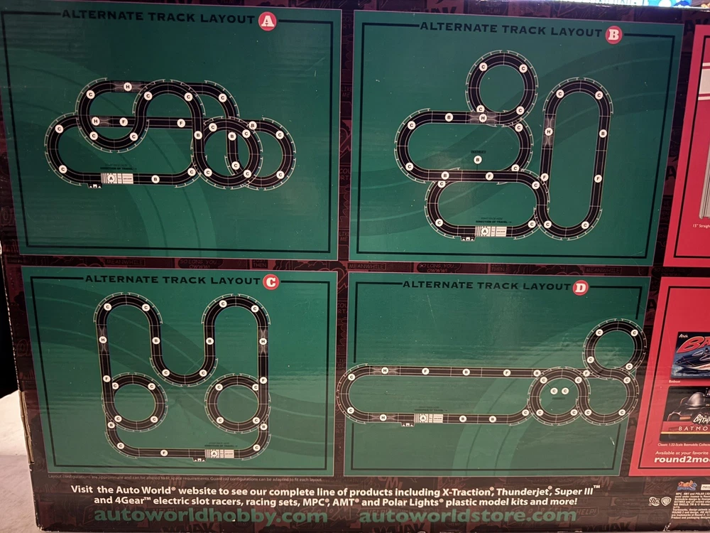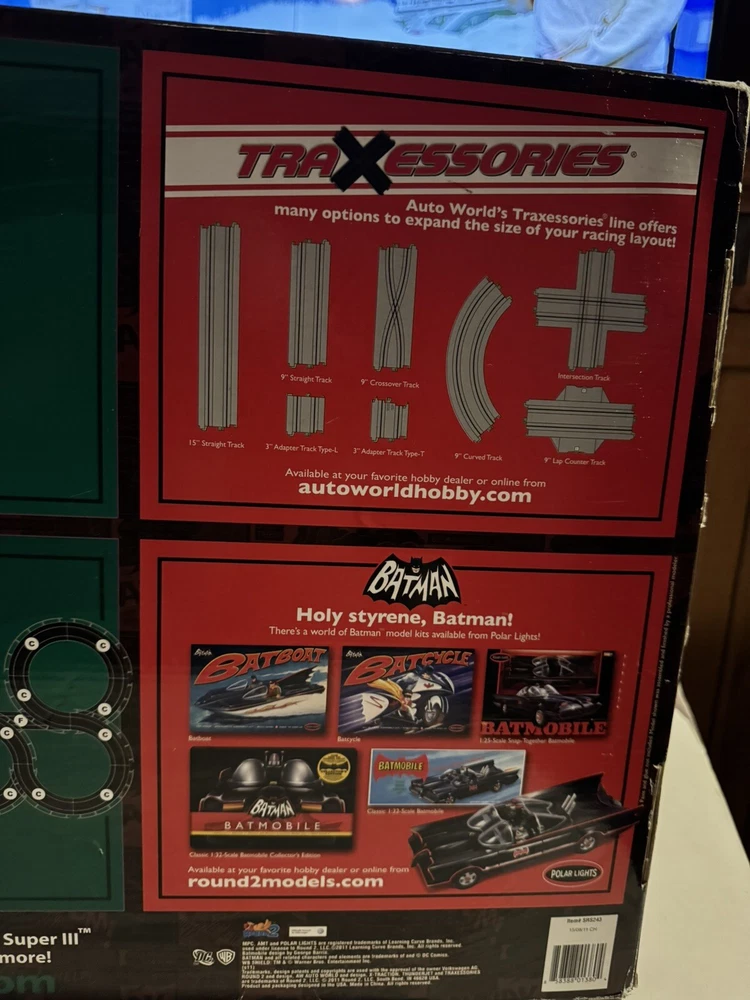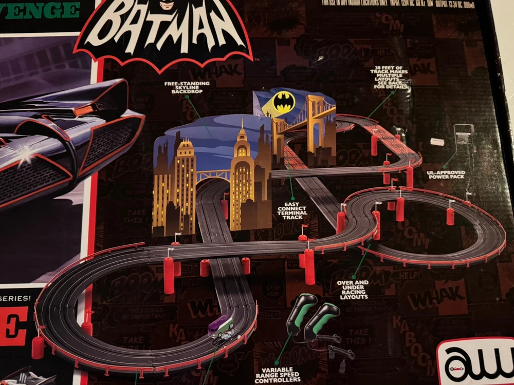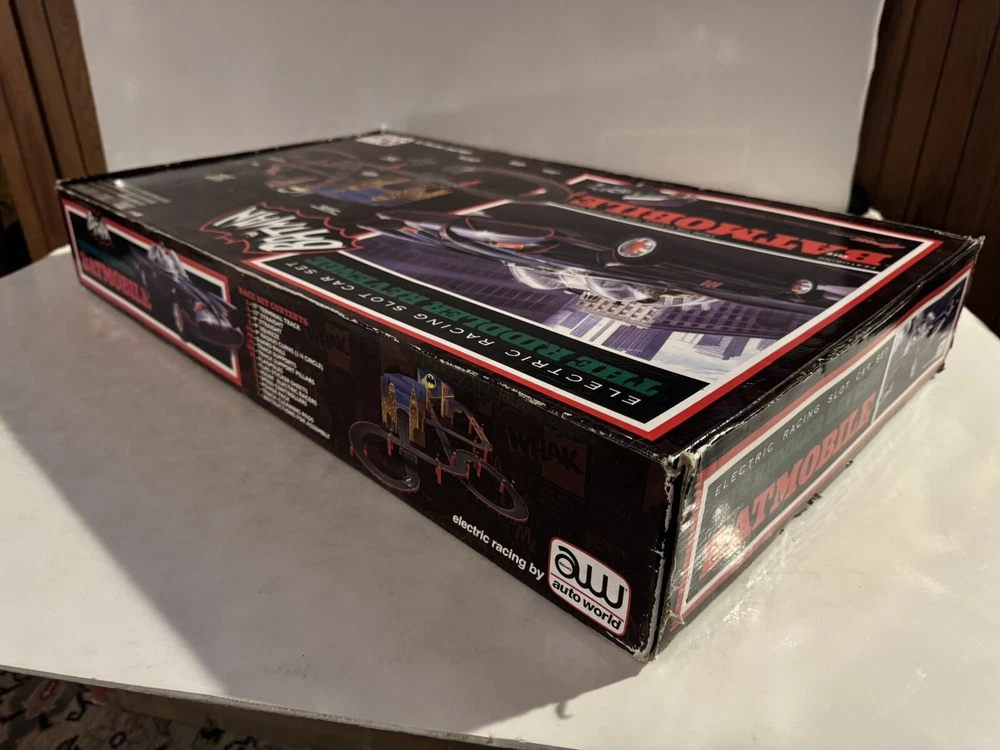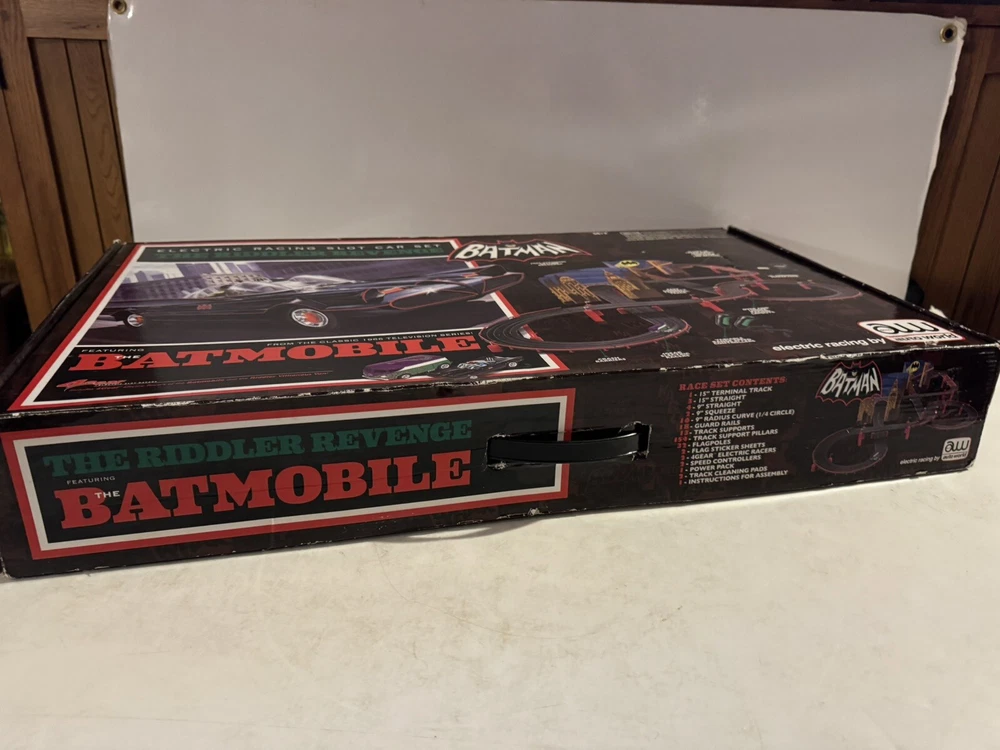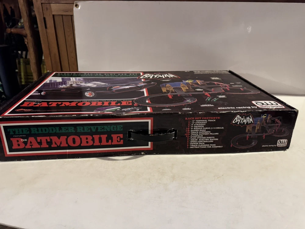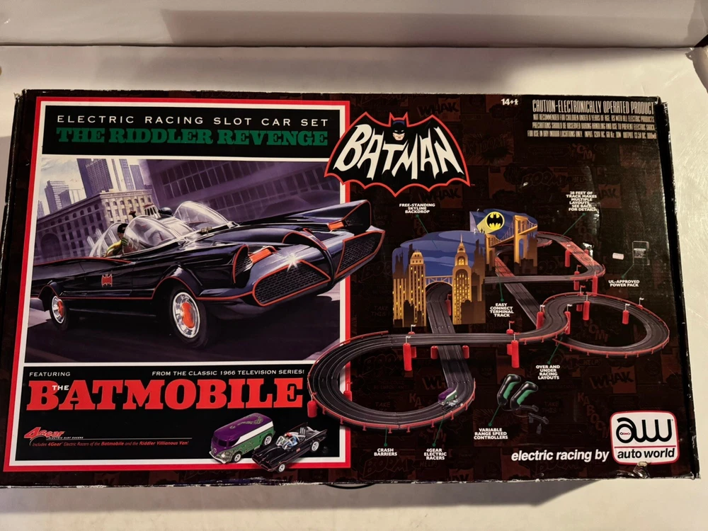 The Auto World electric racing HO Slot Car Set is new in set box, all parts in factory packing. Featuring “The Riddlers Revenge” Batmobile and Riddler VW Bus. The set box has some edge ware. See pictures for more details.