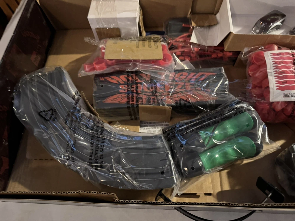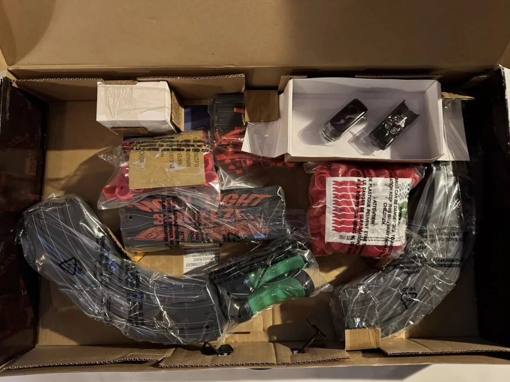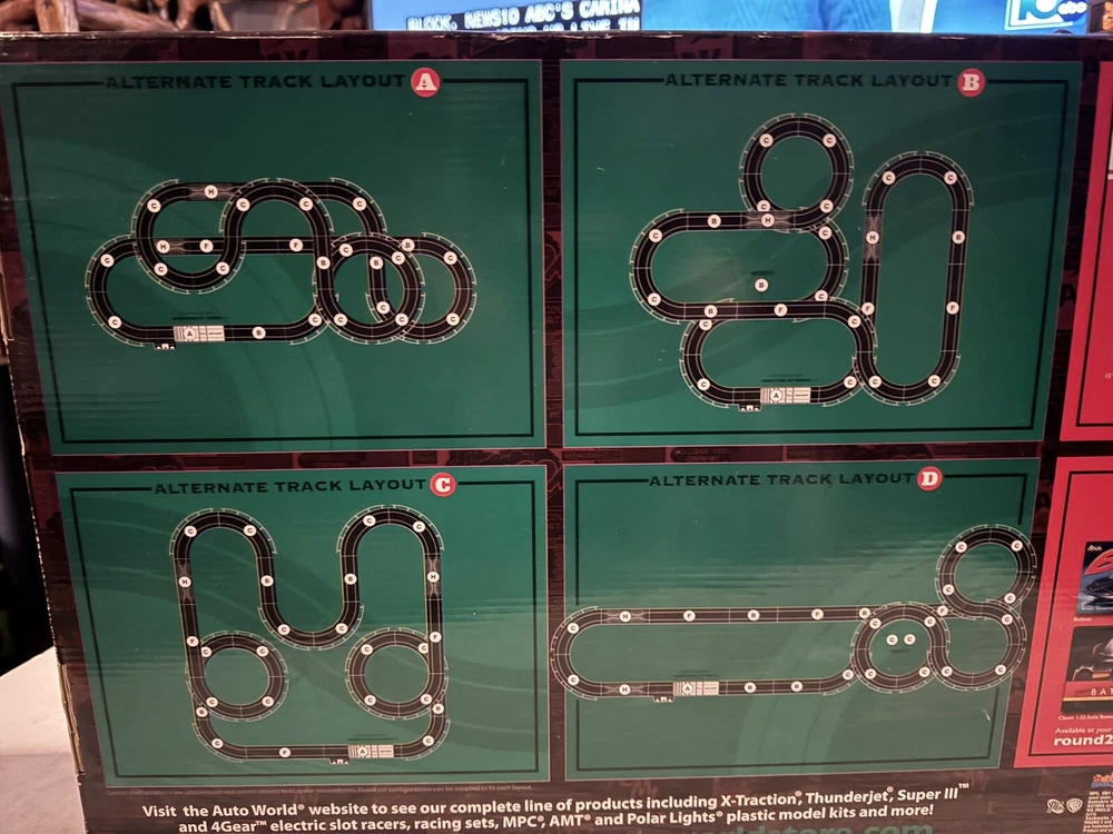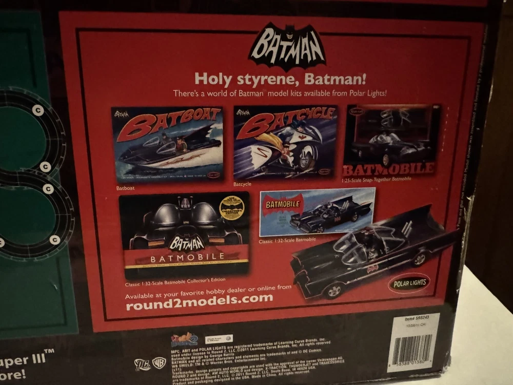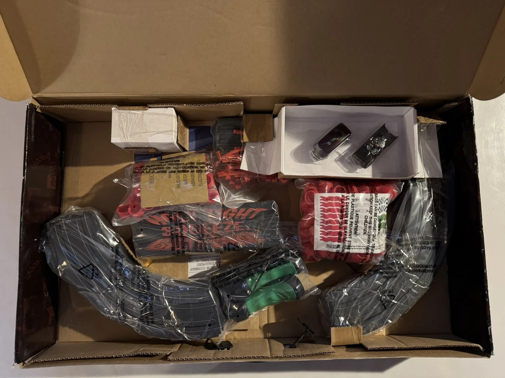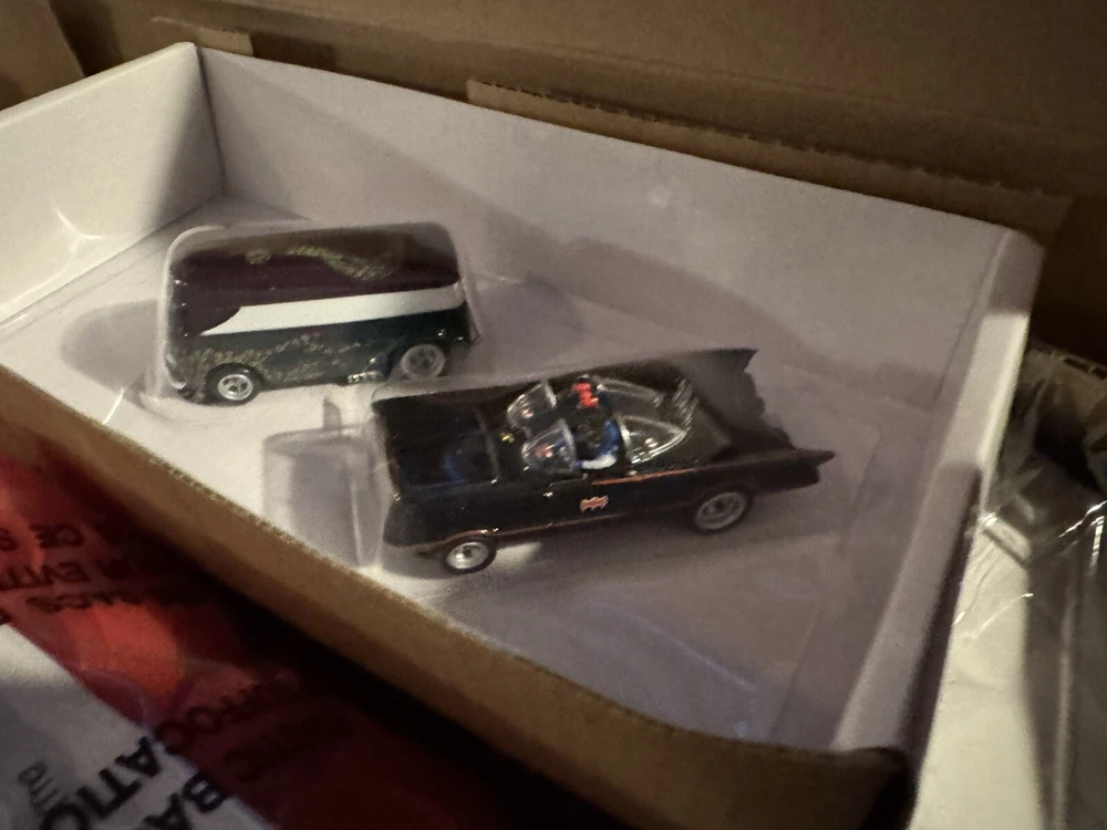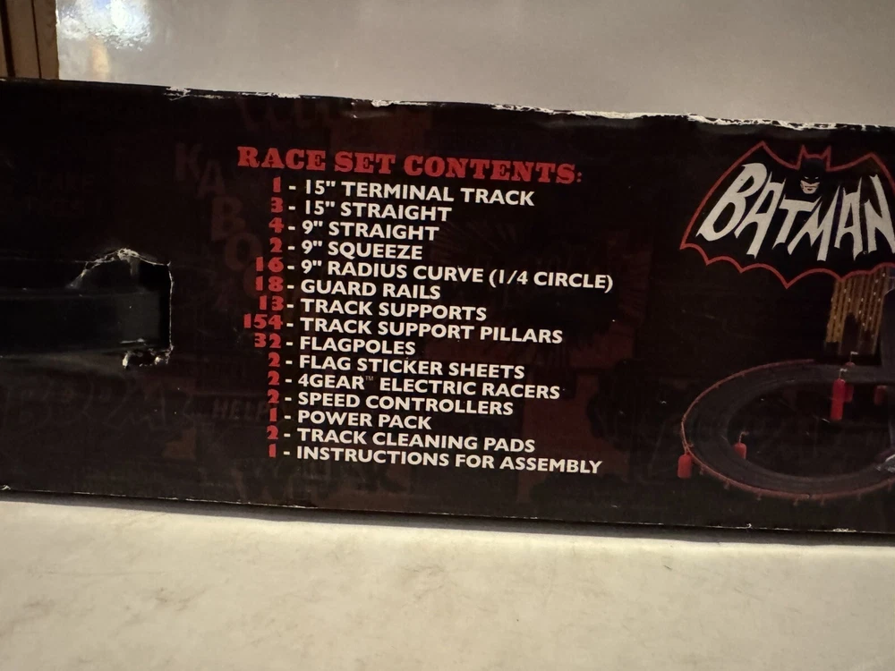 The Auto World electric racing HO Slot Car Set is new in set box, all parts in factory packing. Featuring “The Riddlers Revenge” Batmobile and Riddler VW Bus. The set box has some edge ware. See pictures for more details.