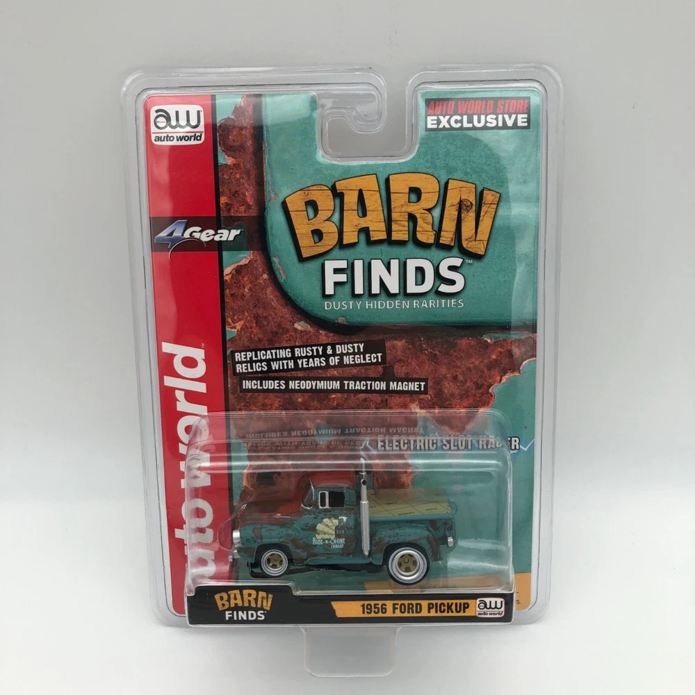 This is a rare, new, HO scale 1956 Ford Pickup slot car from Auto World's Barn Finds series. 4 gear, it's a unique find for collectors and hobbyists alike. • HO scale • 1956 Ford Pickup • Part of Auto World's Barn Finds series • Rare, new • 4 gear slot car Condition: New With Tags