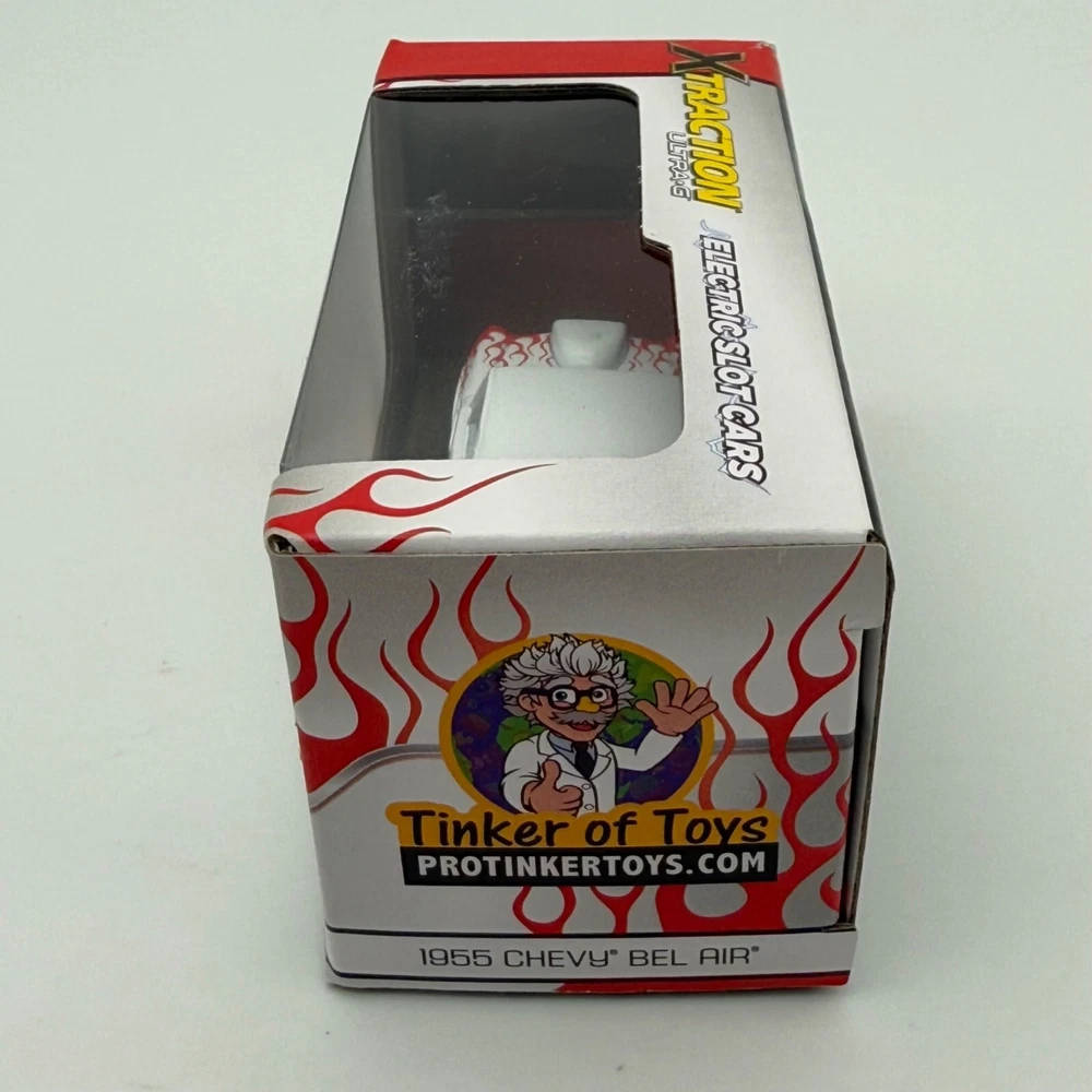 Auto World Xtraction Ultra-G 1955 Chevy Bel Air HO Slot Car New White Red Flames • 1955 Chevy Bel Air • HO scale slot car • White with red flame accents • Auto World • Xtraction Ultra-G