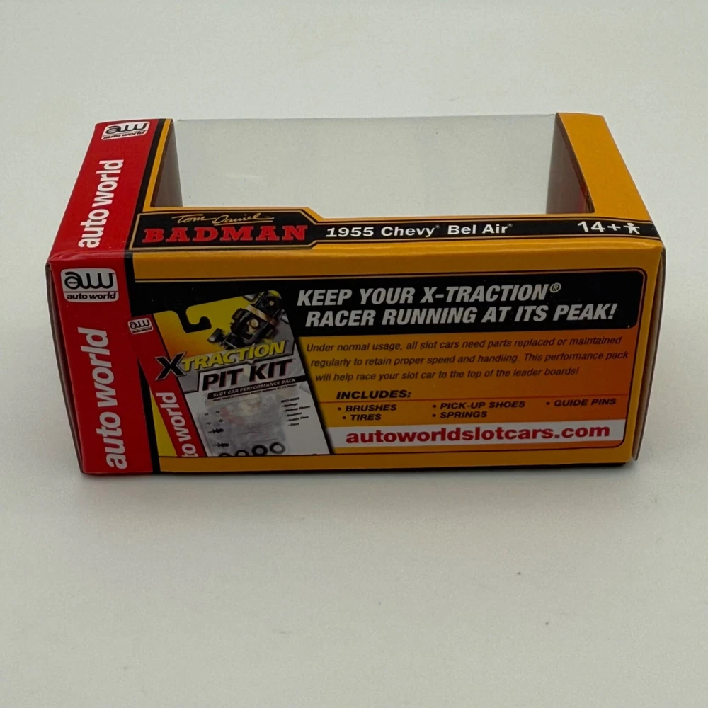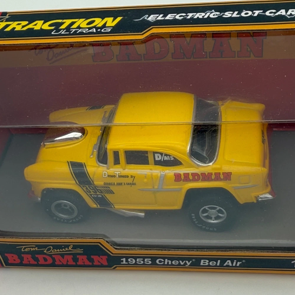 Auto World Xtraction Ultra-G 1955 Chevy Bel Air Tom Daniel Badman HO Slot Car • HO slot car • Detailed 1955 Chevy Bel Air • Ultra-G chassis for improved traction • Tom Daniel Badman • Yellow with Black Stripe Condition: New With Box New in Box