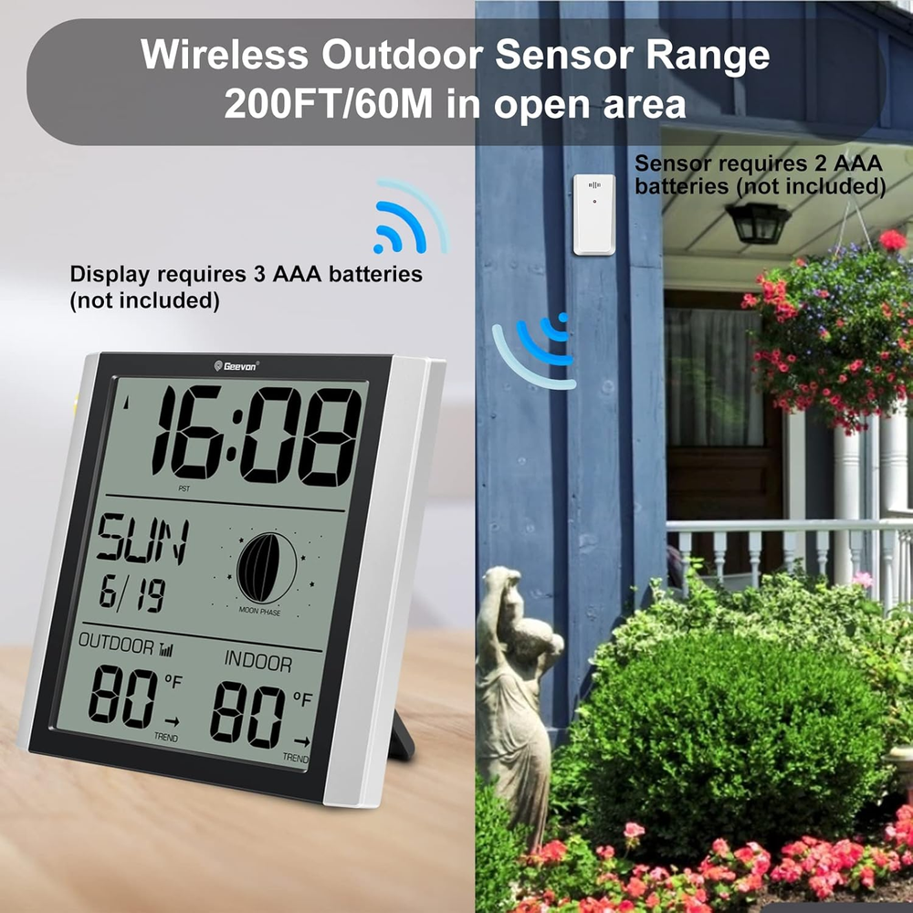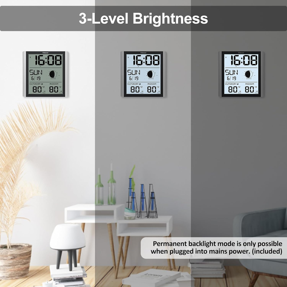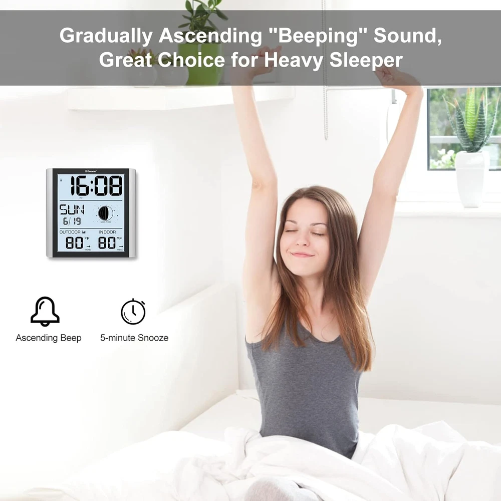 Store New Arrivals Add to Favorite View Feedback Contact Atomic Wall Clock with Backlight, Auto-Set Digital Atomic Clock with Indoor Outdoor Temperature,Calendar,Moon Phase for Home Office Elderly(1 Wireless Outdoor Sensor) Description Item model number GN-228614-T2 Style Contemporary Are Batteries Included No Power Source Power Cord /Battery Operated Upper Temperature Rating 1.4E+2 Degrees Fahrenheit Country of Origin China Product Dimensions 1.7"D x 7.87"W x 7.75"H Material Acrylonitrile Butadiene Styrene (ABS) Shape Rectangular Number of Batteries 3 AAA batteries required. Specific Uses For Product Temperature, DST, Moon Phase, Time, Date Included Components Main Unit, Wireless Outdoor Sensor, Power Cord Item Weight 1.57 pounds Connectivity Technology 433 MHz or 868 MHz Special Feature function(f) {var _np=(window.P._namespace("DetailPageProductOverviewTemplatesJava"));if(_np.guardFatal){_np.guardFatal(f)(_np);}else{f(_np);}}(function(P) { P.when('A').execute(function(A){ A.on('a:truncate:po-attribute-truncate-4:updated', function(data) { var isTruncated = !data.truncateInstance.getIfTextFits(); var seeMoreElement = document.getElementById('po-attribute-see-more-id-4'); if(seeMoreElement) { seeMoreElement.style.display = isTruncated ? '' : 'none'; } }) }); })); Atomic Clock, Backlight (Adjustable), Wall Clock & Desk Clock, Gradually Ascending "Beeping" Alarm Noise for Heavy Sleeper, Indoor & Outdoor Temperature See more Display Type LCD Color Backlight Sensor Technology Capacitive Batteries 3 AAA batteries required. Recommended Uses For Product Office, Garden, Restaurant, Kitchen, Library, Home 【8.8'' Large Digital Atomic Clock with Backlight】Large atomic wall clock battery operated with an 8.8'' LCD TN high definition slim display, can simultaneously display date, time (12/24H), week,moon phase,indoor&outdoor temperature(° C/° F),records the daily MIN & MAX data and display tendency.And the digits are big enough for easy-viewing.If you would like the backlight to stay on, please plug in the power cord (included). 【Atomic Clock with Indoor/Outdoor Temperature 】Digital atomic wall clock with temperature monitor function,The Wireless outdoor sensor (included) transmits the outdoor temperature ( ° C /° F optional)to the digital wall clock large display. Which means you can put them inside your patio, backyard, garden or courtyard,easily monitor outside conditions without going out. 【Enhanced Atomic Clock Technology】Battery powered atomic clock will always be accurate to within one second as it receives daily WWVB updates, just select your time zone (7 time zone)at the setting buttons of the clock and turn on the DST if applicable. Automatically updates for daylight saving time,weekday,day,month,time,help you manage regular life. 【Atomic Alarm Clock with Snooze Function】Not only a Calendar and Thermometer, but also can be used as a loud alarm clock. When the alarm goes off,atomic digital clock with day and date will send out a gradually ascending "beeping" sound to wake you up. Before the alarm stops itself, press the "SNOOZE" button to get an extra 5-minute nap. Perfectly designed for heavy sleepers. (NOTE: The alarm goes off for 2 minutes, and if there is no action during this period, it will no longer continue to alarm.) 【Digital Wall Clock & Atomic Desk Clock】Our atomic weather clock features 2 hanging holes and a kickstand, can not only be placed on the nightstand, but also hung on the wall. The bold, simple styled silver bezel of the clock gives it a modern look, with a classic feel. Perfect for any room in the house, office, bedroom, closet, classroom or living room. Product Description 1.Please kindly make sure if you set the correct time zone for the atomic clock. 2.Please confirm whether you have turned on the daylight saving time function (If you don’t need this feature, please turn it off) Package Contents: 1. Geevon Atomic Clock (Use 3 AAA batteries, not included) 2. Outdoor Temperature Sensor (Use 2 AAA batteries, not included) 3. Power Adapter (Length: 80 Inches) 4. Instructions Manual Radio controlled signal: WWVB Temperature measuring unit: °C / °F Indoor / outdoor temperature: 1.Indoor temperature 0°C – 50°C (32°F – 122°F) 2.Outdoor temperature-30°C – 70°C (-22°F – 158°F) Geevon 228614C Atomic Wall Clock with Indoor & Outdoor Temperature and Backlight Easy to Read - Easy to Use - Permanent Backlight --Time, Month, Date, Day and Moon Phase are clearly shown and using radio frequencies broadcasted from NIST’s Colorado atomic clock. Geevon atomic alarm clock will receive the signal within the broadcast range anywhere an AM signal can be received; generally, the time signal cannot be picked up in massive metal and concrete structures unless near a window. Choose between EST AST HAST AKST PST MST CST with option to turn on or off Daylight Savings Time. (Atomic feature only functions in North America). In addition, some environmental effects may affect the transmitting distance and reception. For more information, please refer to the WWVB web page of NIST. Temperature accuracy: -40°C ~ -20°C: ± 4°C;-20°C ~ 0°C: ± 2°C;0°C ~ +50°C: ±1°C Note: when the temperature in 50°C ~ 70°C range, the temperature is only for reference. 3 Dimmer Levels & Permanent backlight 1.Permanent backlight mode is only possible when plugged into power supply. Touch top button of the clock to adjust the clock brightness( Off - Dim - Bright ) 2.Please note that in order to prevent reception interference, all buttons are temporarily unavailable when the atomic clock is receiving the signal (the whole process may last 1-2 minutes). To ensure accurate signal reception, the backlight will temporarily turn off. Once the atomic clock wall receives the signal, Everything is back to normal. 3.When the Atomic wall/desk clock is only powered by the battery,touch the top button to turn on the backlight.(Automatically turn off after 10 seconds) Alarm with Sn