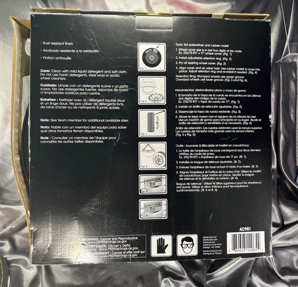 Brand: Autocraft Features: Car Wash Safe, Easy to Install, Lightweight Finish: Metallic OE/OEM Part Number: Not Applicable Type: Hub Cap Material: Plastic Number in Pack: 4 Color: Dark Gray Almost Black Seller Notes: “New, box opened for photos only. Product unused.” Placement on Vehicle: Front, Rear gtin13: 0889603140654 Manufacturer Part Number: AC981 UPC: 0889603140654 Compatible Wheel Diameter: 17 in