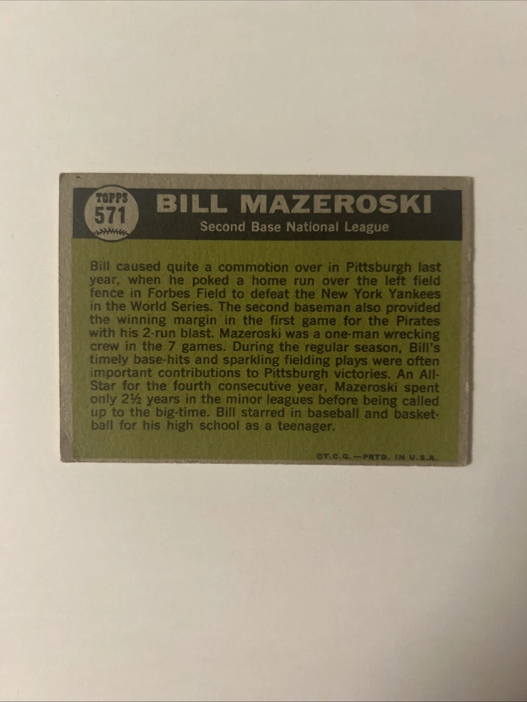 The product is an autographed 1961 Topps Bill Mazeroski baseball card from the Pittsburgh Pirates. This card is part of the 1961 Topps set and features Bill Mazeroski, signed by the player himself. It is a sports trading card specifically for Major League Baseball, showcasing Mazeroski as a player for the Pittsburgh Pirates during the 1961 season. This collectible item is a valuable piece for fans and collectors of baseball memorabilia.