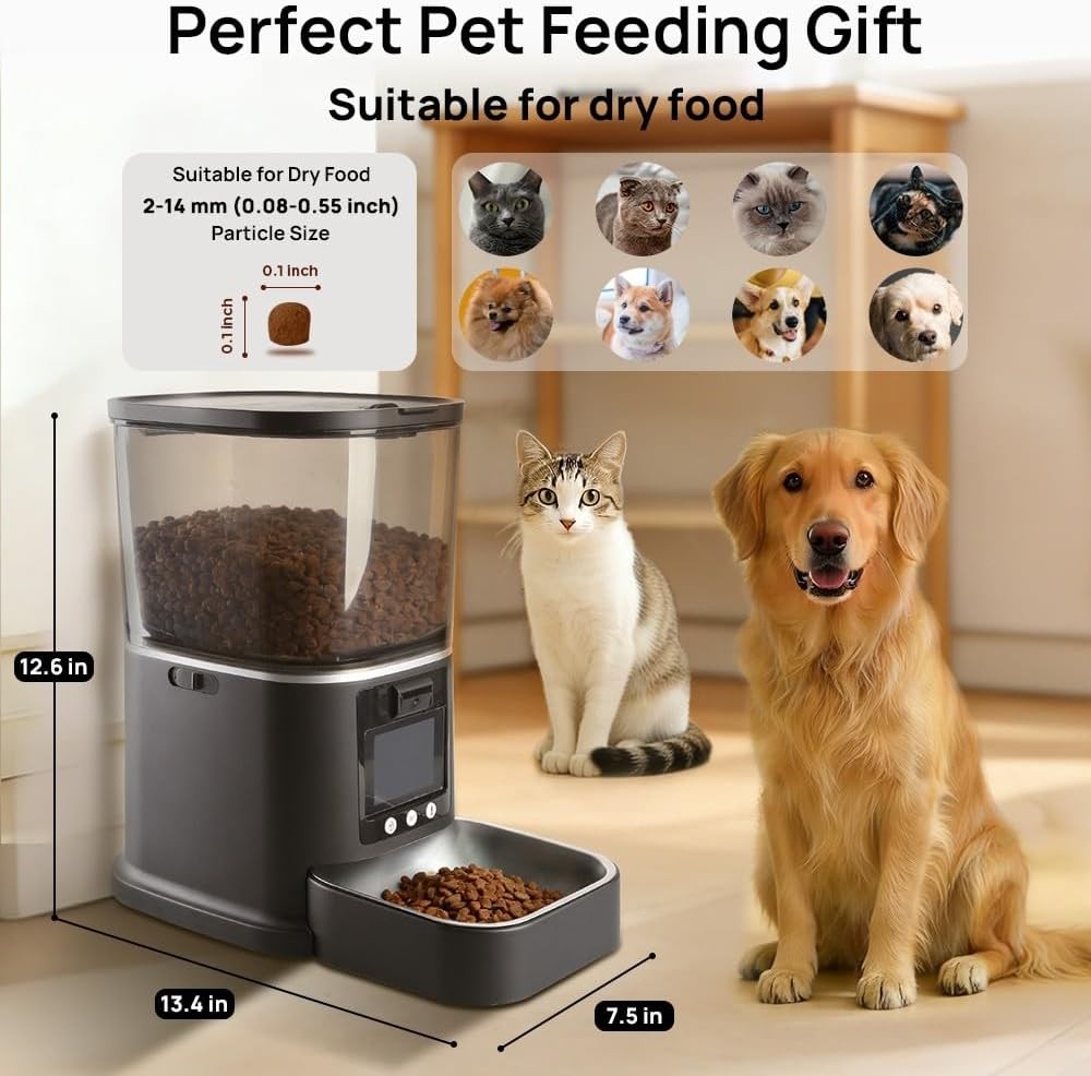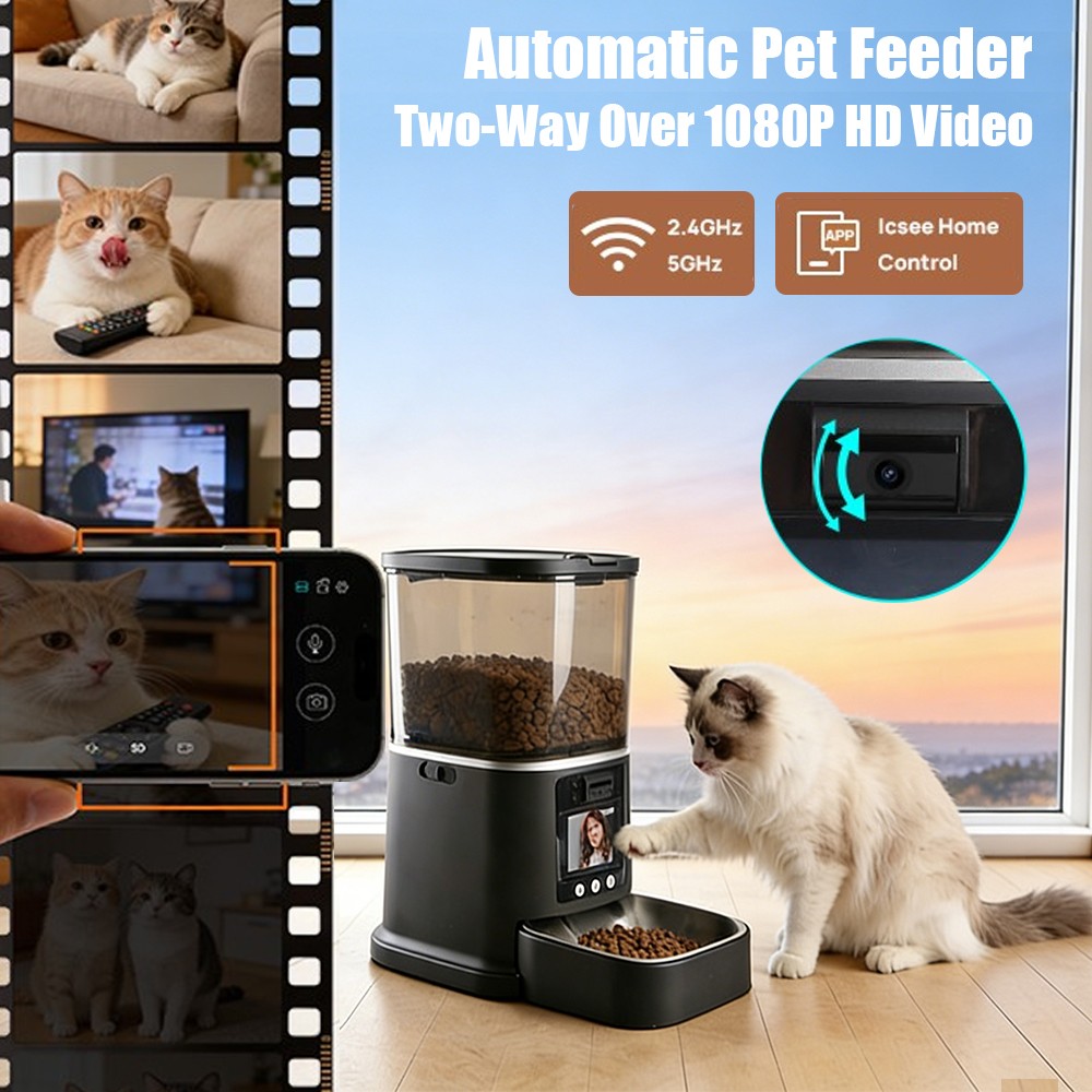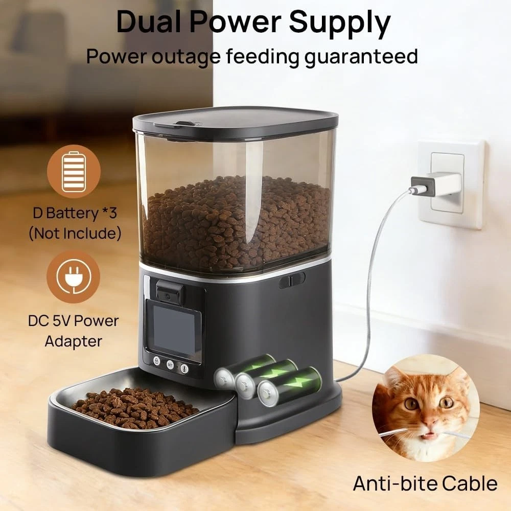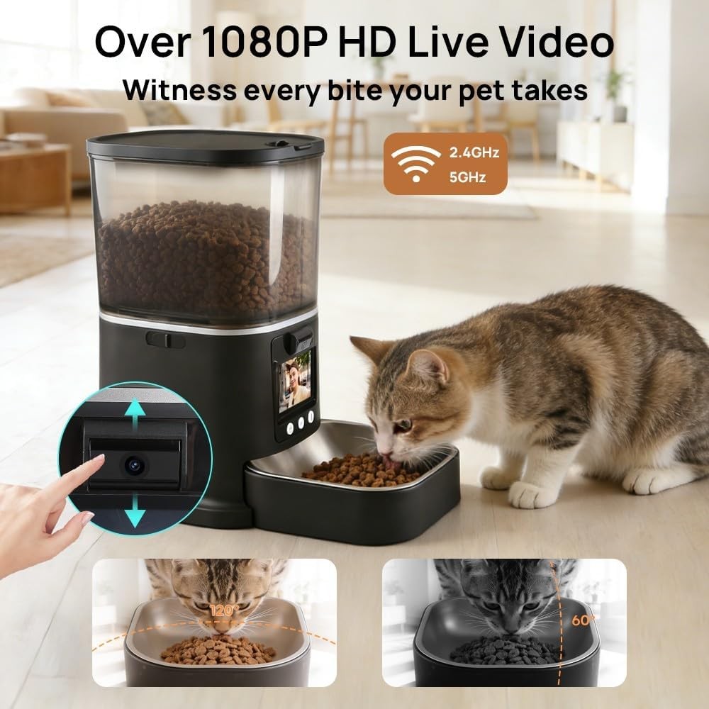 Features two Way Video and Audio Interaction Unlike standard feeders this unit features a screen on the front so your pet can see your face while you hear and speak to them in real time High Definition Camera with Night Vision Features a one hundred fifty degree adjustable camera up down for wide angle monitoring and clear Night Vision to check on your pet in the dark Stable five G and two point four G WiFi Supports dual band WiFi for a faster more stable connection ensuring uninterrupted monitoring and control Handles Freeze Dried Food The anti jam mechanism is robust enough to dispense varied food types including staple kibble freeze dried treats and complete freeze dried meals without getting stuck Quadruple Freshness Lock Keeps food fresh with a four part system a lockable top with a full airtight seal a built in desiccant box a sealing strip and a unique auto closing food outlet to prevent oxidation and bugs Dual Power Supply Never worry about power outages This unit runs on a wall adapter and has a battery backup system batteries not included to ensure feeding schedules continue even if power or WiFi fails App Control and Scheduling Use the mobile app to set timed feeding plans portion control and view the live video feed anytime Mischief Proof Design Features a chew proof cord an L shaped plug that wont pull out easily a lockable lid to prevent spills if knocked over and a secure feeding port to stop sneaky snacking Specifications Capacity five Liters Large Capacity Connectivity two point four GHz and five GHz WiFi Camera HD with Night Vision and one hundred fifty degree Tilt Bowl Material Stainless Steel Detachable and Washable Food Compatibility Dry Kibble and Freeze Dried Mixes Power AC Adapter plus Battery Backup Whats in the Box one Smart Automatic Feeder with Camera one Stainless Steel Food Bowl one Power Adapter with Chew Proof Cord one User Manual