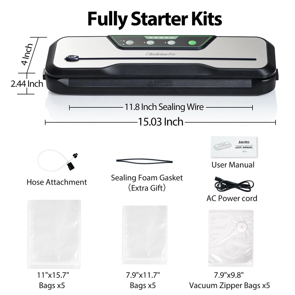 Vacuum Sealer Machine, 80KPa 8-In-1 Food Vacuum Saver with Starter Kits | 15 Bags, Pulse Function, Moist&Dry Mode and External VAC for Jars and Containers, Compact & Powerful 【80kPa Powerful Suction & 8X Freshness】80kPa upgraded powerful vacuum pump provides strong suction, along with advanced sealing technology, keeping your food fresh for up to 8X times longer, protecting your food from freezer burn and saving your money & fridge space. 【8-In-1 Includes Pulse & Ext-Vac & Cutter】Pulse- Manually control the vacuum pressure; Moist & Dry Modes - Maximize freshness for different types of food; Vac Seal- One touch operation; External VAC- for jars, canisters and wine preservation; Build in cutter- Easily customize bag size; Seal- Quick seal only; Stop- Cancel the current process at any time. 【Full Starter Kits Includes Reusable Zipper Bags】Everything you need to start your food-saving journey. Package includes 15 Bags and More: 10xHeat-seal Bags (11"*15.7" x 5pcs, 7.8"*11.8" x 5pcs), 5 x Reusable Vacuum Zipper Bags(9.9"*7.9"), 1 x Extra Gasket Replacement, 1 x External Air Suction Hose, 1 x Vacuum Sealer Machine , 1 x User Manual, 1x AC Power Cord. 【Compact Design & Easy to Clean】15.03"x4.00"x2.44" compact design saves countertop space; 11.8" maximum sealing length allows you to seal multiple bags in one sealing time; Stainless steel and ABS material, easier for you to clean. 【Pro Quality & Warranty】Meet ETL safety standards. offers 1-year warranty and technical consultation. Please feel free to contact us and all problems will be solved within 24 working hours.