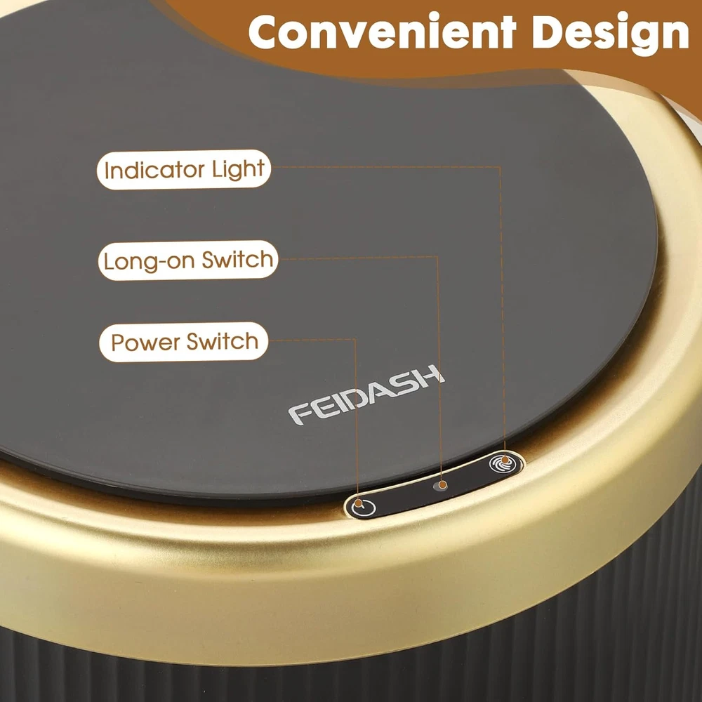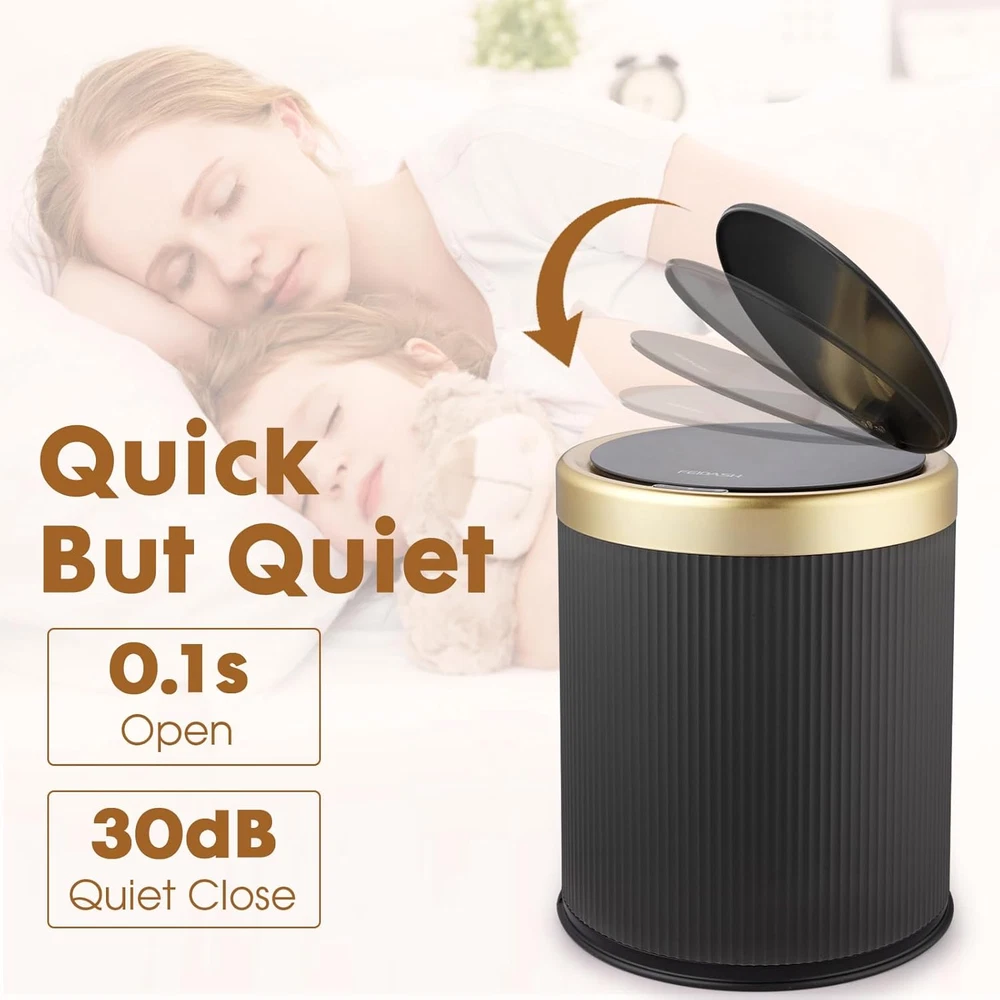【 Motion Sensor Trash Can 】 This touchless trash can features an advanced motion sensor with an upgraded 25cm sensing distance, allowing easy opening with your hand or knee. The automatic bathroom trash can’s lid opens within 0.1 seconds and automatically closes 5 seconds when no object moves. Touchless, convenient, make your life easier. Requires 2 AA batteries (not included) for operation. 【 Modern & Functional 】 This bathroom trash can features a modern striped barrel body with gold trim. 5.31in large opening design, one button for long-opening, prevent spills and lid banging, easy to dump. 9.25x10.8in motion sensor trash can bathroom size fits well in bathrooms, bedrooms, living rooms, offices, and more. And the smart garbage can sensor capacity of 2.8 gallons meets everyday life's needs effectively. 【 Clean & Convenient 】 The lidded design of this motion trash can effectively covers unpleasant odors and keeps indoor air fresh. And the touchless bathroom trash can removable liner securely hides and holds the garbage bag, preventing it from slipping or hanging, ensuring a neat and tidy appearance and creating a pleasant indoor environment. Additionally, its easy to disassemble and wash. 【 Durable & Quiet 】This trash can with lid is made of high-quality ABS material, which is sturdy and durable. IPX6 waterproof, suitable for the wet environment of the bathroom. The gary bathroom trash can with lid opens and closes quietly, ensuring you won't disturb others. 【 At Your Service 】Efect after-sales service to provide you with all-round services. If you encounter any issues regarding the quality of the trash motion sensor or damage during transit, please feel free to contact us, and we will reply you within 24 hours. Product Description 1 Bathroom 2 Bedroom 3 Living Room 4 Office MOTION SENSOR TRASH CAN WITH LID Quality Materials This trash can is made of high-quality ABS material, which is sturdy and durable, the lidded design of this trash can with lid effectively covers unpleasant odors and keeps indoor air fresh. Convenient Design The removable liner securely hides and holds the garbage bag, preventing it from slipping or hanging, ensuring a neat and tidy appearance and creating a pleasant indoor environment. Automatic Trash Can Different Options Gray Color White Leg Automatic Open mode Automatic 2.8 Gallon Capacity 2.8 Gallon Battery Gray Color Green Leg Automatic Open mode Automatic 2.8 Gallon Capacity 2.8 Gallon Battery Gray Color White Leg Automatic Open mode Automatic 2.8 Gallon Capacity 3 Gallon Battery Gray Color Green Leg Automatic Open mode Automatic 2.8 Gallon Capacity 3 Gallon Battery Automatic Trash Can Automatic Trash Can Touchless Garbage Bin Touchless Garbage Bin