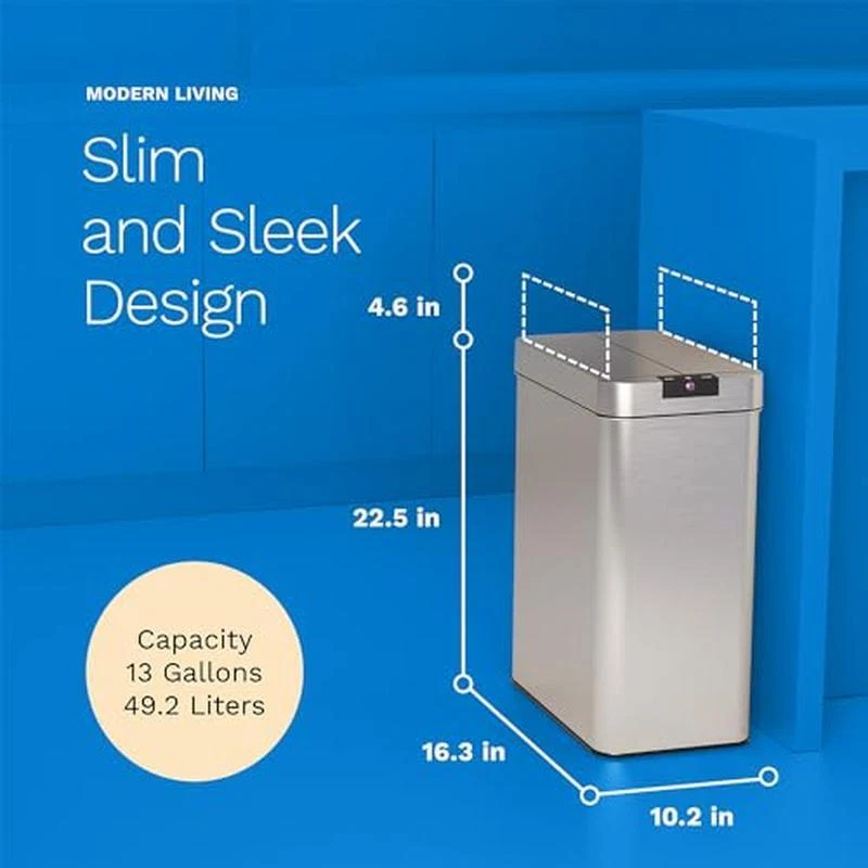 3 Ton Bottle Jack All-in-One 6000 Pound Jackstand Car Lift Heavy Duty Vehicle US 116.08 USD 123.49 USD Free shipping 6% off Outdoor Freestanding Patio Space Heaters Propane Gas Stainless Steel 48000 BTU 207.18 USD 220.4 USD Free shipping 6% off Flexzilla Garden Hose 5/8 in. x 100 ft., Heavy Dut 77.32 USD 82.25 USD Free shipping 6% off 3 Tier Folding Bookcase Stackable Solid Wood Sturdy Shelves Storage Espresso US 83.04 USD 88.34 USD Free shipping 6% off Commercial Electric Meat Slicer Deli Food Slicer w/ Removable 8.5" Blade Cheese 173.38 USD 184.45 USD Free shipping 6% off 50 Gal Stacker Tote Plastic Storage Boxes Channeled Heavy Duty Latches Bin 3 Pcs 122.75 USD 130.58 USD Free shipping 6% off Glider Rocking Chair Ottoman Cushion Set Recliner Furniture Baby Nursery Seat US 195.9 USD 208.4 USD Free shipping 6% off 3500 GPH 1HP Submersible Water Pump W/ Float Switch Garden Pond Flood Irrigation 67.67 USD 71.99 USD Free shipping 6% off 3 Tier Heavy Duty Utility Cart Wire Rolling Service Cart w/ Handle Bar Shelf New 90.23 USD 95.99 USD Free shipping 6% off Resin Deck Box Storage Organization Patio Furniture Outdoor Cushions 71 Gallon 217.43 USD 231.31 USD Free shipping 6% off Digital Wall Mount Safe Flat Electronic Anti-Theft Touchpad Home Office Security 122.14 USD 129.94 USD Free shipping 6% off Automotive Marine Battery Charger Waterproof W/ Extra-long cable Fully Automatic 52.6 USD 55.96 USD Free shipping 6% off About this item Who knew you could get rid of your trash without getting your hands dirty? Our amazing automatic trash can uses infrared technology, opening the bin lid when motion is detected within 6 inches, to protect you from other icky things Our slim and stylish 13-gallon kitchen trash can measures 16. 2 x 10. 3 x 22. 5 inches (41. 1 x 26. 2 x 57. 2 cm) and is built with stainless steel for a durable, hygienic and easy-to-clean finish Split doors provide for greater clearance under low countertops. The impressive infrared sensor features 90° swiveling sensor ball that can be adjusted for top or side activation. There is also the option to use manual Open and Close buttons for manual operation The top lid of this advanced home trash bin is designed with a battery holder, power jack and switch. Choose with either 4 new C Cell Alkaline batteries (not included) or use our official AC adapter (sold separately) with an output of 5. 9V/500mA to operate The smart bag retainer ring keeps the garbage bag hidden for a cleaner view and effortless bag removal. A smooth interior allows easy removal of any debris and makes cleaning a breeze Brand:hOmeLabs Capacity:50 Liters Color:Stainless Steel Opening Mechanism:Motion-Sensor Material:Stainless Steel Recommended Uses For Product:Kitchen Room Type:Kitchen, Bedroom, Home Office, Dining Room : : : You may also like Dining Chairs Kitchen Room Wood Back Modern, Set of 2, Autumn Lane Back Black US 140.17 USD 149.12 USD Free shipping 6% off Rectangular 10ft Patio Umbrella w/ Crank Push Button Tilt 6 Ribs Garden Outdoor 91.24 USD 97.06 USD Free shipping 6% off Toy Piano 25 Keys Keyboard Kids Children Grand Solid Wood Baby Learn-To-Play US 107.87 USD 114.75 USD Free shipping 6% off Dining Chairs Set of 4 Kitchen Room Wood Seat Metal Leg Stackable Modern, Black 195.9 USD 208.4 USD Free shipping 6% off Adjustable Bar Stools Kitchen Midback Faux Leather Steel 360 Degree Swivel 2 Pc 138.08 USD 146.89 USD Free shipping 6% off Modern 3-Shelf Microwave Cabinet Washed Oak Kitchen Dining Furniture Pantry New 154.22 USD 164.06 USD Free shipping 6% off Fireplace TV Stands Walnut Media Devices Stand Home Living Room Furniture Wood 97.2 USD 103.4 USD Free shipping 6% off Flexible Camper/RV Power Cord Power Grip Handle Heavy Duty 10 Gauge Wire 25 Ft 111.16 USD 118.25 USD Free shipping 6% off Camping Rotisserie Grills Adjustable Outdoor Heavy Duty Stainless Steel Durable 84.47 USD 89.86 USD Free shipping 6% off Cordless Axial Leaf Blower W/ Nozzle Outdoor Power Equipment Debris Remove 24 V 109.89 USD 116.9 USD Free shipping 6% off Guinea Habitat Guinea Pig Home Cage Leak-proof Washable Indoor Outdoor 84.5 USD 89.89 USD Free shipping 6% off Mini Barrel Charcoal Grill W/ Side Shelf Fish Vegetables Steel Cooking Grid 26In 97.2 USD 103.4 USD Free shipping 6% off
