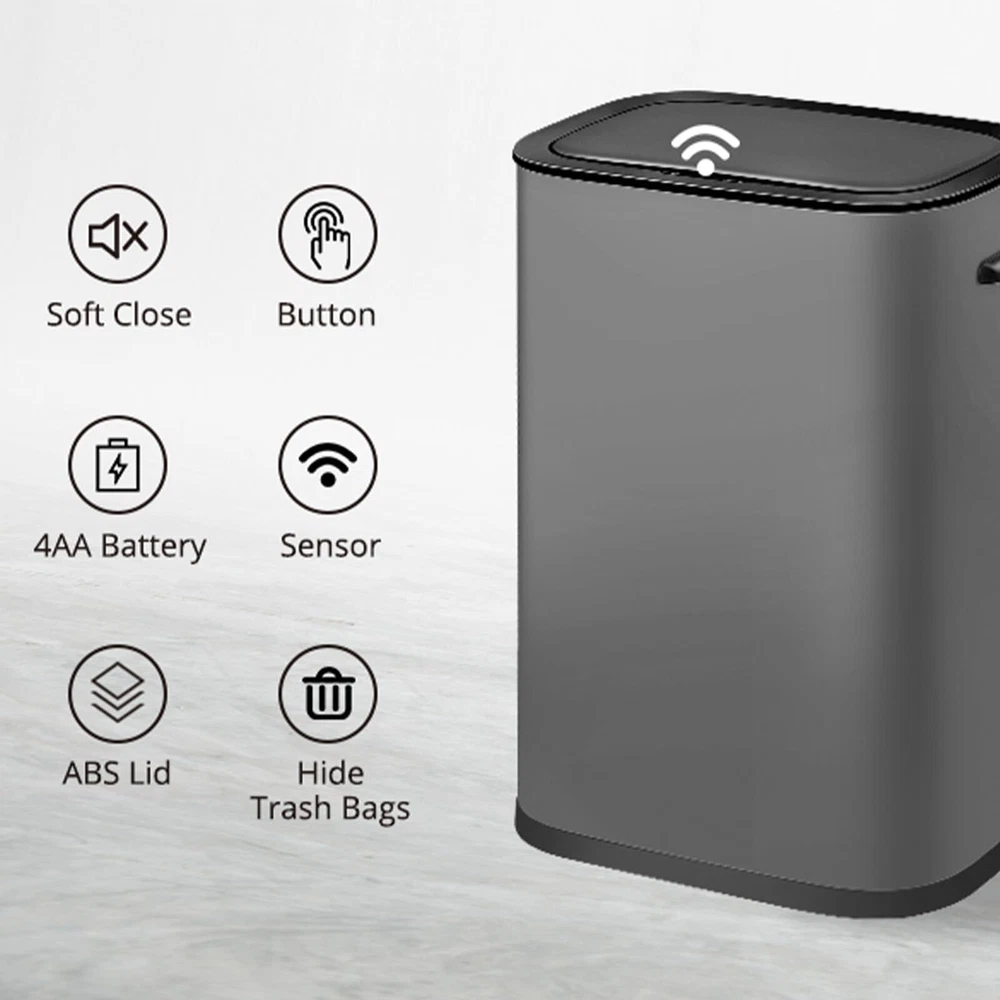 The automatic trash can is made of excellent plastic materials such as ABS+PP, durable and easy to clean. The touchless trash can used high technology induction device, it can respond quickly to open the lid of the trash can, and automatically close the lid within 6 seconds. The 14.5 Gallon (equal to 55 Liter) capability garbage bin can absolutely meet your daily need. Suitable for kitchen, living room, bedroom, and office or other various occasion. Touchless Trash Can: Our motion sensor trash can features an advanced automatic motion sensor that opens the lid automatically and closes it after 5 seconds of inactivity. Zero contact, free your hands. Manual Operation: This stainless steel trash can can also be manually operated to open the lid. If you need to keep the trash can open for a long time, you can manually press the button on the lid, and then close it manually after use. Durable and Long-lasting: Made from high-quality stainless steel, this kitchen garbage can will hold up against scratches, dents, and other wear and tear, resist damage from moisture, making it ideal for use in kitchen and bathroom. Easy to Use: The lid of the induction trash can is removable for putting in and taking out the garbage bags. The detachable bucket ring can fix the trash bag and prevent it from slipping easily due to the load. Battery Operated Trash Can: Please install the battery before using this sensor automatic trash can. The electric lid is powered by 4 AA batteries (not included). No need to worry about cords or outlets, it can be flexibly placed in kitchen, bedroom, bathroom and office.