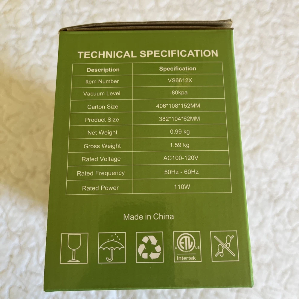 Power Source:ElectricType:Vacuum BagSeller Notes:“Box open item was never removed from box”Features:AutomaticColor:stainless steelComponents Included:Film Bag, CutterBrand:Beelicious ProModel:VS6612X