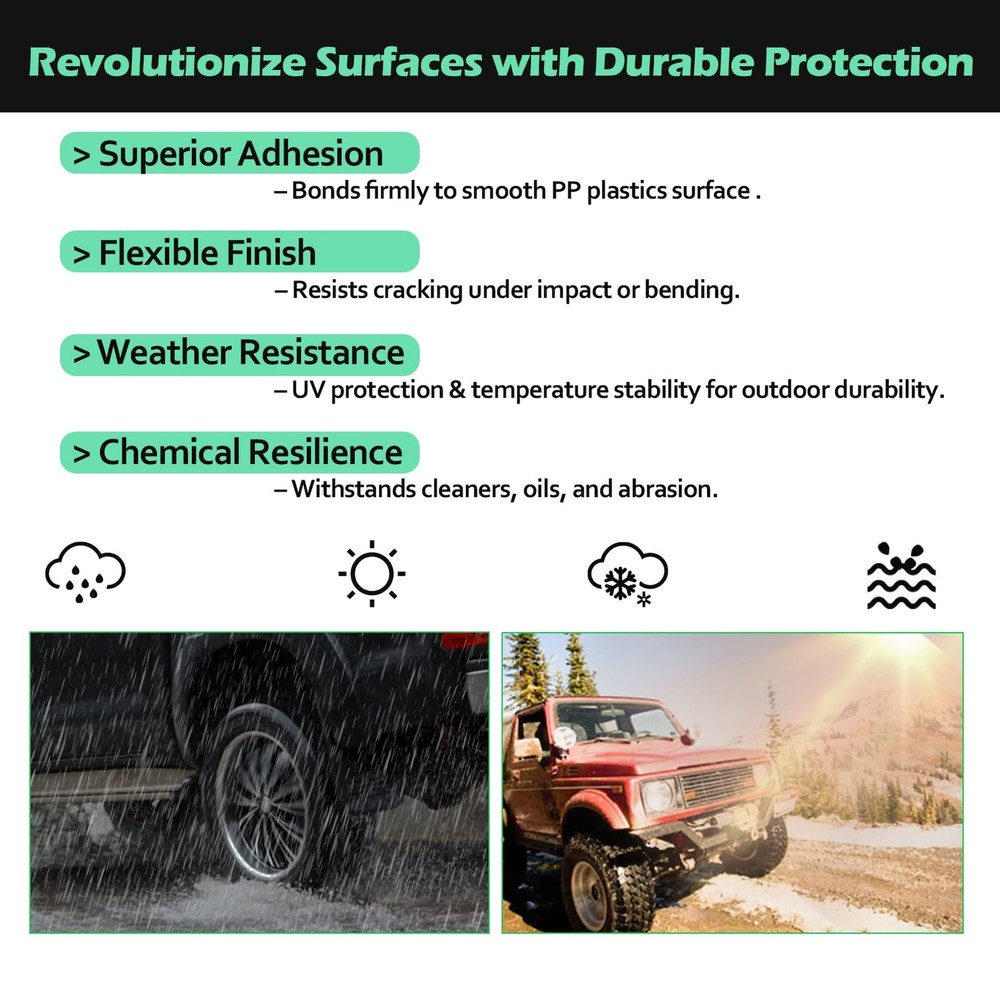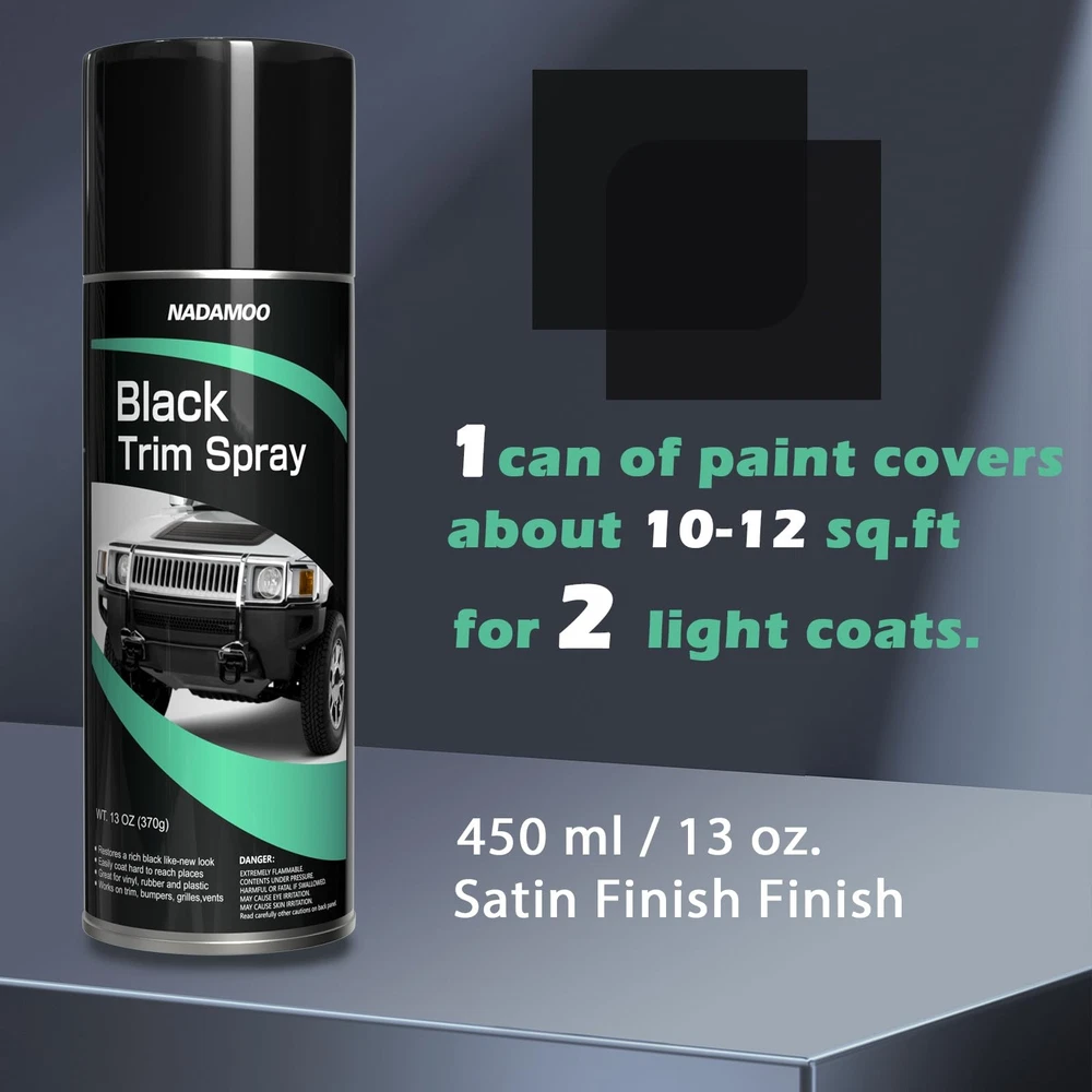 Automotive Black Trim Spray Paint Black, 2 Cans,370g / 450ml per can Multi-Surface Adhesion: Engineered to adhere flawlessly to rubber/ vinyl/ plastic surfaces. Whether you’r restoring a scratched car bumper, reviving faded patio furniture, or upgrading faded plastic appliances, this spray paint ensure the need for resilience finish. Professional-Grade Black Trim Spray Paint also bonds to metal, wood, ceramic, creating a seamless finish. Good Weather Resistance : Engineered for relentless outdoor durability.The UV-Resistant Black Paint survives -40°F to 150°F, prevents fading better than any normal black spray paint—crucial for car trims and outdoor furniture in sunbelt states. Good Chemical Resistance: The black coating forms a barrier that resists the detrimental effects of harsh chemicals, such as cleaners, oils, salt, and acidic contaminants. This ensures that the car bumper and outdoor patio furniture remain unscathed and retain their pristine condition even in challenging environments. Effortless Application: Spray application is perfect for Beginner DIYers—no tools needed! It not only eliminates drips and streaks, but also has the ability to cover hard to reach areas. Ideal to coat tight spaces like bike frames and car radiator grilles without awkward hand angles. 2 Cans;Color:Satin Finish Black;13 oz/ 450ml per can;1 can of paint covers about 10-12 sq.ft area for 2 light coat;
