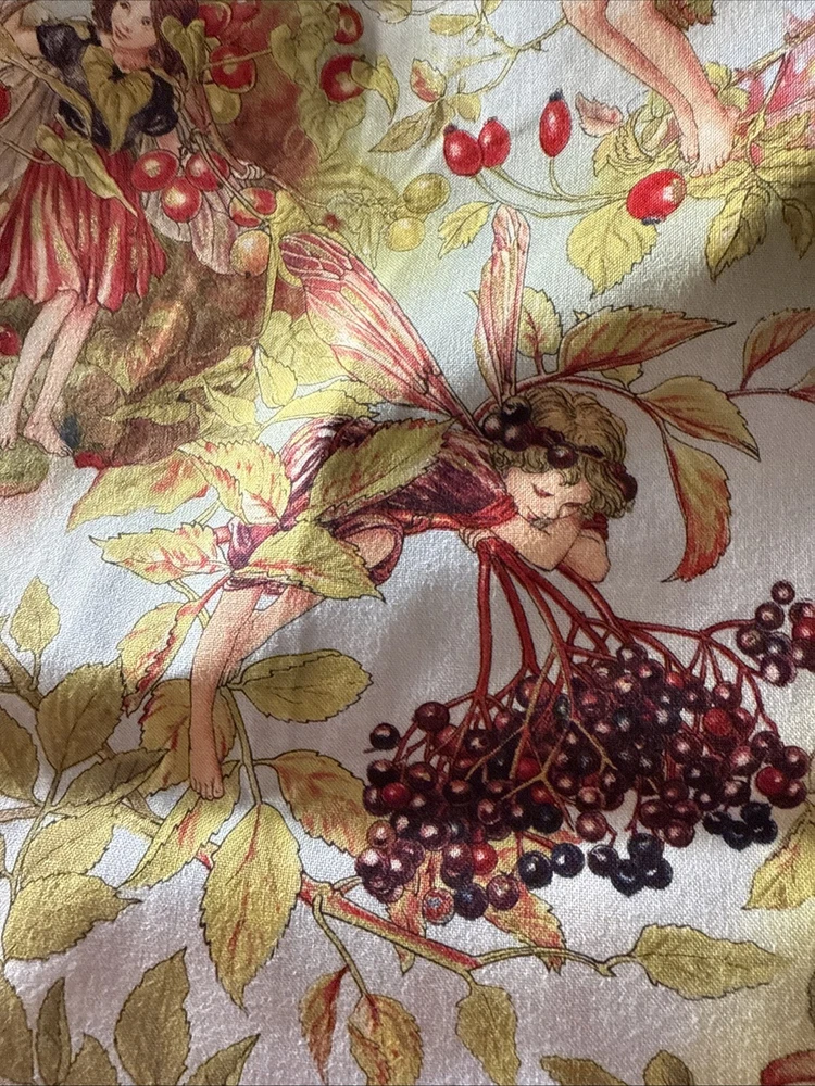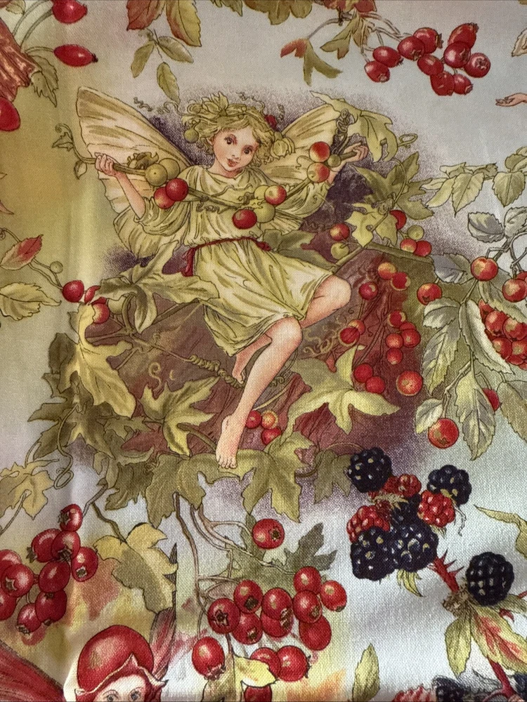 2008. Brand New DM 3989 Autumn Fairies FLOWER FAIRIES by Cicely Mary Barker -Michael Miller Fabrics this one piece fabric measures 42” wide x 37” long Very light lavender background with overall colorful fruits So pretty!! Excellent for any project See my other related items at auction now Can combine shipping
