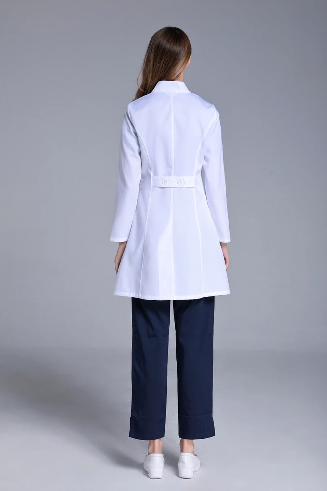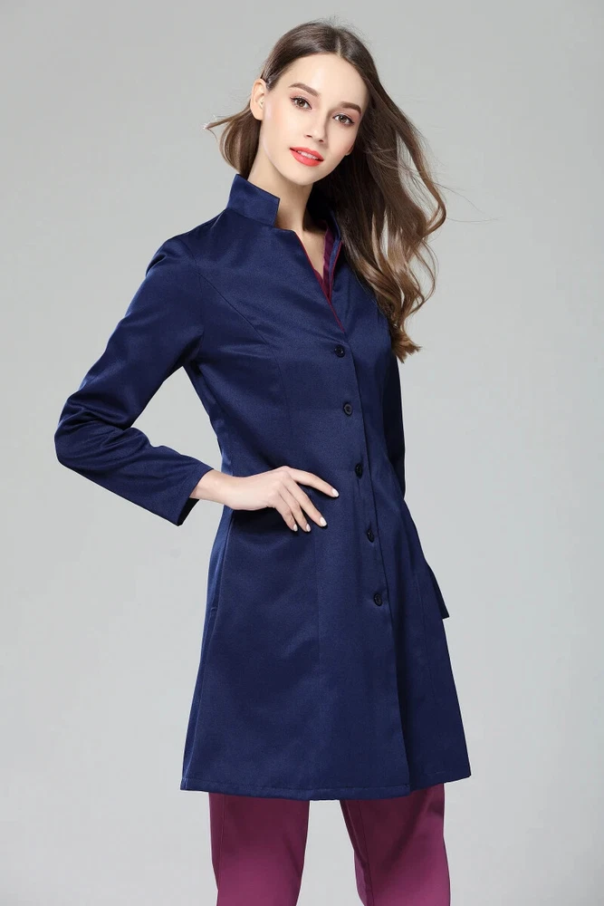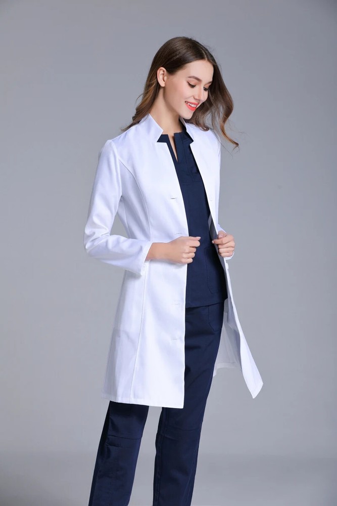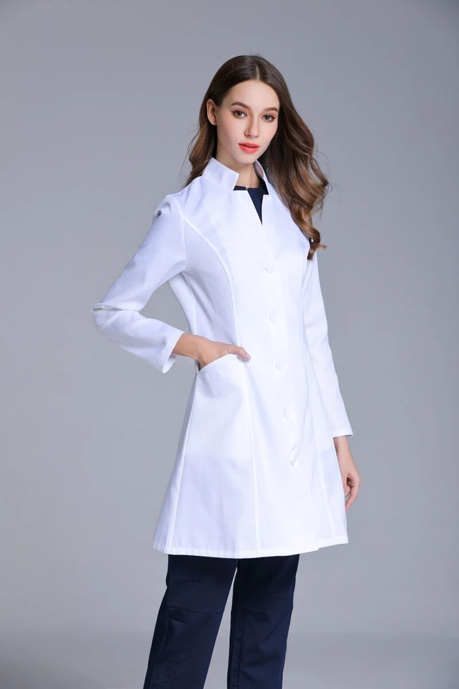 Product description Women white lab coat ,stand collar ,slim fit , high quality , anti wrinkle Application: widely used in medical shcool ,hospital,dental clinic Color: white,dark navy Material: 65/35 polyester/cotton twill Inner Lining: no inner lining Applied seasons: All seasons Features: 1) washable 2) Good quality and sewing 3) White collar 4) Princess seam to keep fit slim Uniform size spec as below : (Model 175CM 48KGS , bust/waist/hip=84/61/84CM , wearing size "S") Uniform is Asia size slim fit . Buyer need buyer one size larger than normal. Uniform size spec ad below : Model wearing appearance : White: Dark navy(new color):