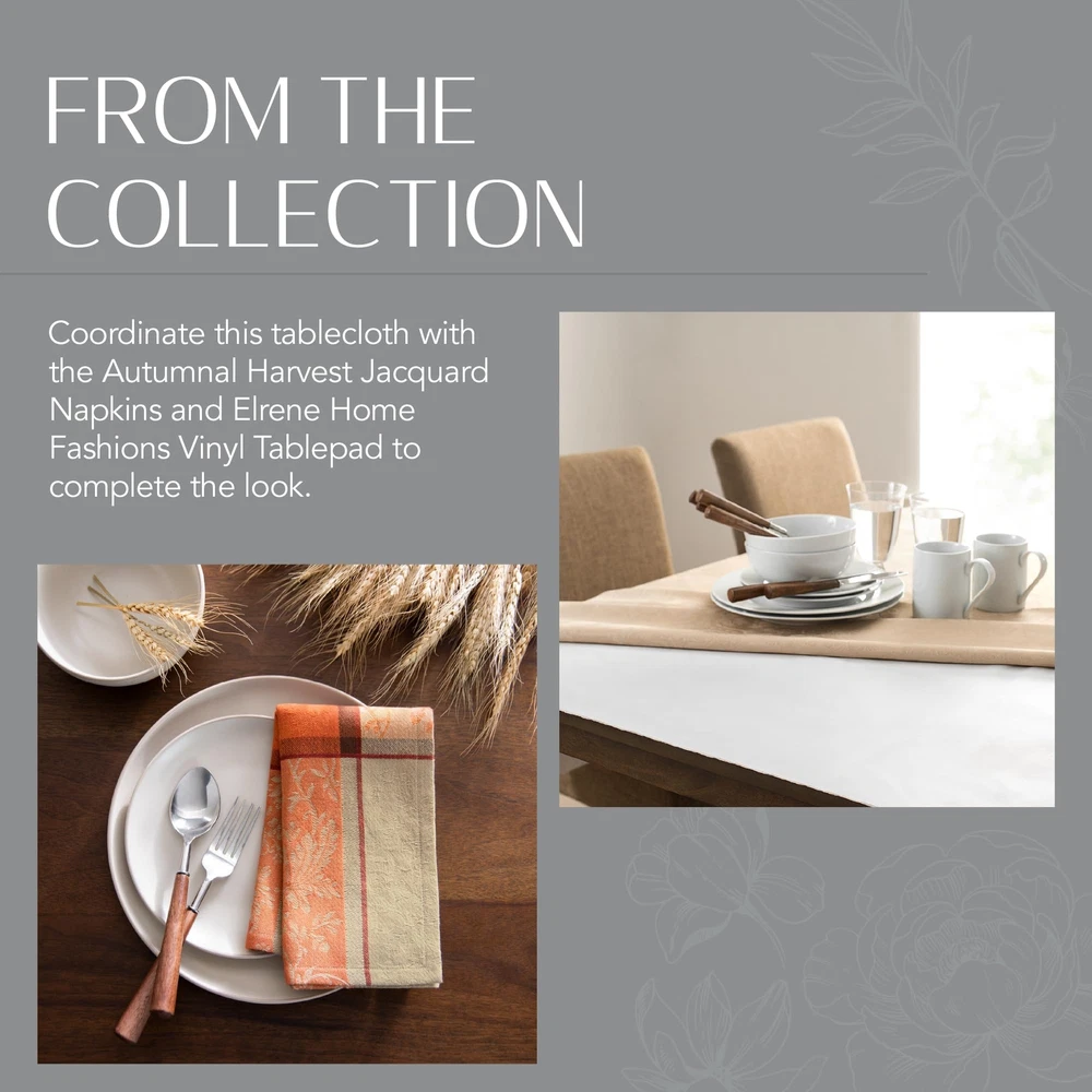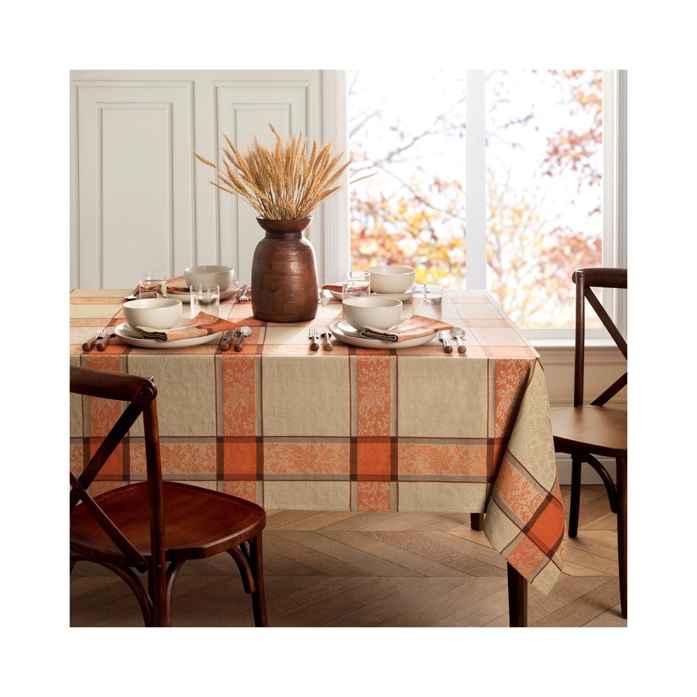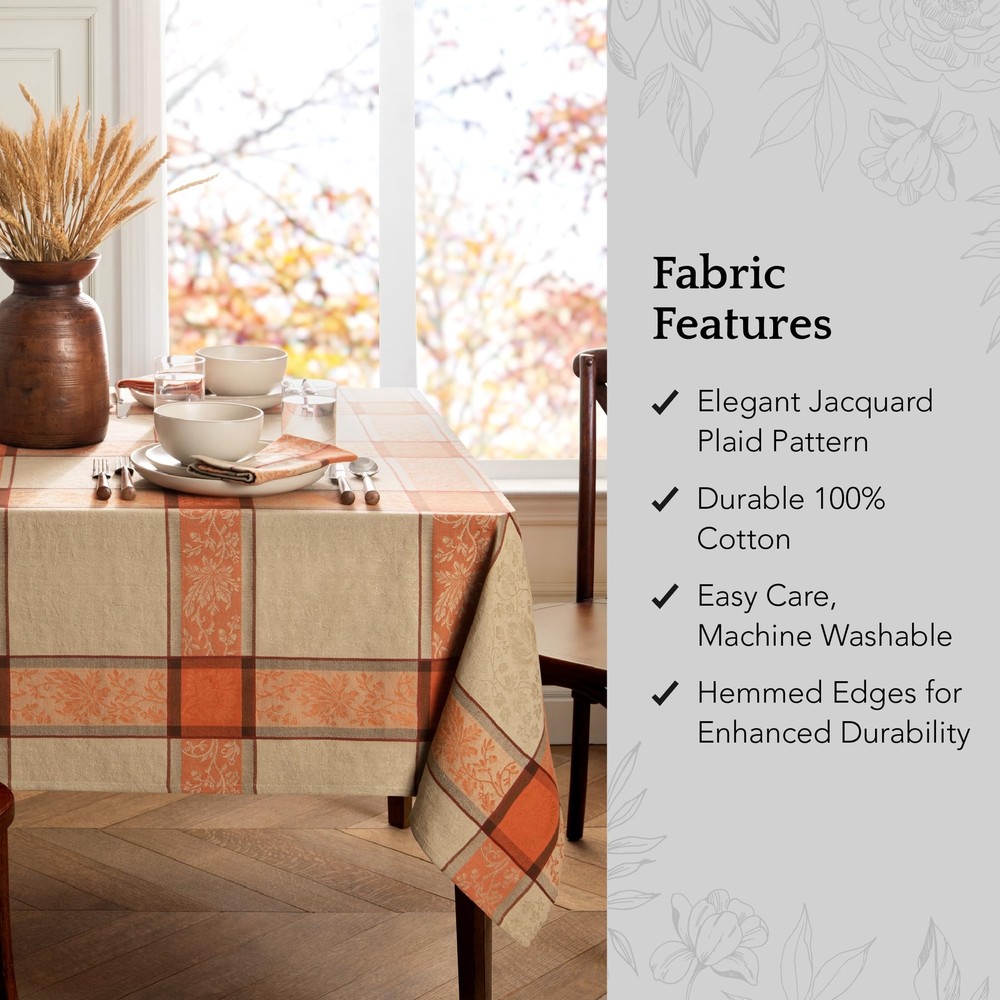 Share a meal in elegant fashion with family and friends featuring our Autumnal Harvest Jacquard Tablecloth. Perfect for harvest holiday gatherings, as an everyday table covering, or as a fall banquet tablecloth, this festive dining table cover is sure to impress guests and family alike. Pair it with our matching napkins (sold separately) to add a touch of seasonal harvest fashion and rustic elegance to your table. This ivory-and-orange tablecloth is made from 100% cotton and has a delicately hemmed edge for a polished look and added durability. Our Thanksgiving tablecloth has a wonderful texture and enough weight to lie perfectly centered on your table. It features a plaid print with lovely autumn colors, including orange, brown, and ivory. It’s available in a variety of shapes, including rectangle, oval, and round, so you’re sure to find the perfect fit for your table. To keep this cloth table cover looking amazing, simply machine wash it. It can also be ironed to remove any stubborn creases. It’s a lovely way to add a little fashion to your home. Established in 1922, Home Fashions was founded on the principles of quality and guaranteed satisfaction. With the help of our expert artists and designers, we produce high-quality, fashionable home decor for every home and decorating palate. We are 100% committed to our customers and strive to give the very best in all of our products. ELEGANT HARVEST TABLECLOTH: Whether you use our fall tablecloth for an autumn party or a family dinner, it’s sure to add a touch of color, beauty, and design to any fall tablescape. VERSATILE PLAID DESIGN: Enjoy gathering to make memories with our fabric tablecloth. This lovely autumn-colored patterned tablecloth is available as a round, oval, or rectangular tablecloth. PREMIUM JACQUARD WEAVE: Our Autumn Harvest Jacquard Tablecloth comes in a variety of sizes and features a stunning jacquard weave and intricate plaid pattern that adds a touch of rustic charm and elegance to your kitchen or dining space. DURABLE COTTON FABRIC: Made from 100% durable cotton, this tablecloth offers exceptional longevity, ensuring it remains a staple in your seasonal decor for years to come, while also being easy to clean and maintain. Machine washable and hang dry. FOUR GENERATIONS OF QUALITY & FASHION: Home Fashions has been designing and producing high-quality home decor since 1922. Committed to quality and design, we specialize in creating products that seamlessly blend functionality with elegance.