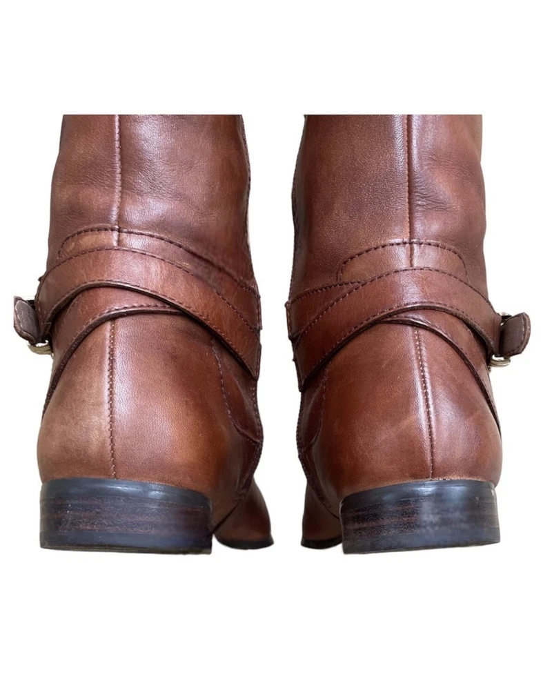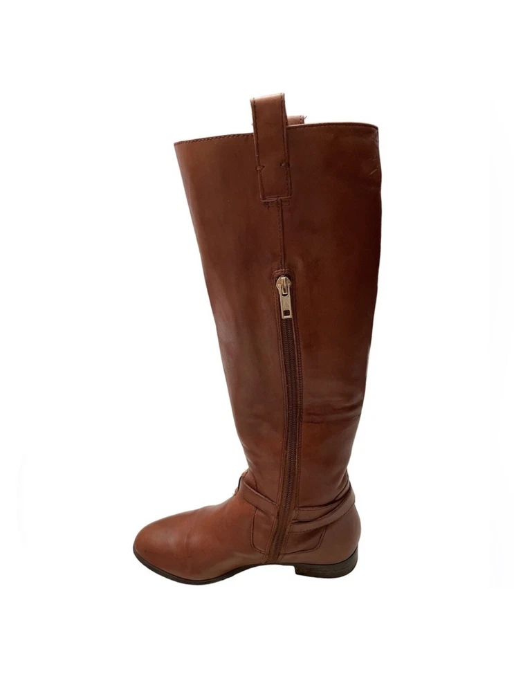 Ava & Aiden All Leather Brown Zippered Knee High Fashion Riding Boots Sz 6 Step out in style with these Ava & Aiden knee-high boots. The classic riding boot design features a rich chestnut brown leather upper with an almond toe shape and flat heel. The side zipper and buckle strap accents add a touch of edginess and make them easy to slip on and off. Perfect for any occasion, whether you're dressing up for a party, staying casual for a day out, or dressing for work, these boots are a versatile addition to any wardrobe. The arch support and ankle strap make them comfortable for all-day wear, while the leather upper provides durability. Available in women's size 6. Note wear on the inner lining. This does not show and does not affect wearability of the boot. See photos.