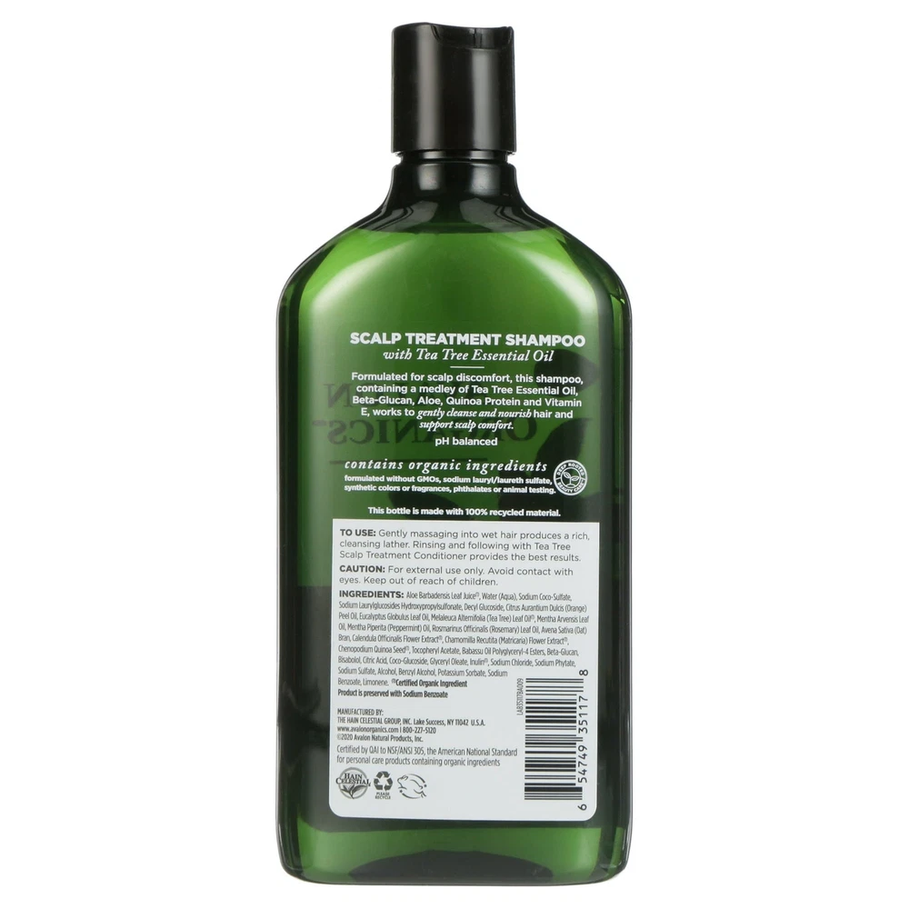 Avalon Organics Scalp Hair Treatment Shampoo Tea Tree, 11 oz (6 Pack) Avalon Organics Scalp Treatment Tea Tree Shampoo. Made with plant-sourced botanicals and essential oils, this certified organic formula balances moisture levels and soothes irritation. Tea tree essential oil, beta-glucan, aloe, quinoa protein and vitamin E work together to condition and seal the hair cuticle for strong, shiny hair and lasting scalp comfort. About this item Scalp Treatment: This shampoo cleanses hair and scalp while encouraging scalp well-being. It leaves hair soft and healthy-looking Thoughtfully Made: Comprised with a medley of Tea Tree Essential Oil, Beta-Glucan, Aloe, Quinoa Protein, and Vitamin E, our signature botanicals are carefully curated to help your hair thrive Formulated Without: This shampoo is packaged in a 100% recycled bottle and is formulated without parabens, sodium laureth sulfate, synthetic colors, or synthetic fragrances Certifications: All our products are cruelty-free and Leaping Bunny Certified, providing assurance of no animal testing. This shampoo is NSF Certified as a personal care product containing organic ingredients EWG Verified: The Environmental Working Group VERIFIED mark on a product confirms it's free from EWG's chemicals of concern and meets the EWG’s strictest standards for your wellbeing No GMOS, parabens, sulfates, synthetic colors or fragrances, phthalates, or animal testing NSF certified Biodegradable Adult Use Ingredients Aloe Barbadensis Leaf Juice, Water (Aqua), Sodium Coco-sulfate, Sodium Laurylglucosides Hydroxypropylsulfonate, Decyl Glucoside, Citrus Aurantium Dulcis (Orange) Peel Oil, Eucalyptus Globulus Leaf Oil, Melaleuca Alternifolia (Tea Tree) Leaf Oil, Mentha Arvensis Leaf Oil, Mentha Piperita (Peppermint) Oil, Rosmarinus Officinalis (Rosemary) Leaf Oil, Avena Sativa (Oat) Bran, Calendula Officinalis Flower Extract, Chamomilla Recutita (Matricaria) Flower Extract, Chenopodium Quinoa Seed, Tocopheryl Acetate, Babassu Oil Polyglyceryl-4 Esters, Beta-glucan, Bisabolol, Citric Acid, Coco-glucoside, Glyceryl Oleate, Inulin, Sodium Chloride, Sodium Phytate, Sodium Sulfate, Alcohol, Benzyl Alcohol, Potassium Sorbate, Sodium Benzoate, Limonene