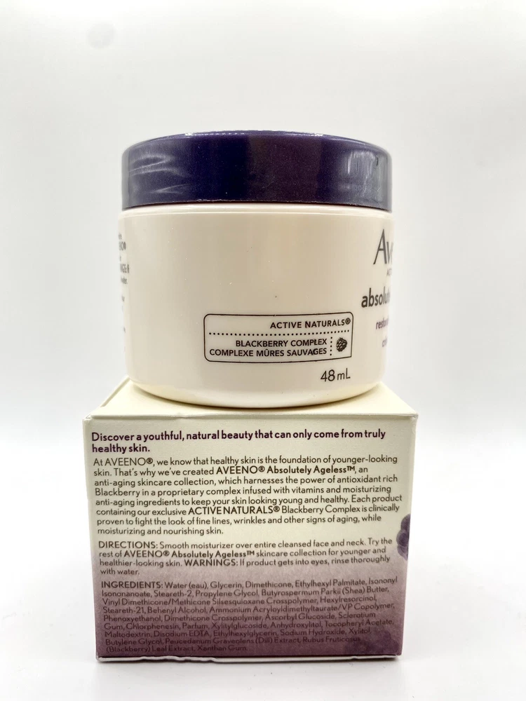 Volume: 1.7 fl oz GTIN: 0381371163779 Features: Oil-Free, Animal Cruelty-Free, Hypoallergenic, Non-Comedogenic, Contains Minerals, Contains Vitamins Type: Night Treatment Main Purpose: Hydration, Wrinkles, Age-Defying Active Ingredients: Prebiotic oat, Feverfew Weight: 0.1lbs. gtin13: 0381371163779 MPN: AVO16377 Department: Women Ingredients: Vitamin E, Blackberry Complex, Vitamin C Body Area: Neck, Face Scent: Blackberry Size: Regular Skin Type: All Skin Types Brand: Aveeno UPC: 0381371163779 Formulation: Cream